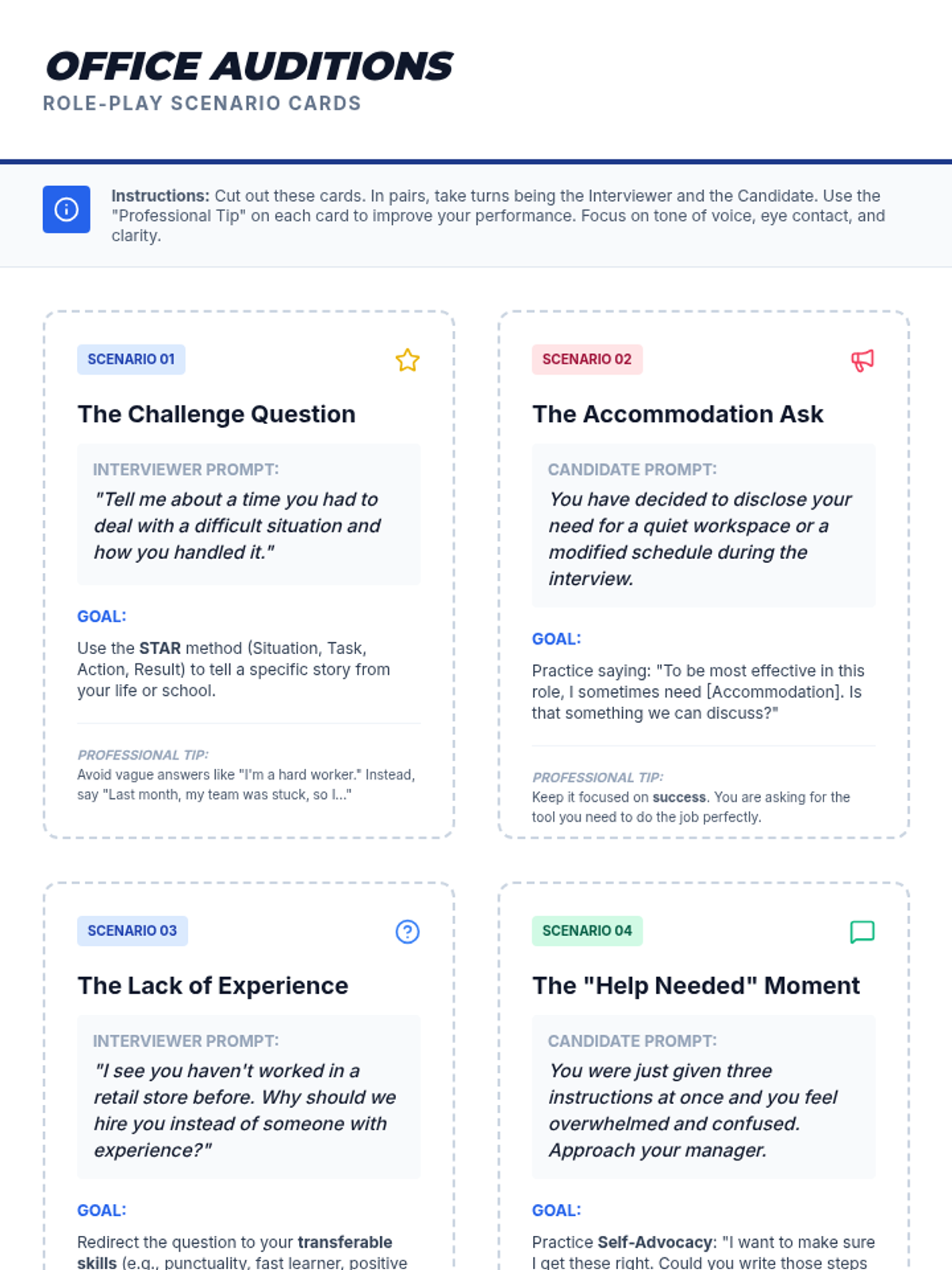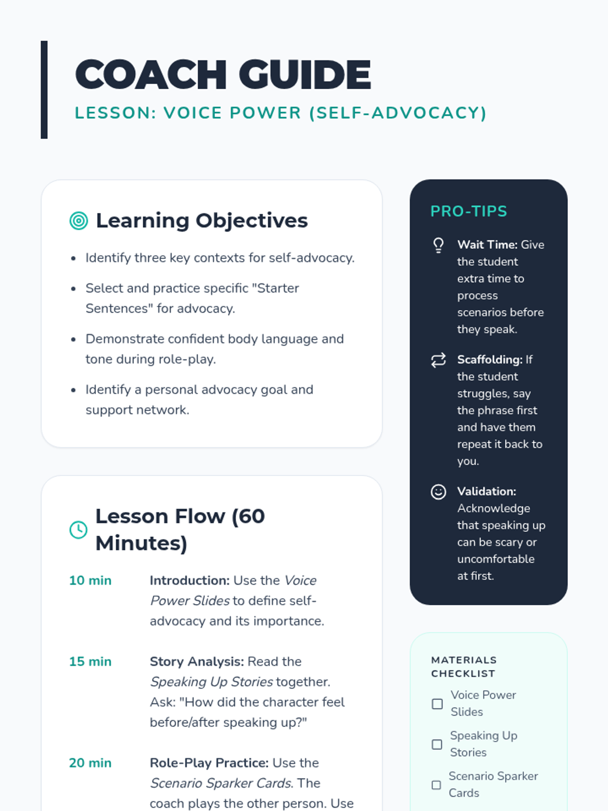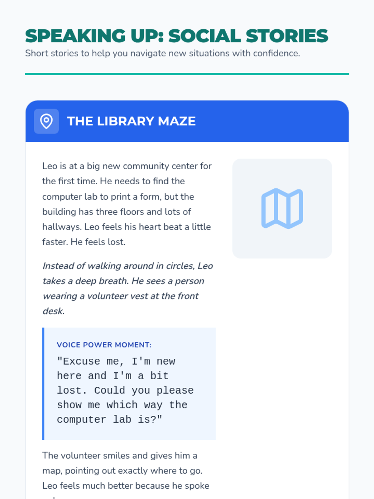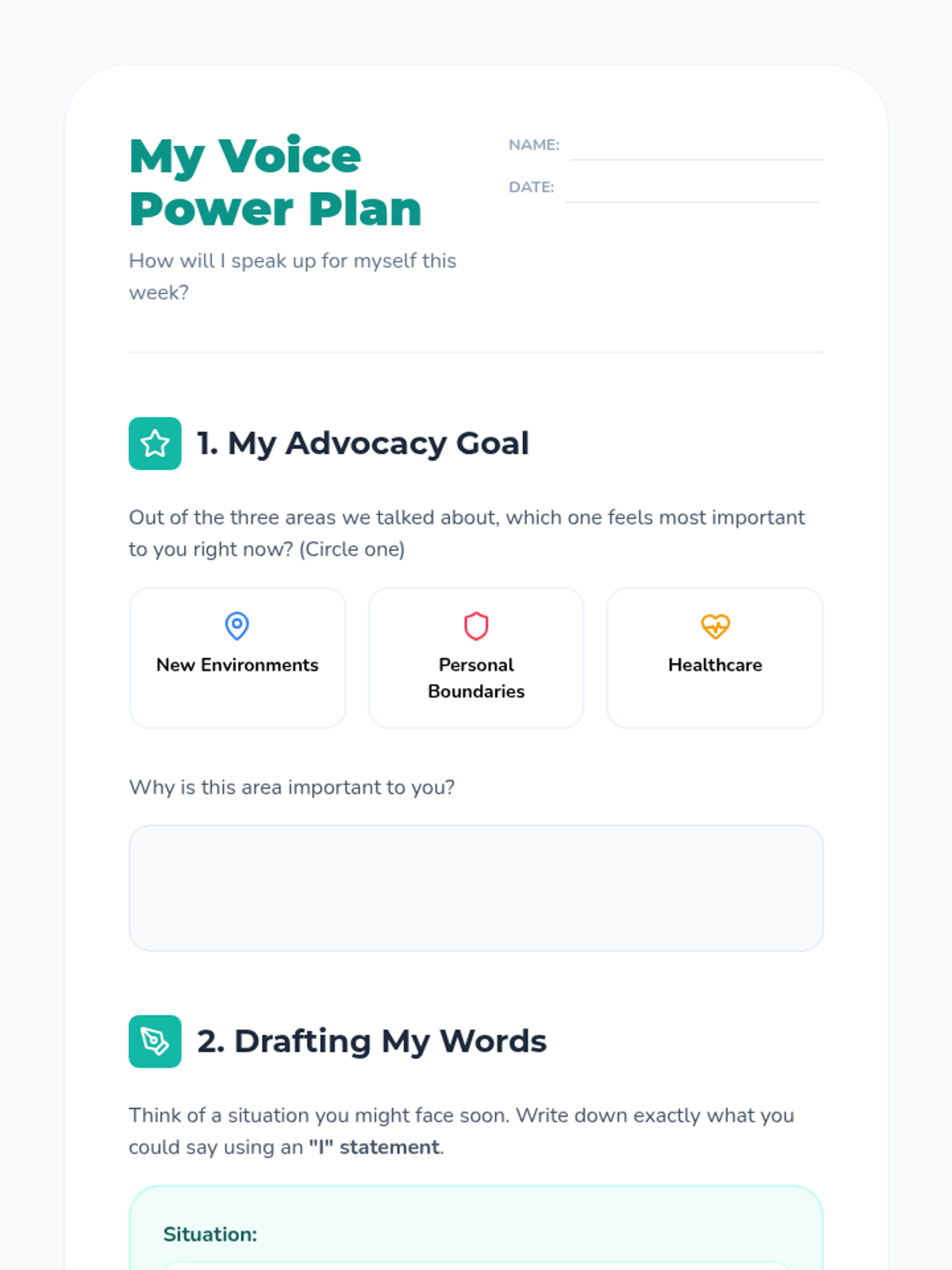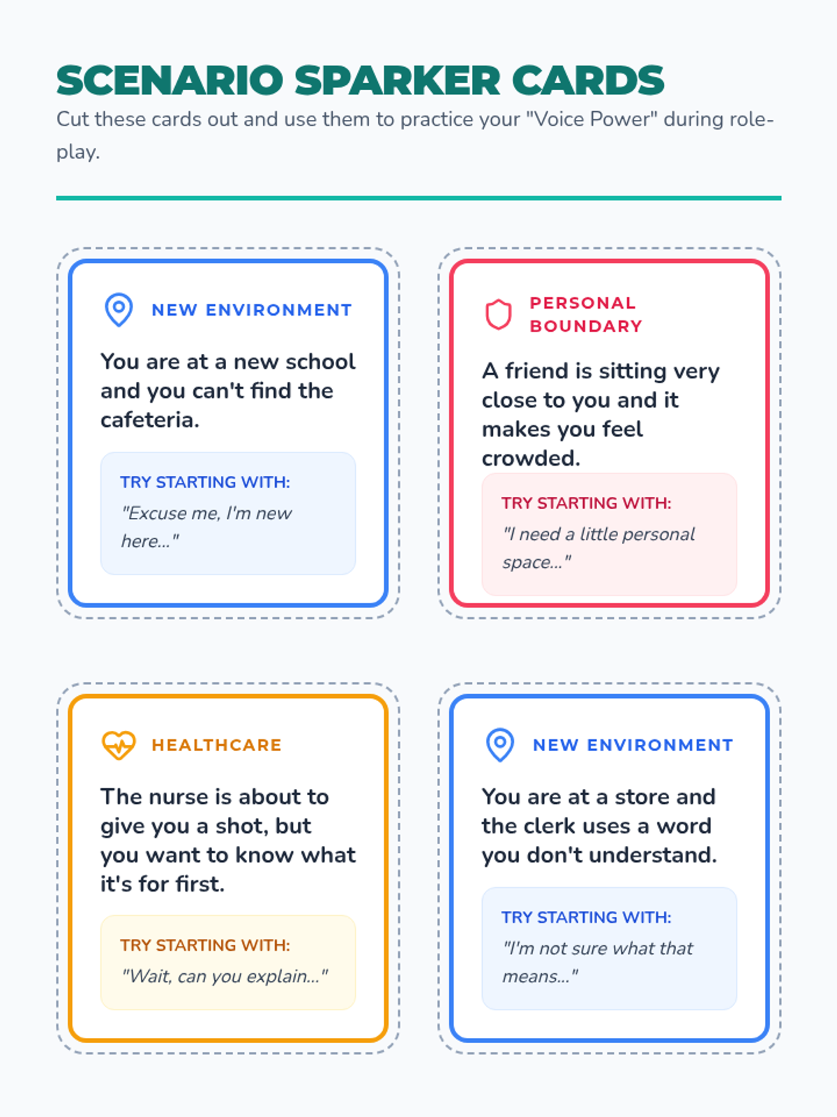 A one-on-one lesson designed to empower students with self-advocacy skills, focusing on communicating needs in healthcare, setting personal boundaries, and navigating new environments.