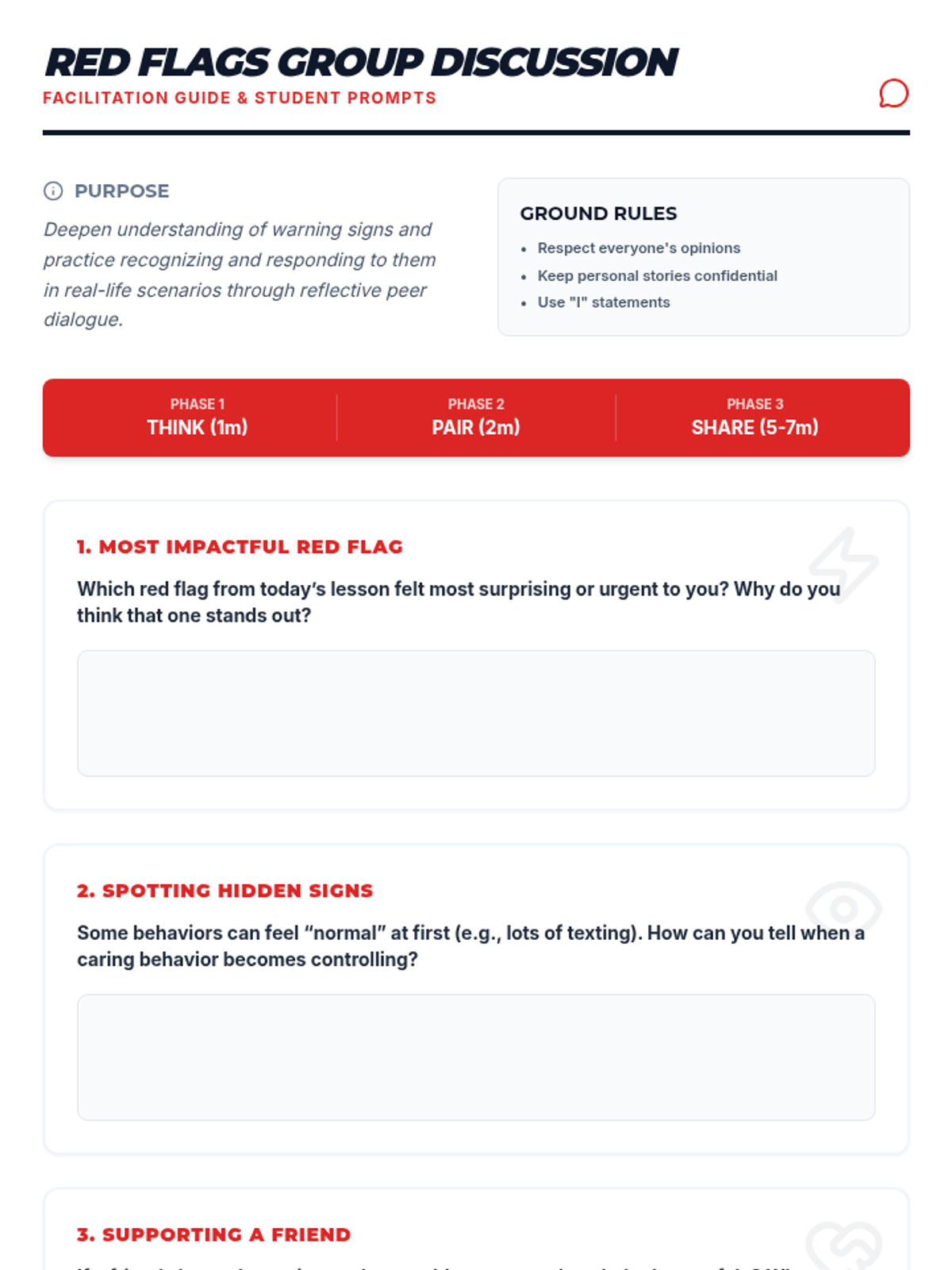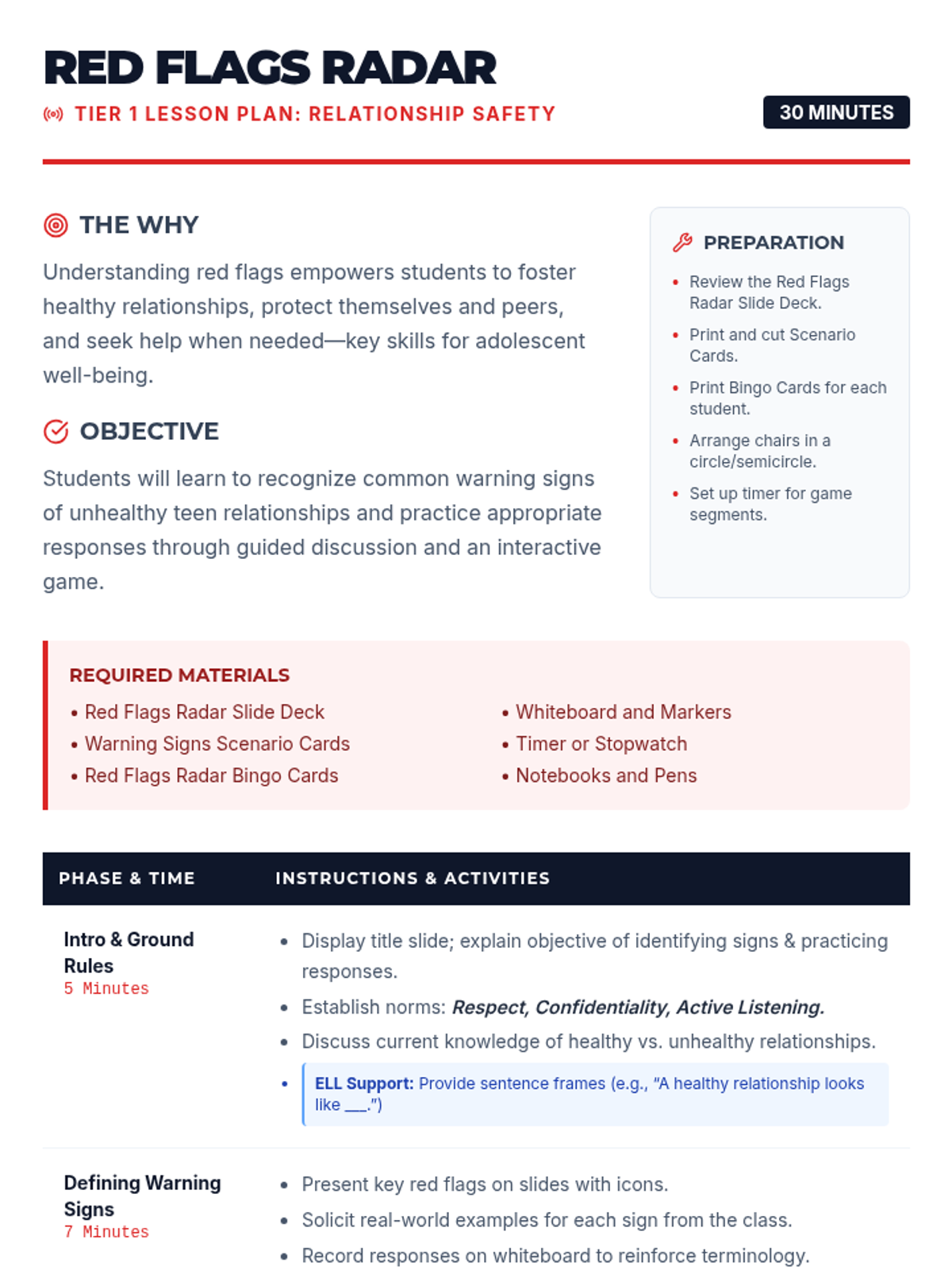 A 30-minute Tier 1 lesson designed to help high school students identify red flags in dating relationships and develop safe, respectful response strategies.