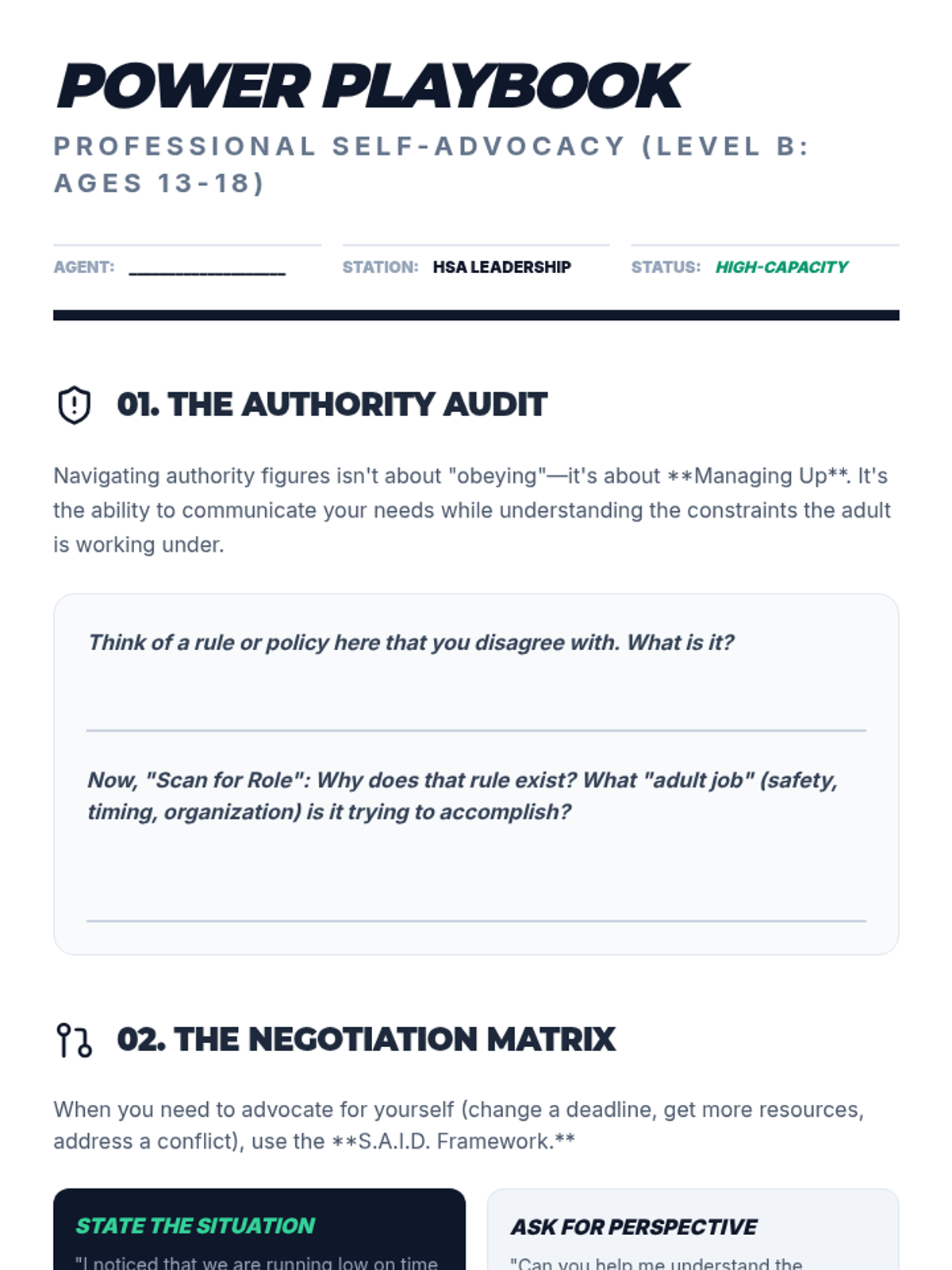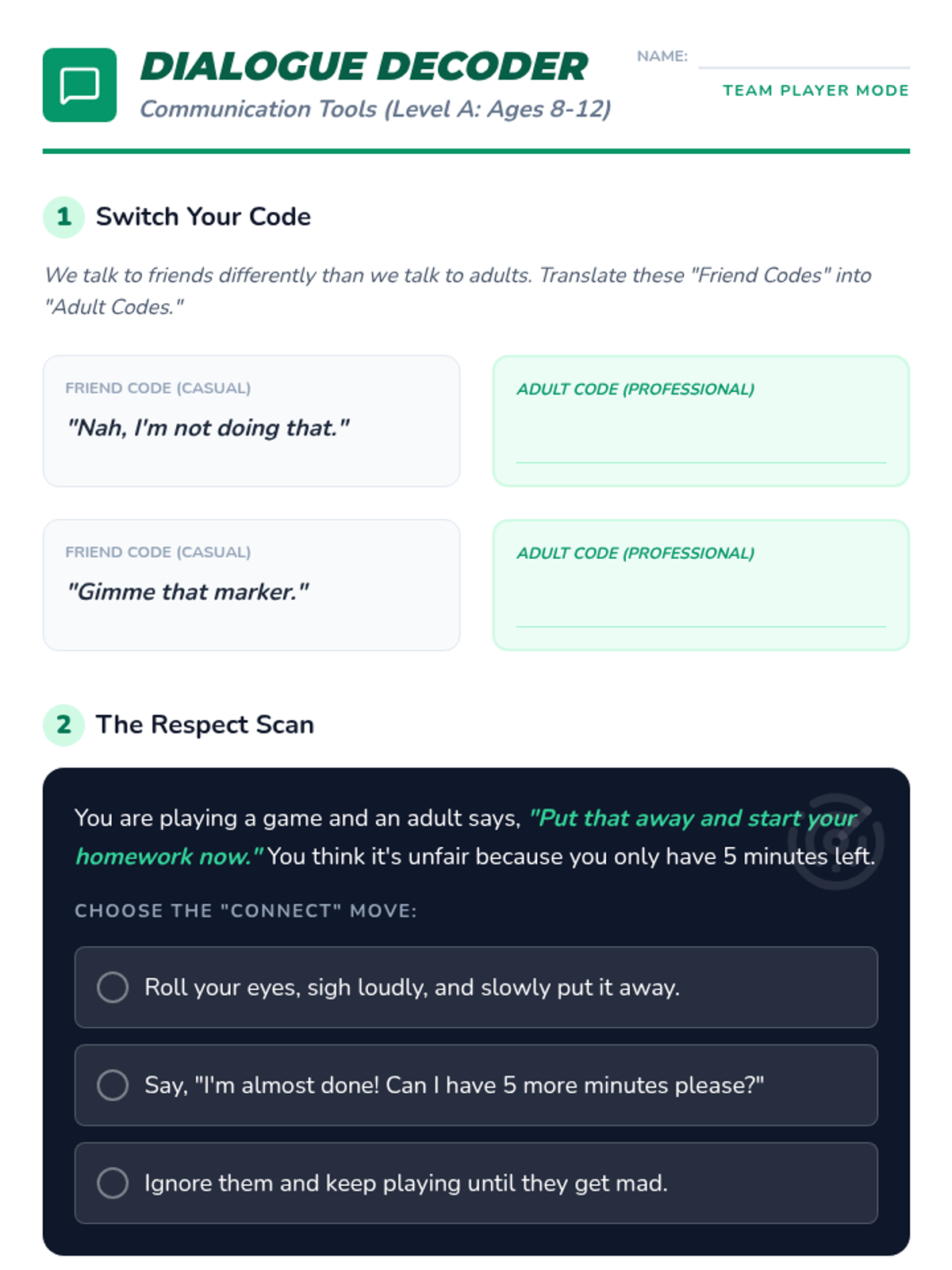 Explores the nuance of respect and communication across different contexts. Students learn to navigate authority figures with agency and self-advocacy, using specific communication tools to bridge the gap between their needs and adult expectations.