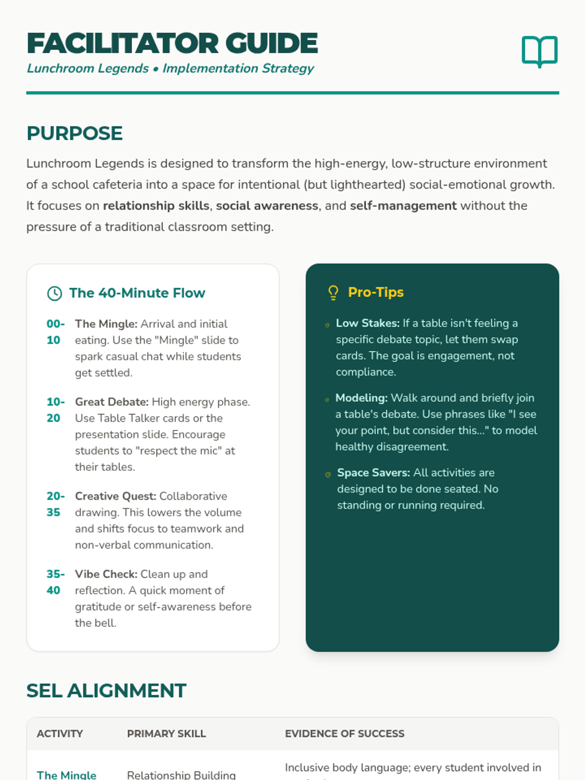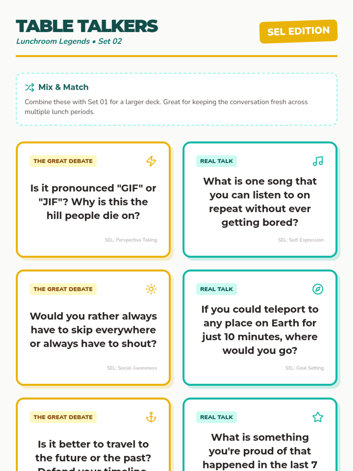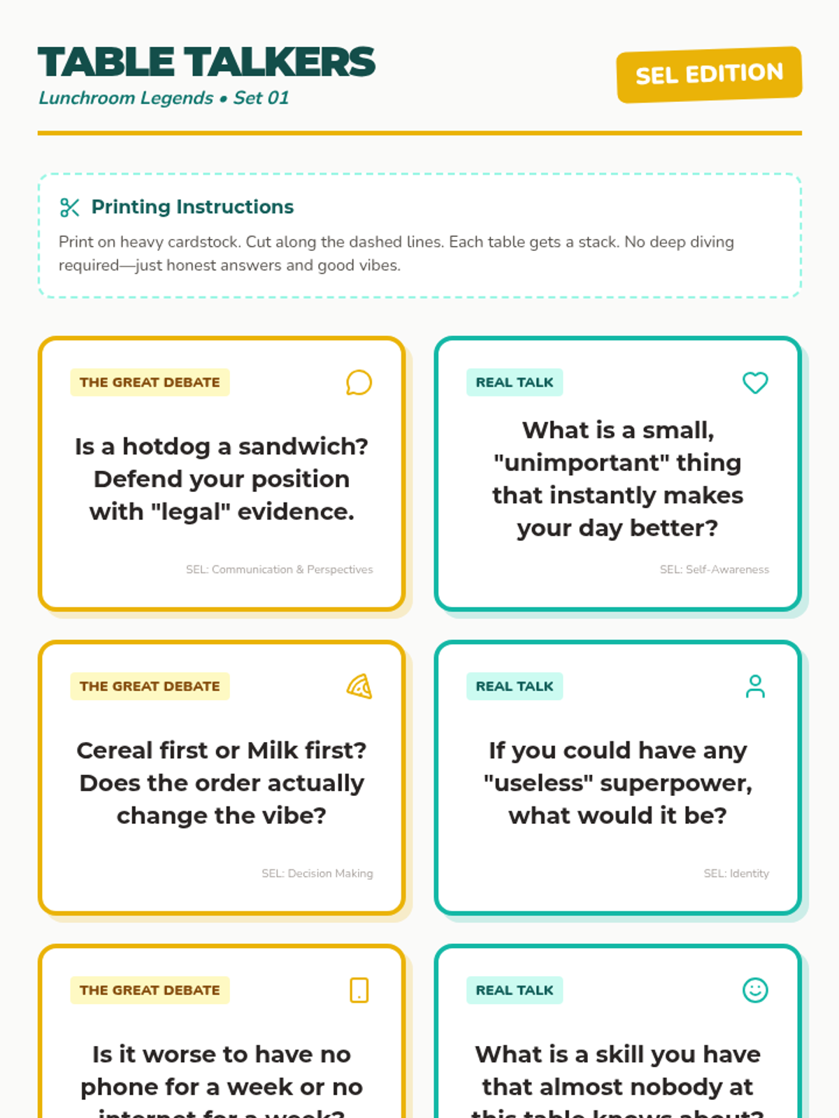 A collection of low-prep, high-engagement lunchtime activities designed for middle and high schoolers to build social-emotional skills in confined spaces. Activities focus on lighthearted debate, creative collaboration, and quick self-reflection.