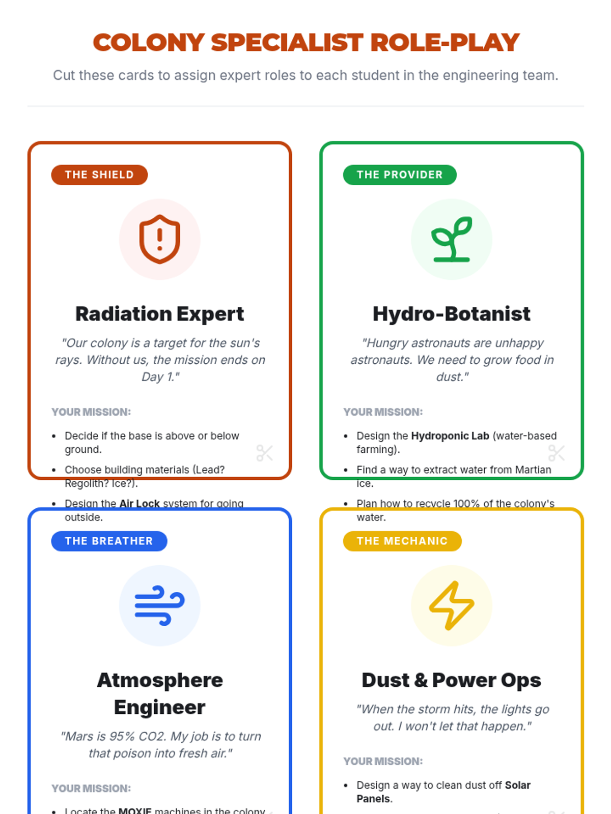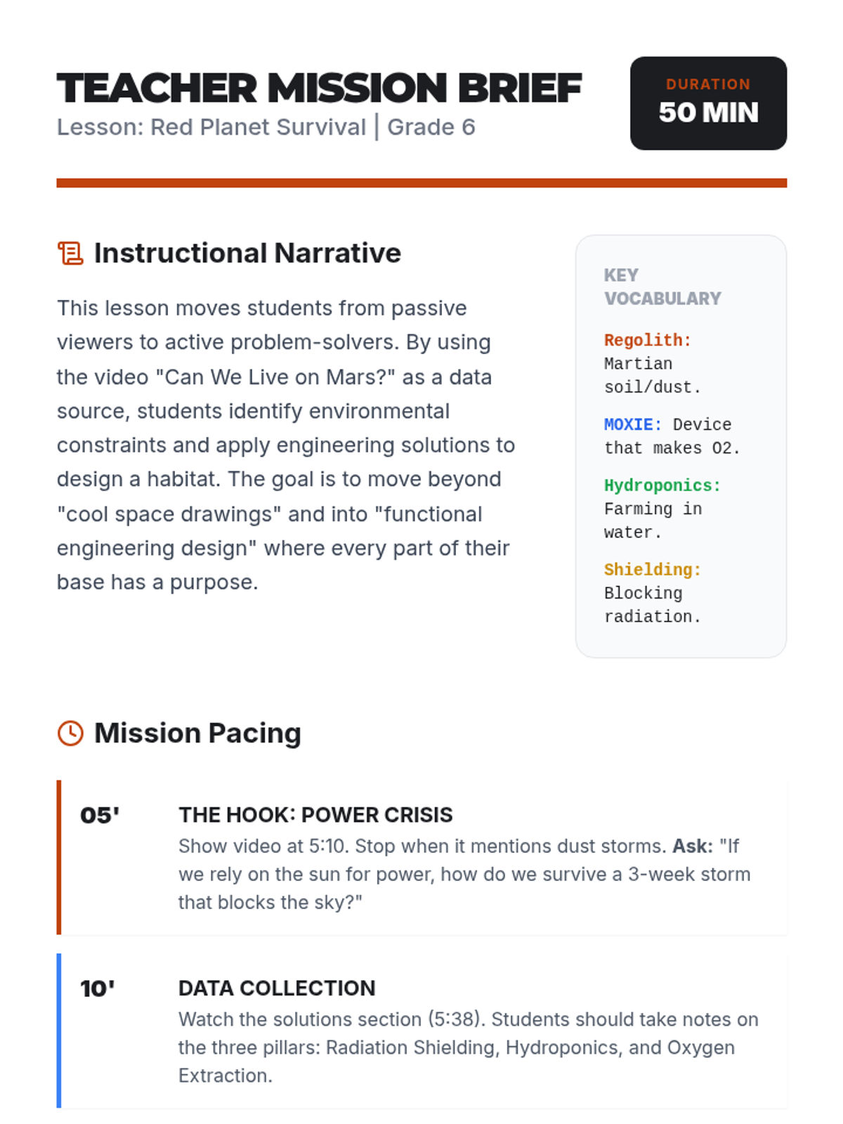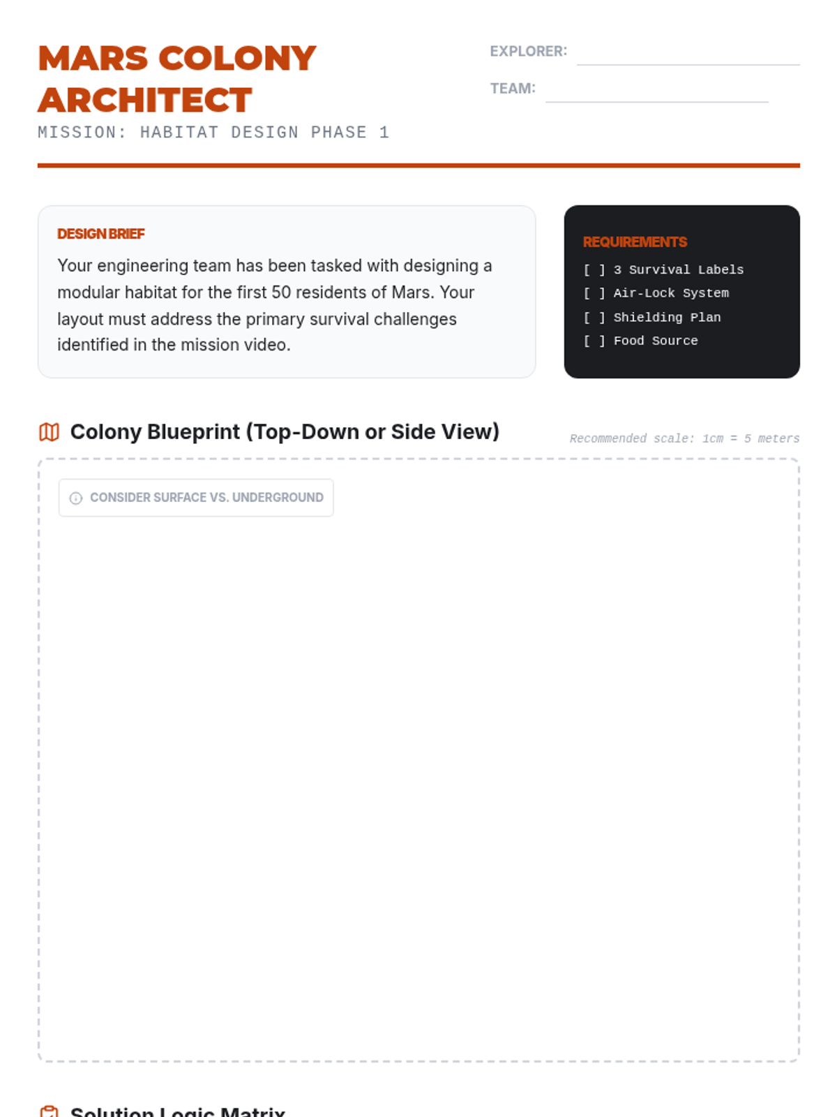 Students apply the engineering design process to design a sustainable Mars colony, focusing on solving challenges like radiation, food production, and oxygen supply identified in the video 'Can We Live on Mars?'.