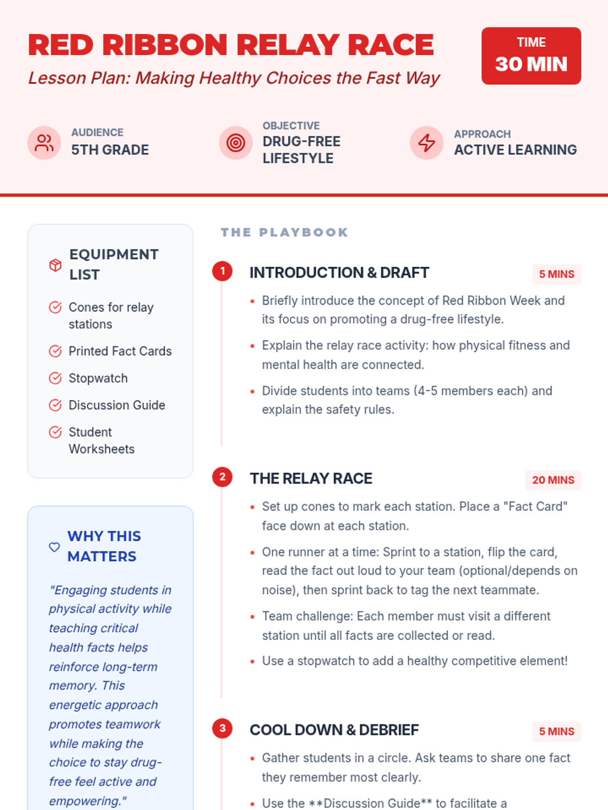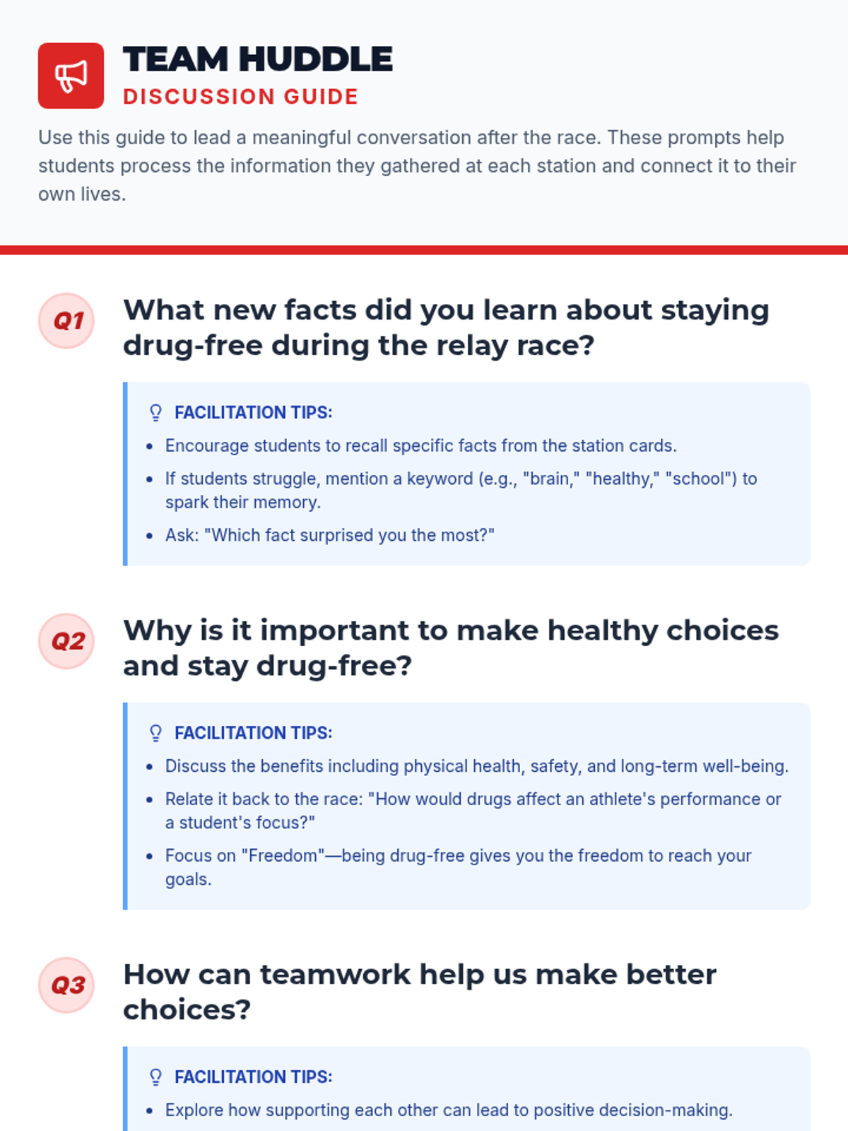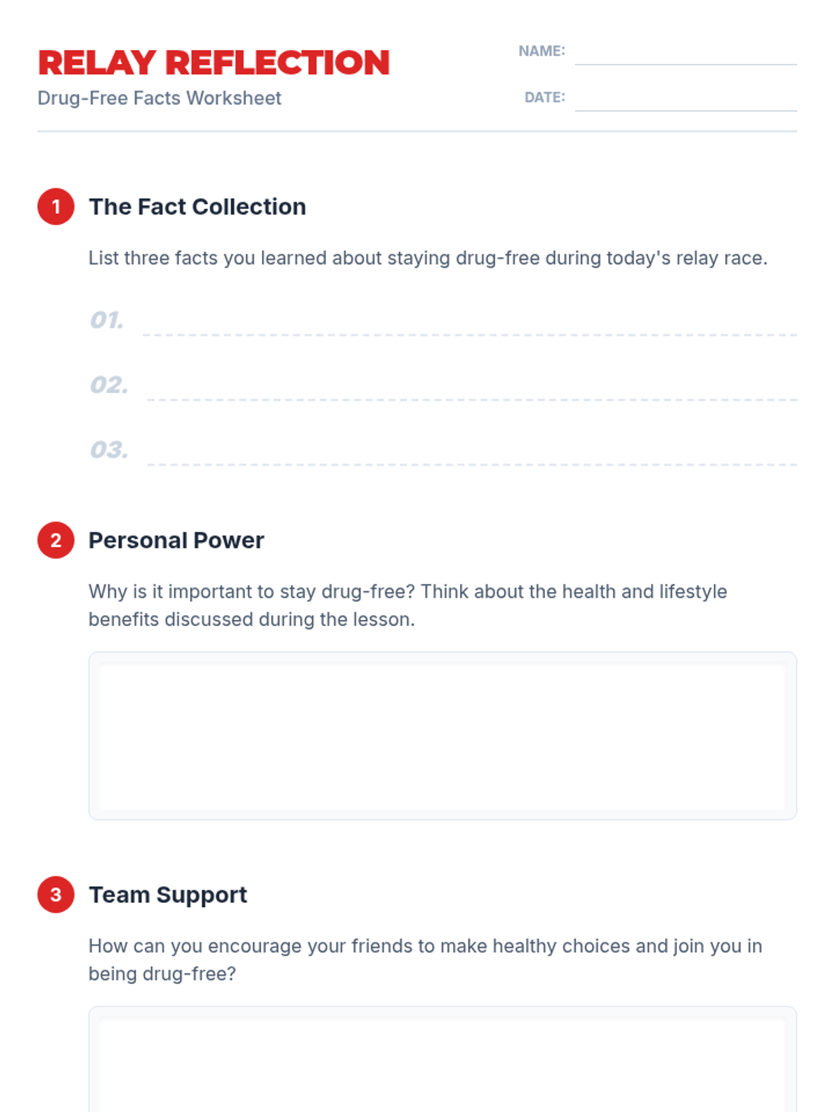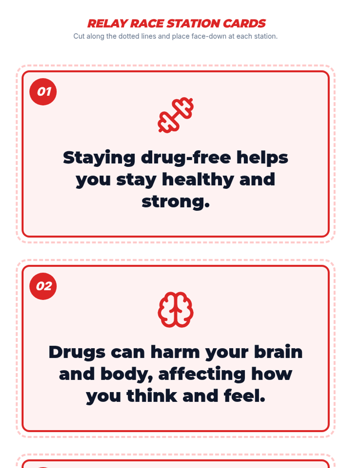 Students participate in an energetic relay race where they learn and reinforce drug-free facts at various stations, promoting teamwork and healthy lifestyle choices.