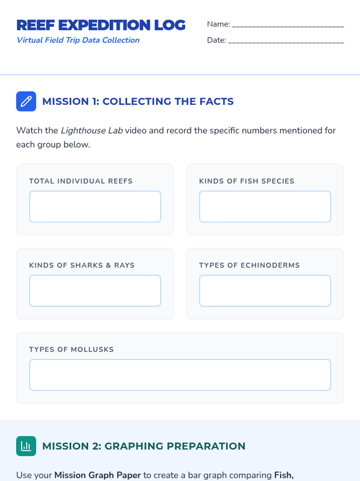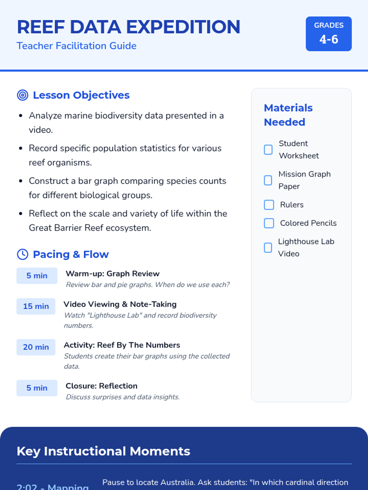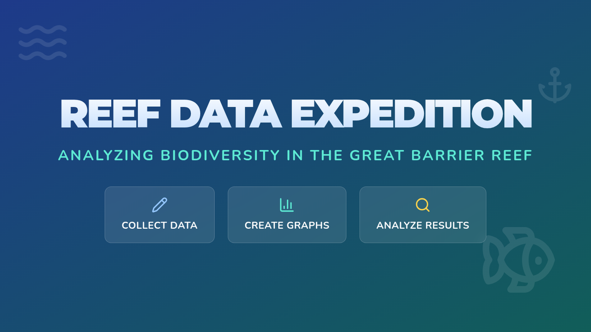 Students explore the Great Barrier Reef through a virtual field trip video, collecting biodiversity data to create bar graphs and analyzing the relative populations of different marine groups.
