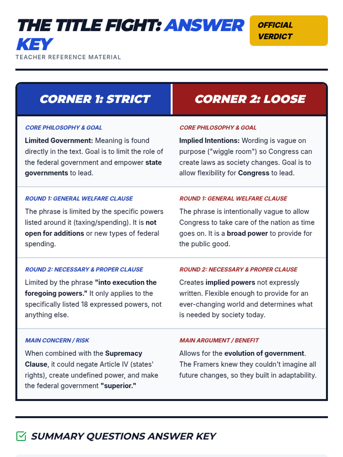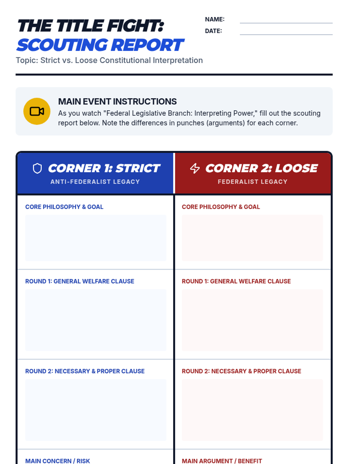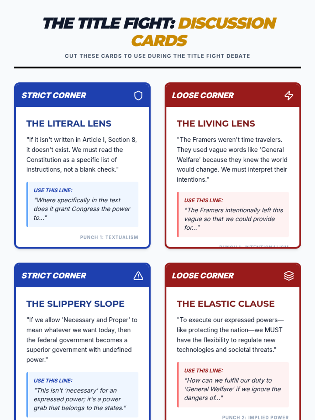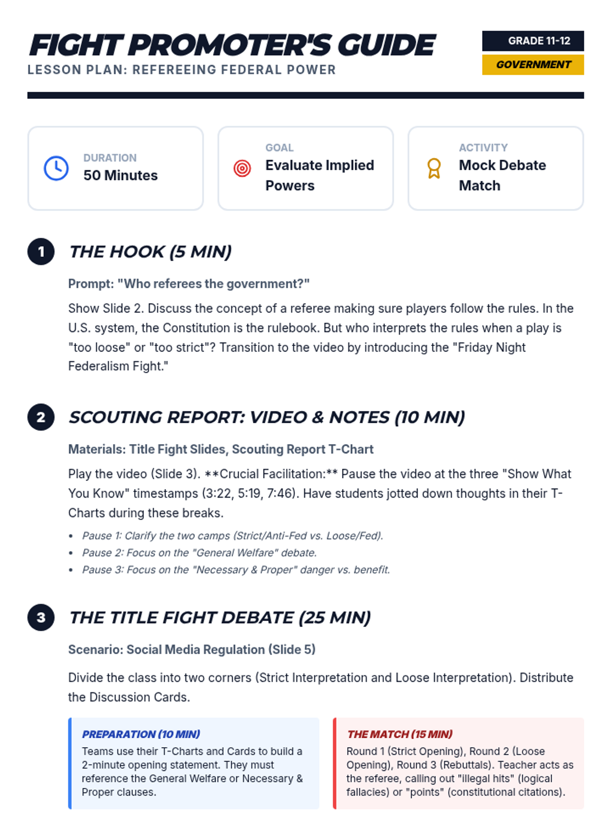 This lesson uses a boxing match metaphor to explore the historic and ongoing debate between strict and loose interpretations of the U.S. Constitution, focusing on the General Welfare and Necessary and Proper clauses. Students will evaluate congressional power through a modern debate scenario regarding social media regulation.