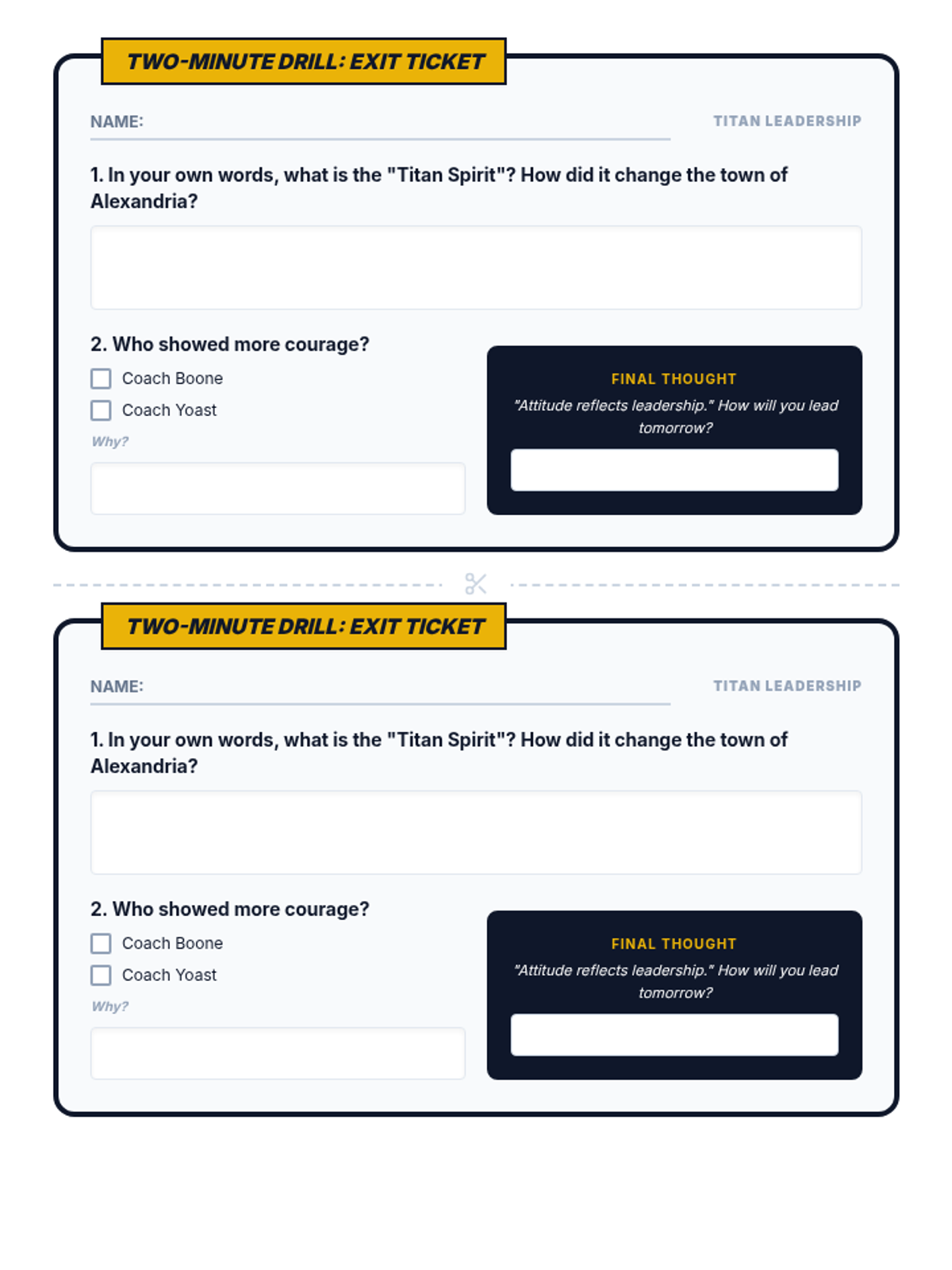 A lesson exploring the themes of leadership, racial integration, and conflict resolution through the film Remember the Titans. Students analyze character development and the historical context of 1971 Alexandria, Virginia.