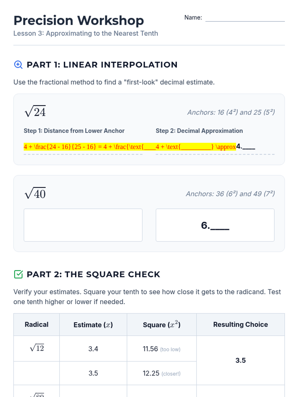 Students refine their estimates to the nearest tenth using linear interpolation and squaring decimals to verify accuracy. This builds precision and mental math stamina for complex approximations.