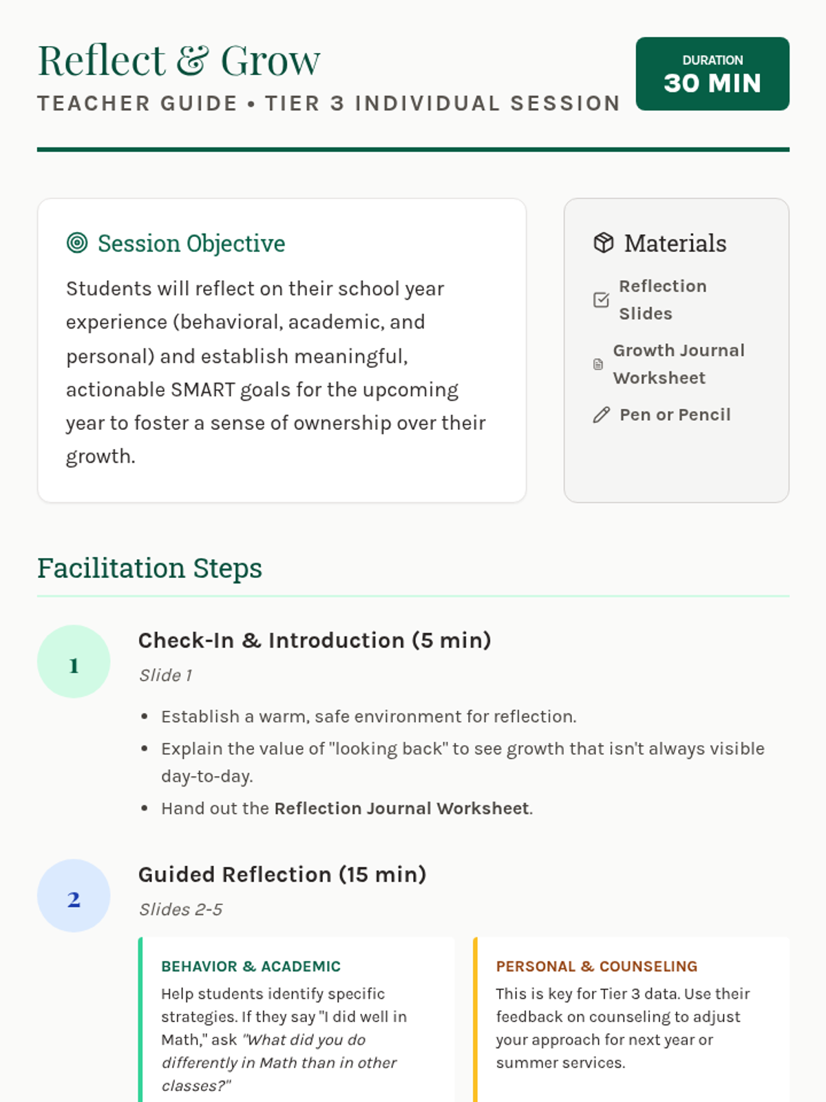 A 30-minute Tier 3 individual counseling session for 6th graders to reflect on their school year and set SMART goals for the future.