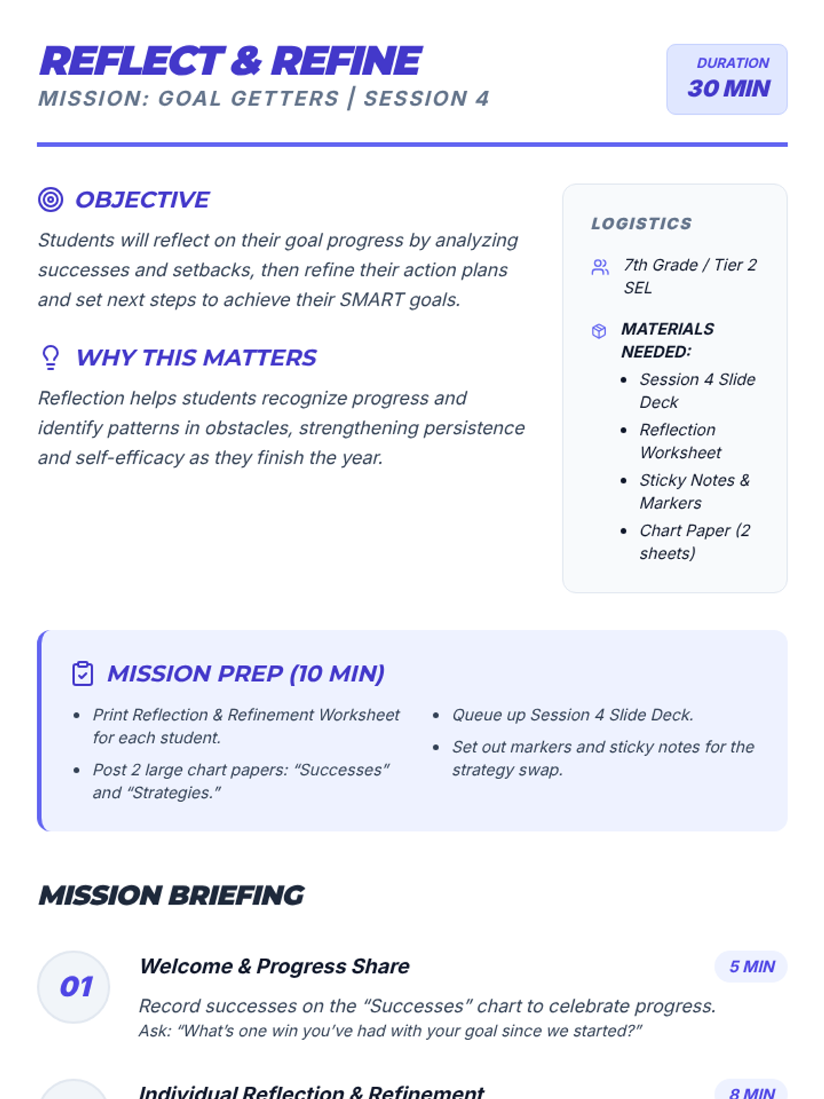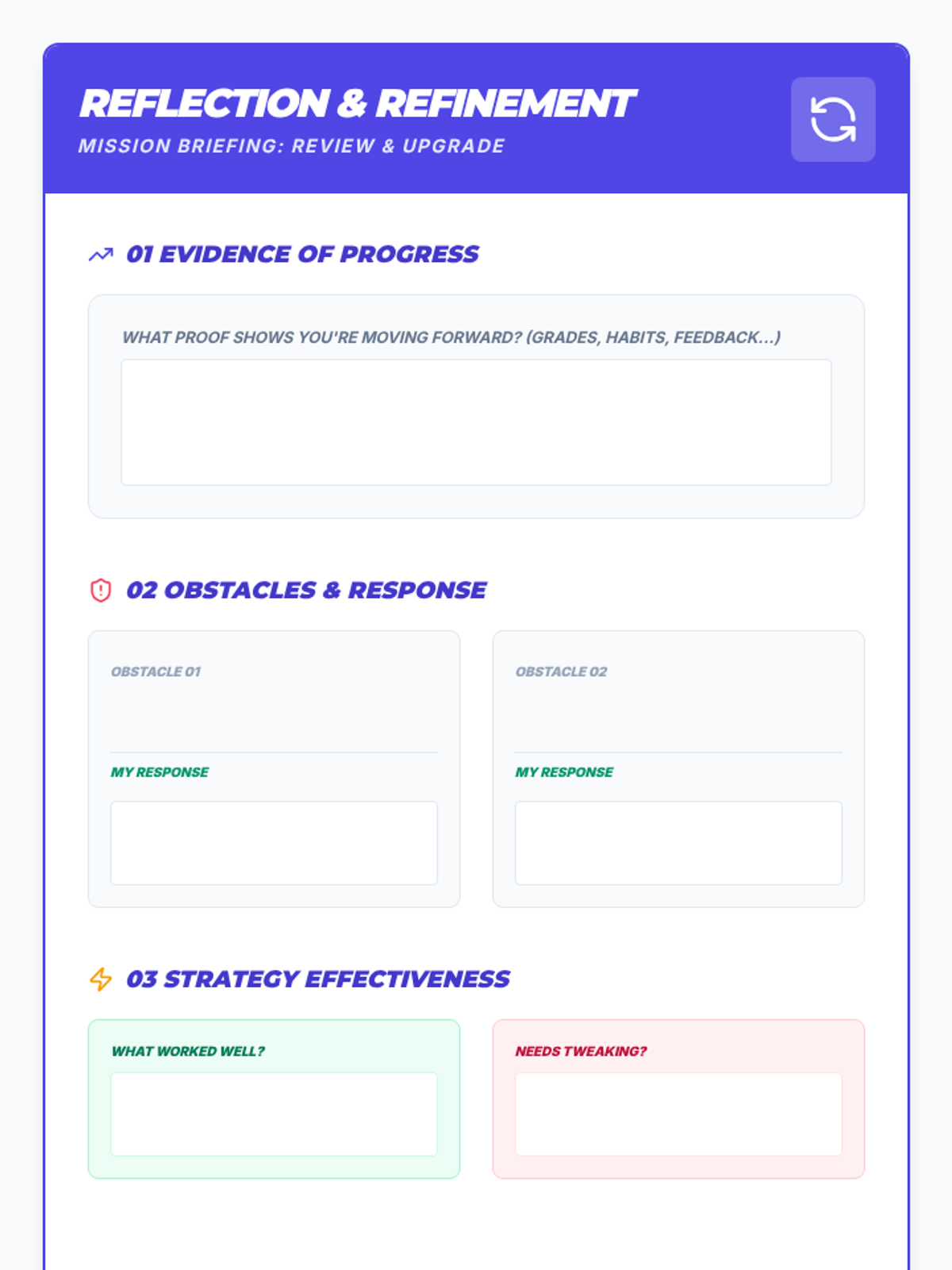 In the final session, students analyze their progress, refine their action steps based on experience, and set a final check-in date for lasting impact.