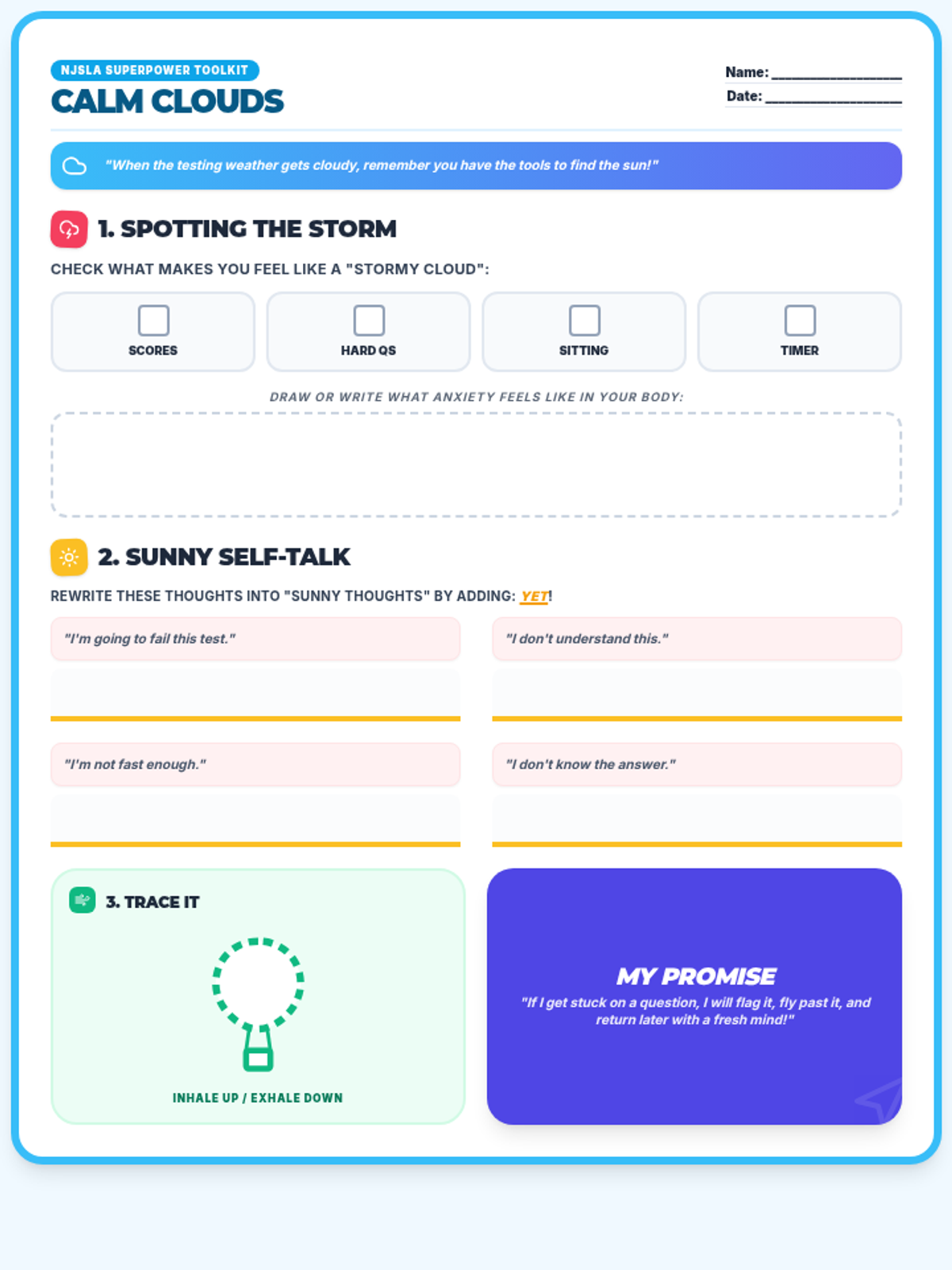 This lesson introduces students to the concept of test anxiety and provides them with a toolkit of regulation techniques and mindset strategies to stay calm during the NJSLA.