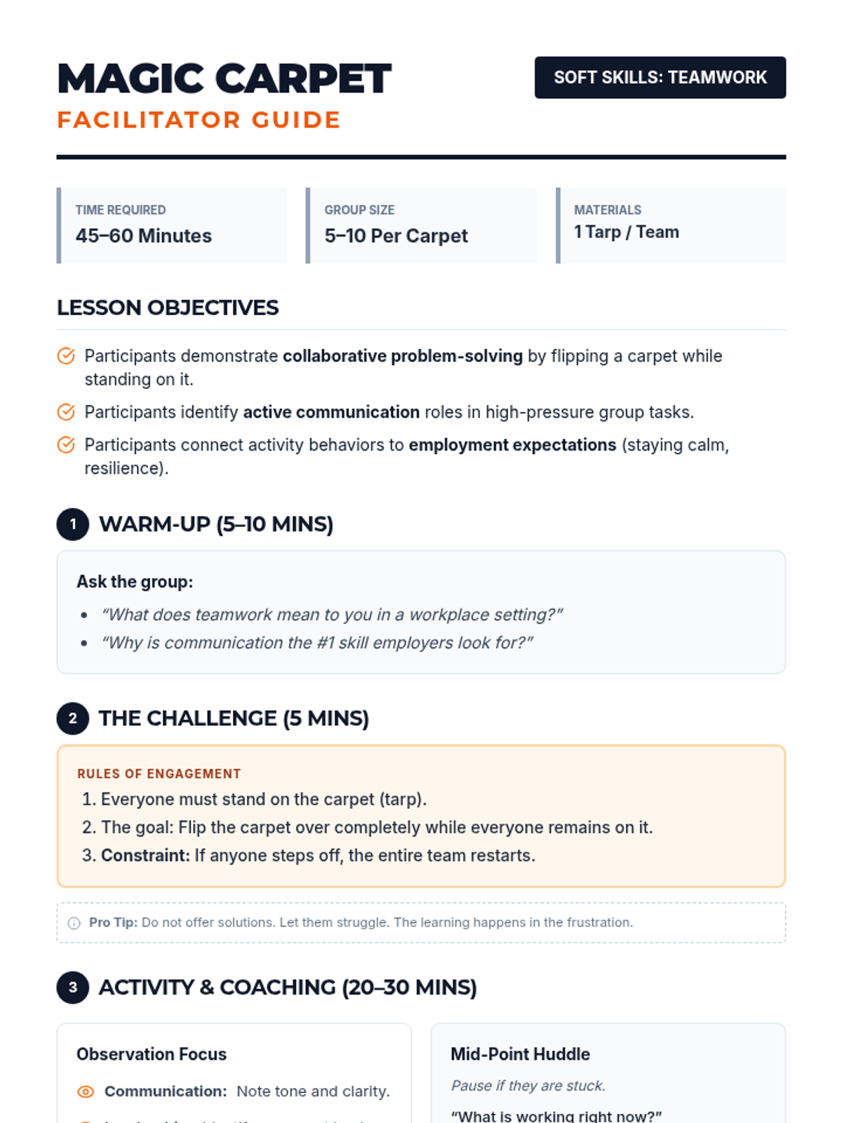 A hands-on teamwork and communication challenge designed for employment readiness, where participants must flip a 'magic carpet' without stepping off.
