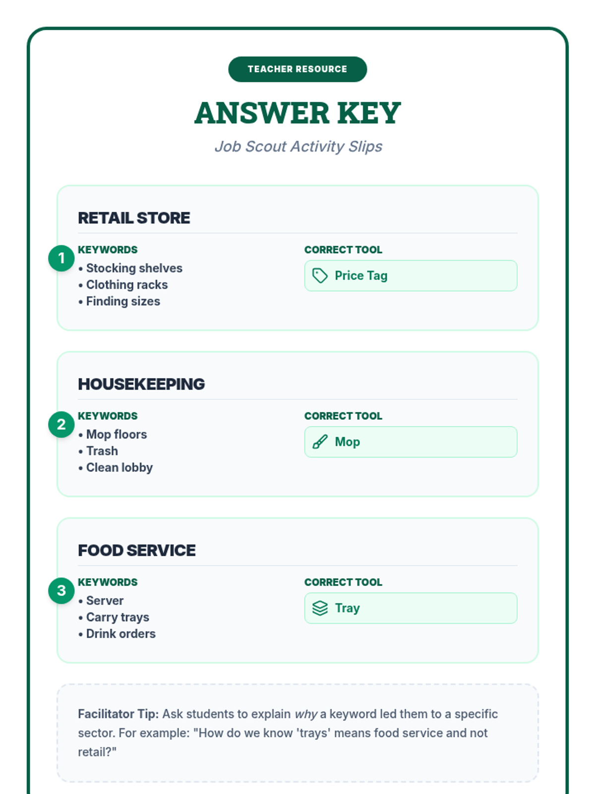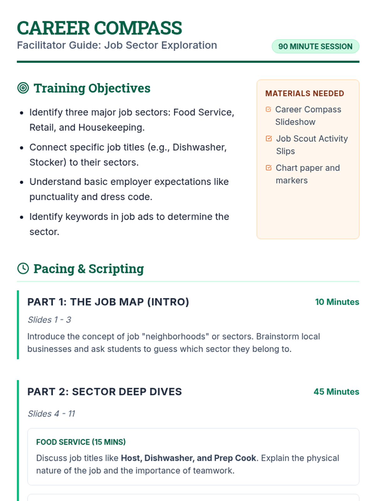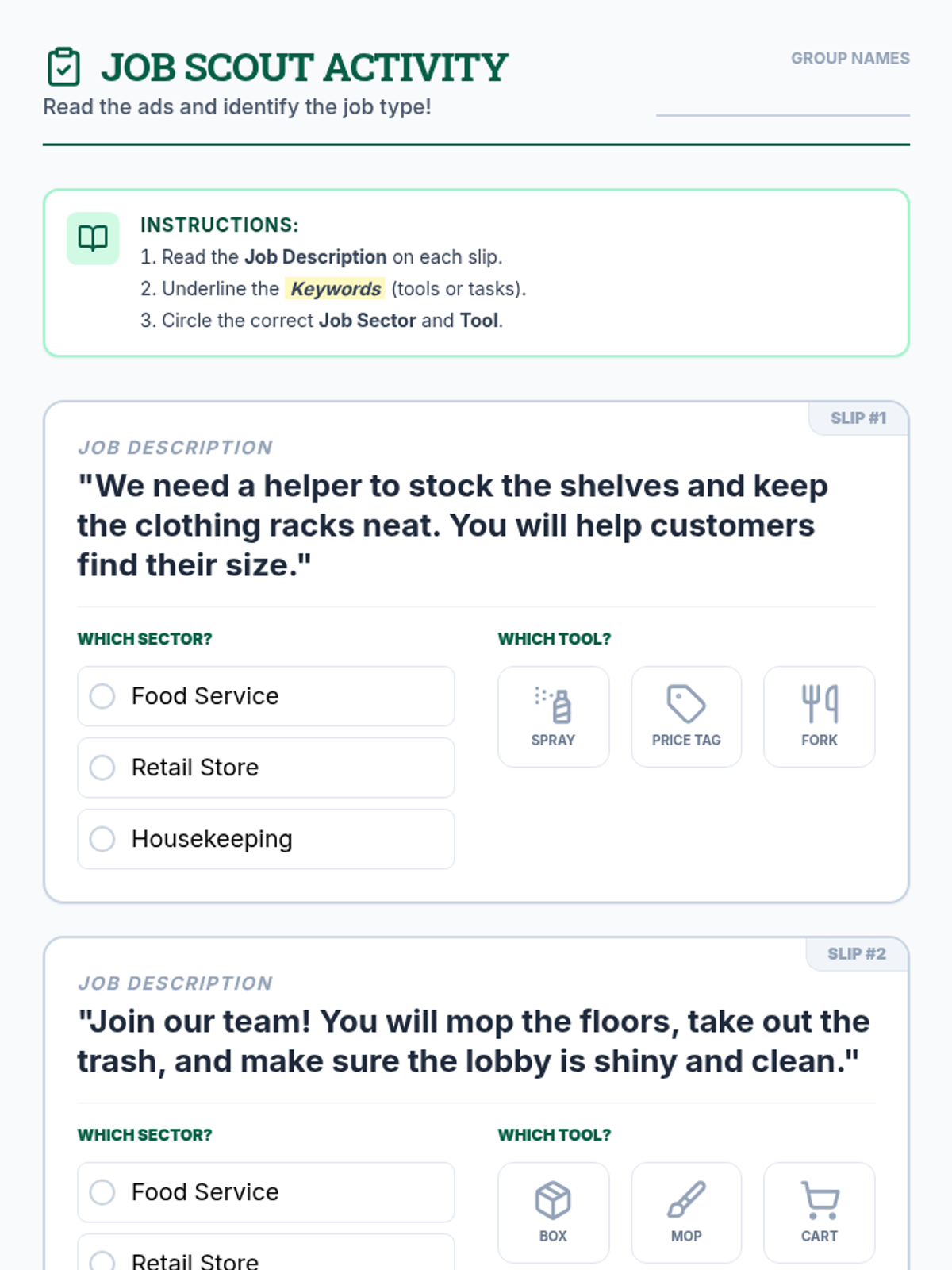 A comprehensive 90-minute employment training session focused on identifying common entry-level job sectors such as food service, retail, and housekeeping through functional reading and hands-on matching activities.