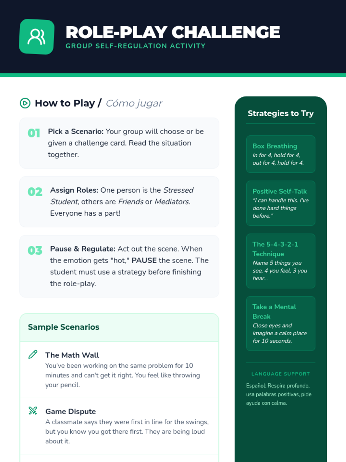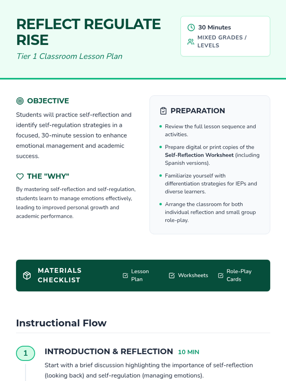 A 30-minute Tier 1 classroom lesson designed to help students across grades and levels master self-reflection and self-regulation techniques through guided discussion and role-play activities.