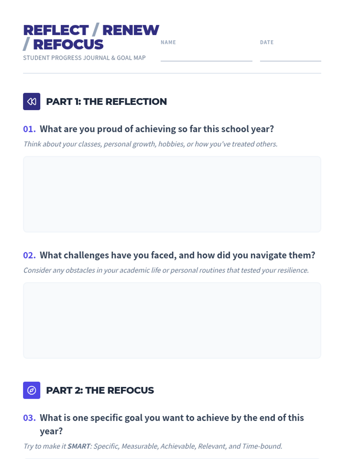 A reflective exercise for high school students to assess their progress from the start of the academic year, overcome challenges, and set SMART goals for the future.