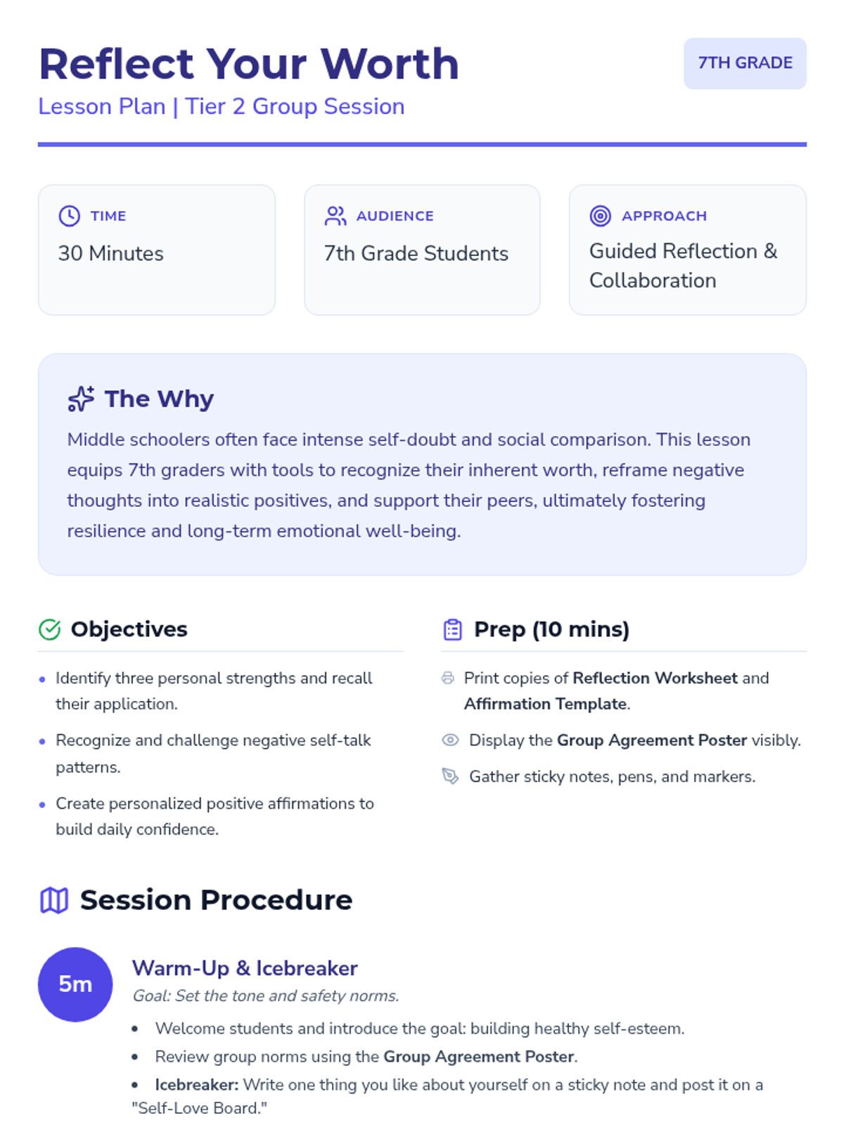 A 30-minute Tier 2 group session for 7th graders to explore healthy self-esteem, identify personal strengths, and challenge negative self-talk.