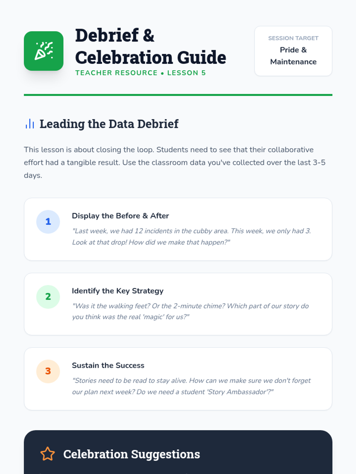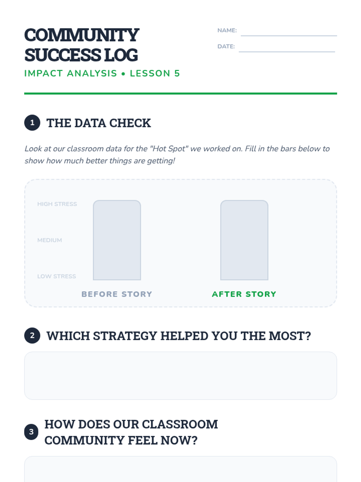 Students analyze the impact of their shared social story by reflecting on classroom data and discussing how the community has changed.