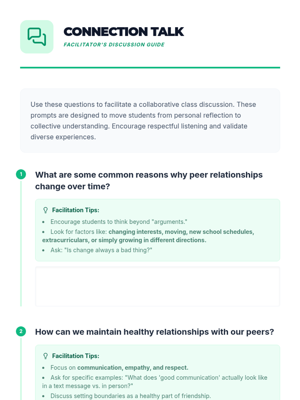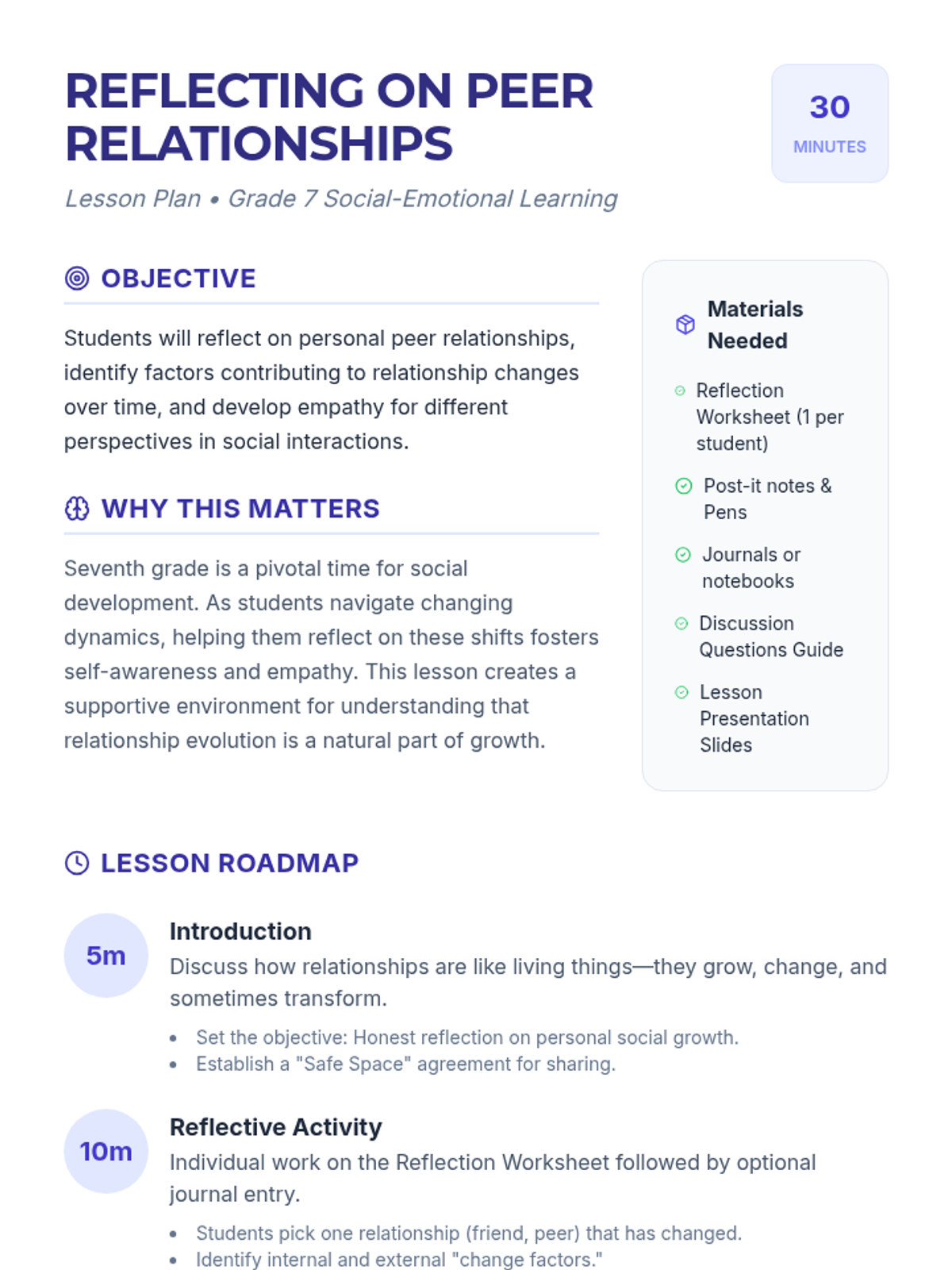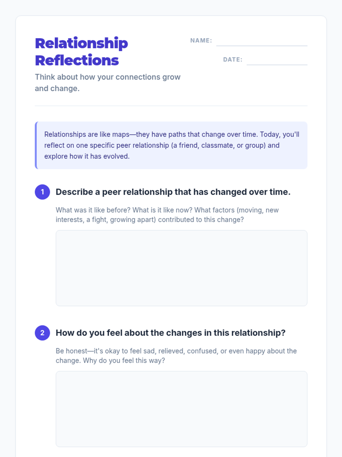 This lesson encourages 7th graders to reflect on their relationships with peers and how these relationships have evolved over time. Through experiential learning and collaborative discussion, students engage in activities that promote self-awareness and empathy.