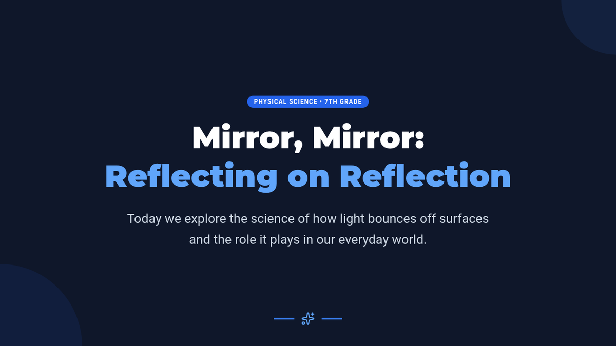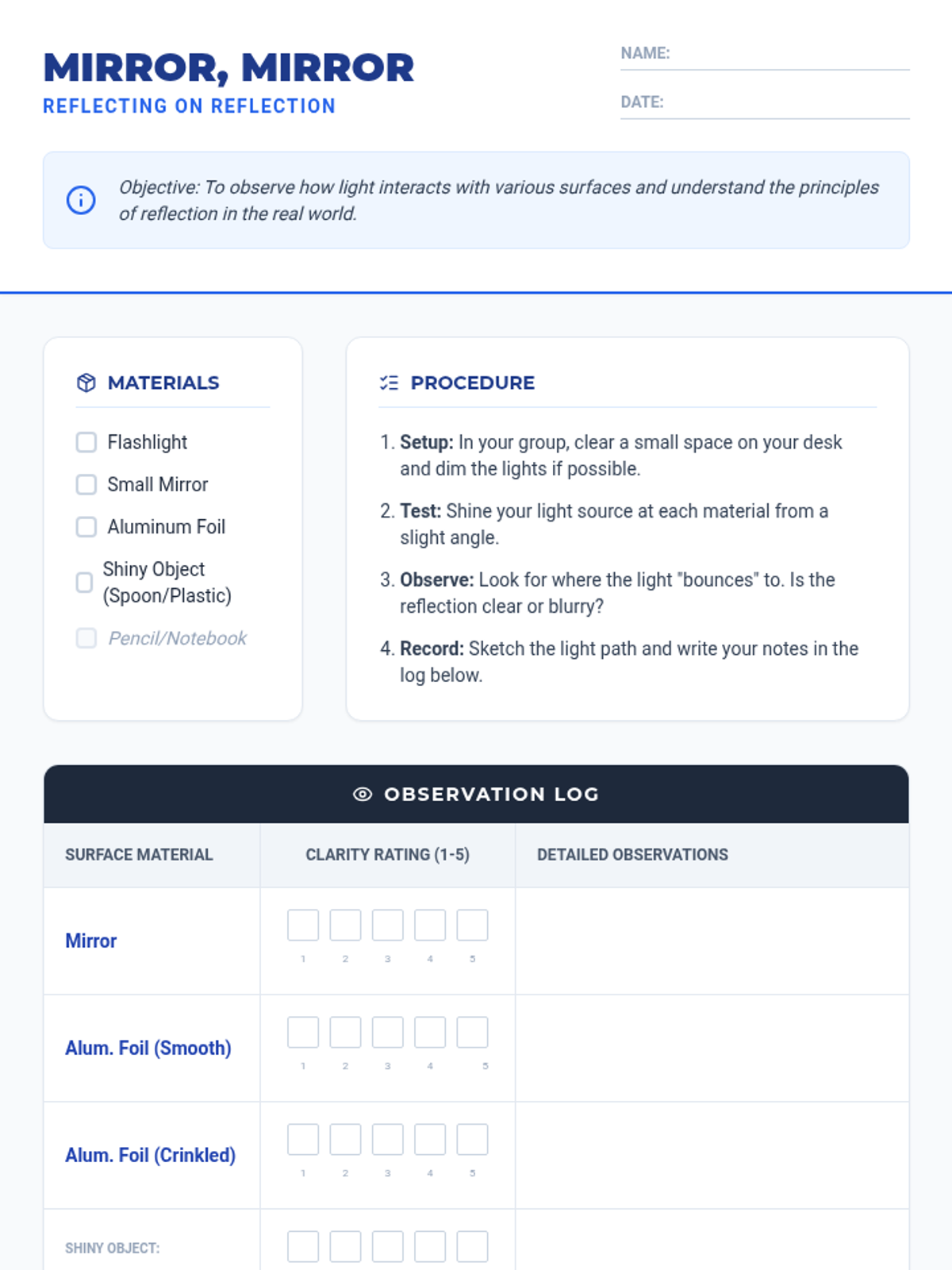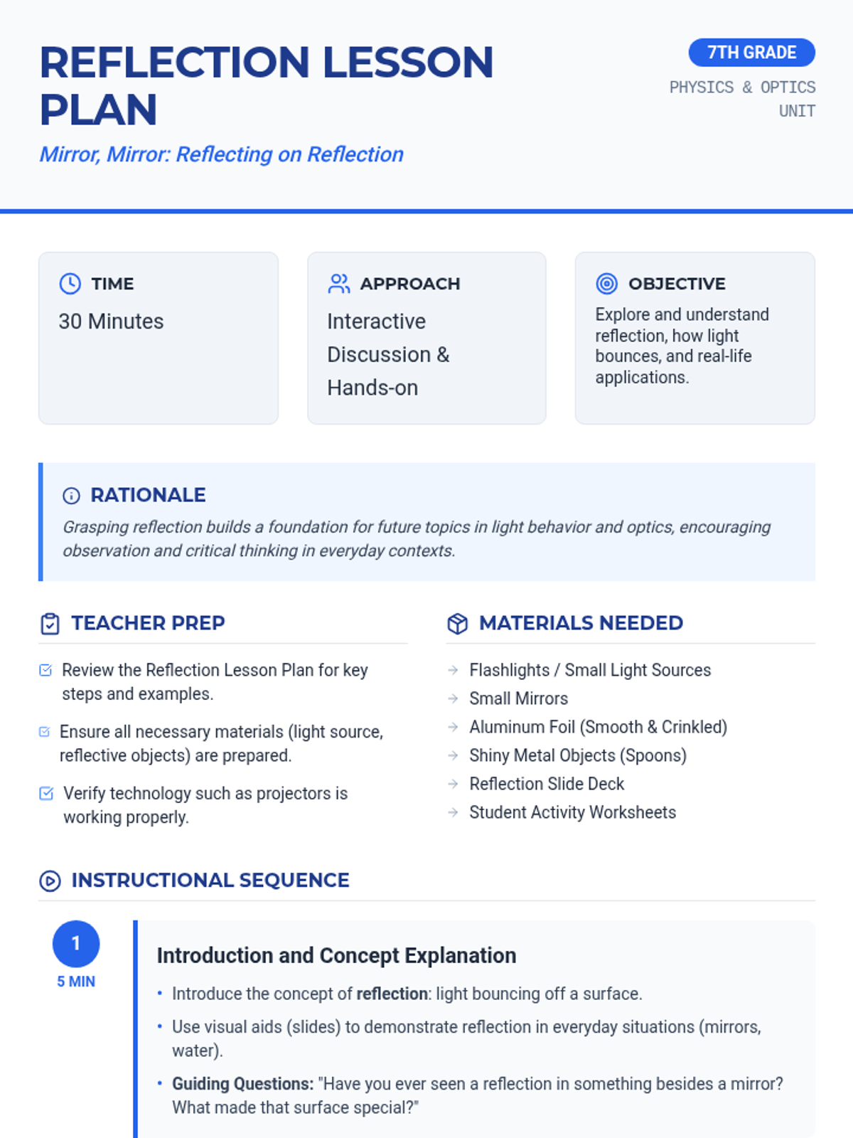A 30-minute introductory lesson on light reflection for 7th graders, featuring hands-on experimentation with various surfaces to understand how light behaves when it bounces.