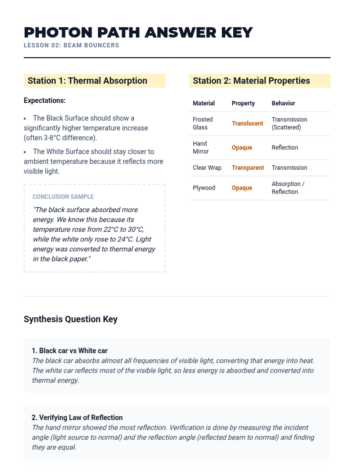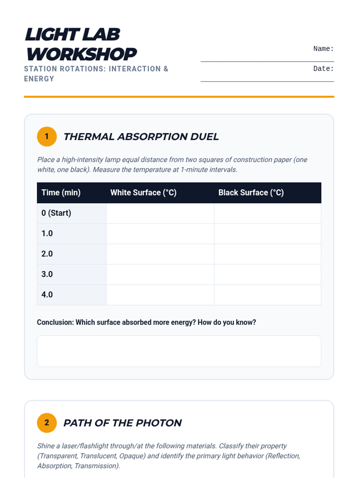 Investigation into how light interacts with matter through reflection, absorption, and transmission across different materials. Students measure thermal changes to understand energy transfer.