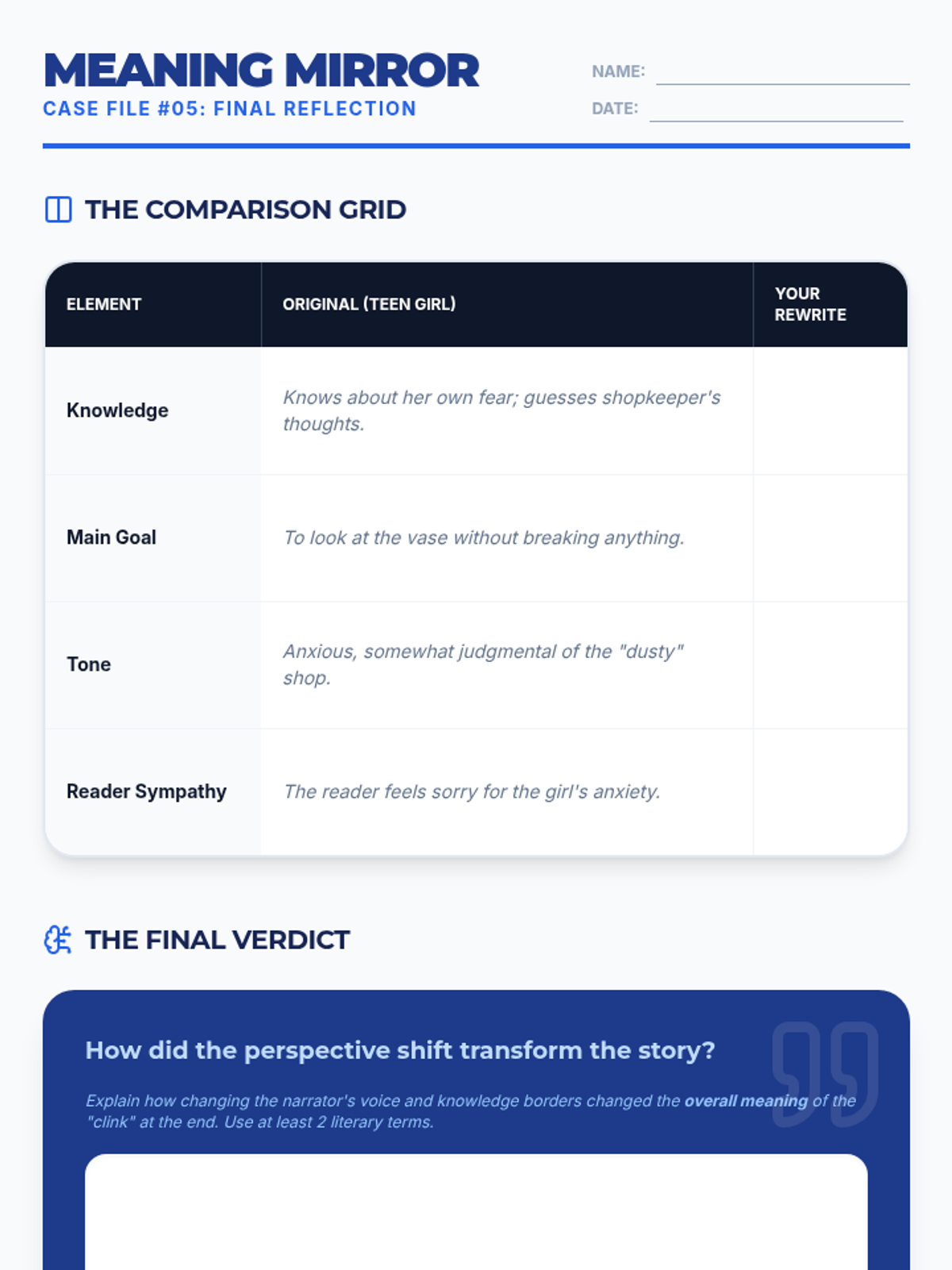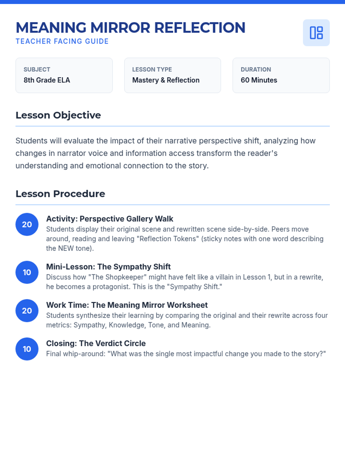 Students analyze the impact of their POV shifts on the reader's understanding and sympathy, culminating in a reflective gallery walk.