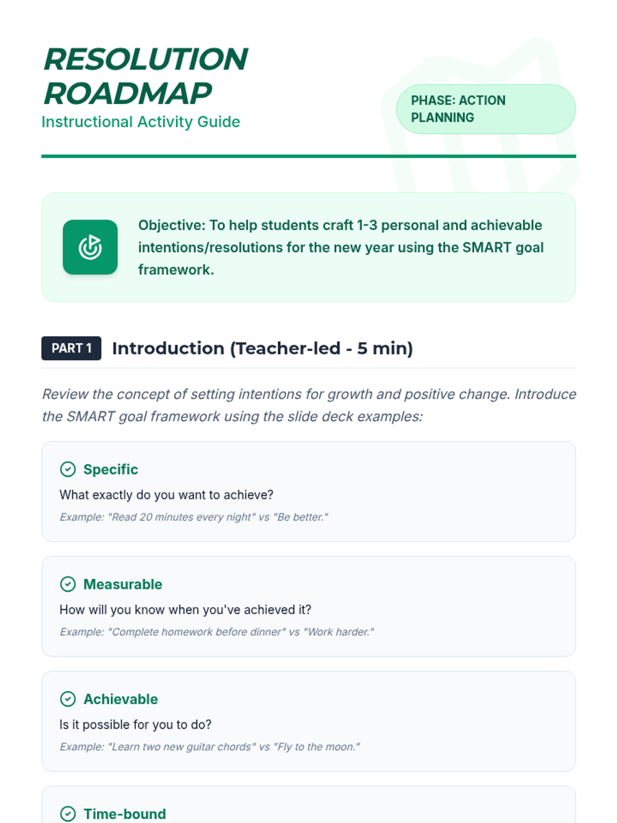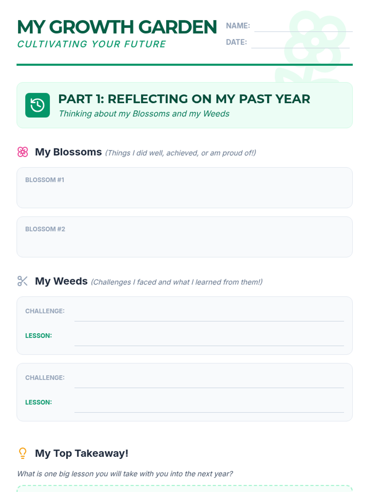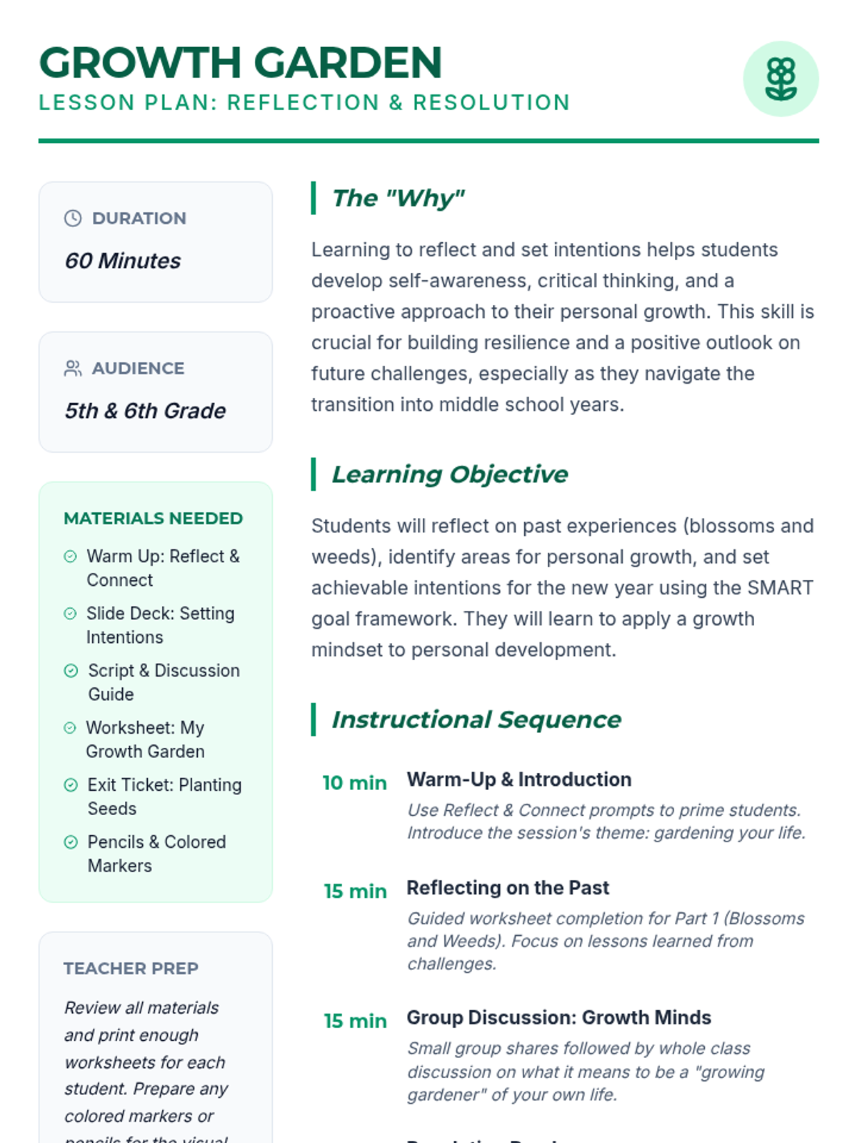 A 60-minute lesson for 5th and 6th graders focused on reflecting on the past year and setting SMART intentions for the new year using a growth mindset approach. Students use a botanical 'Growth Garden' theme to identify past successes (blossoms) and challenges (weeds) before planting new seeds for their future.