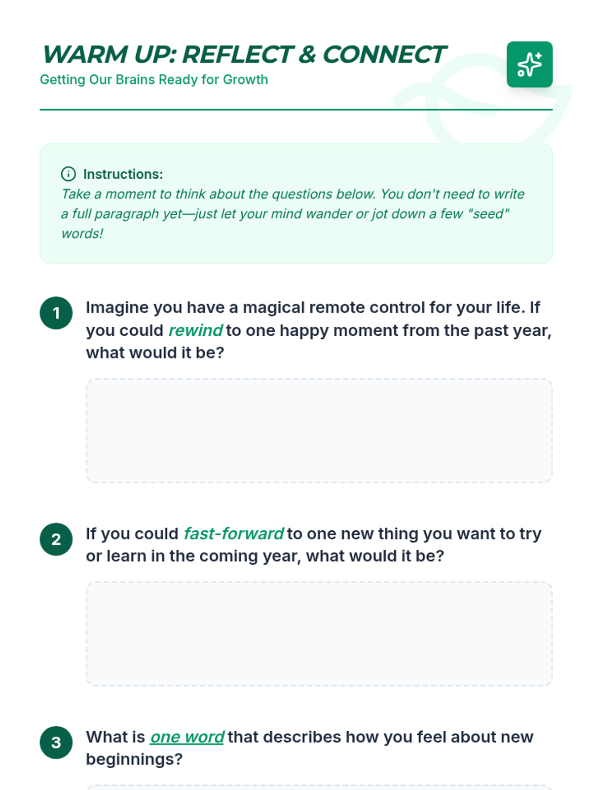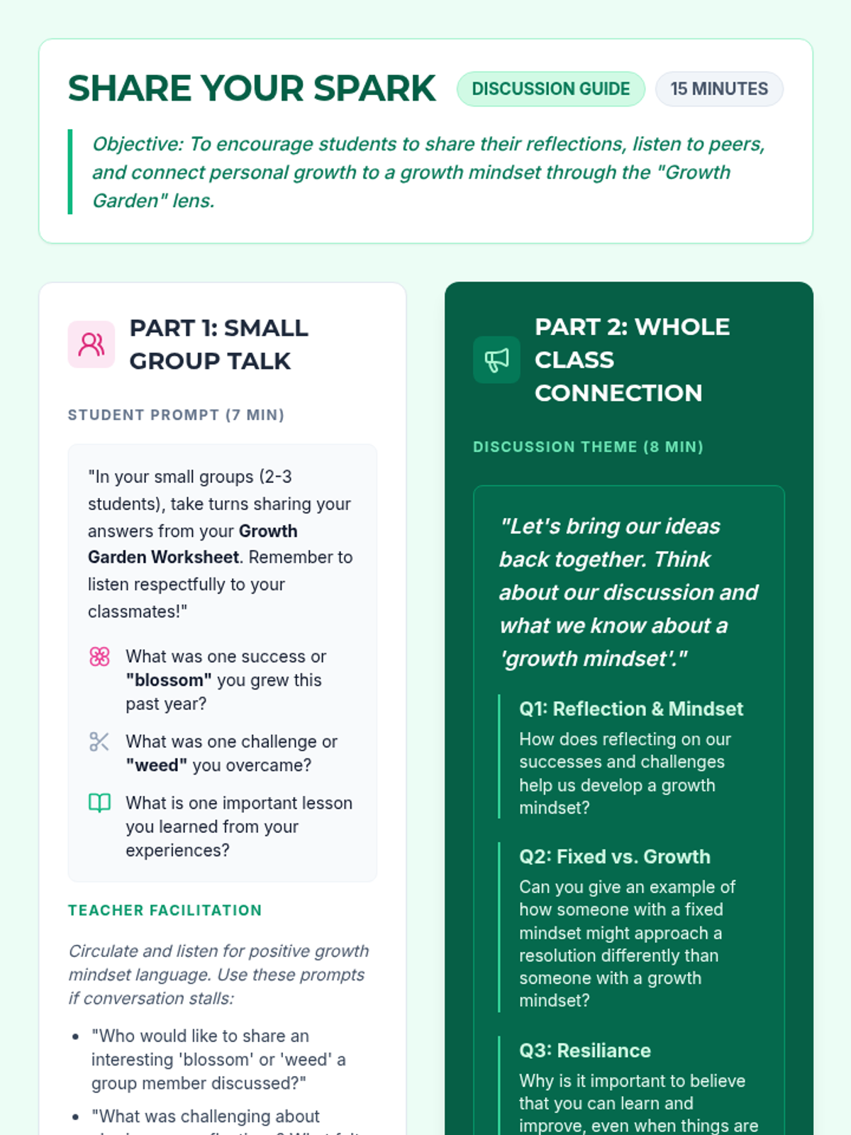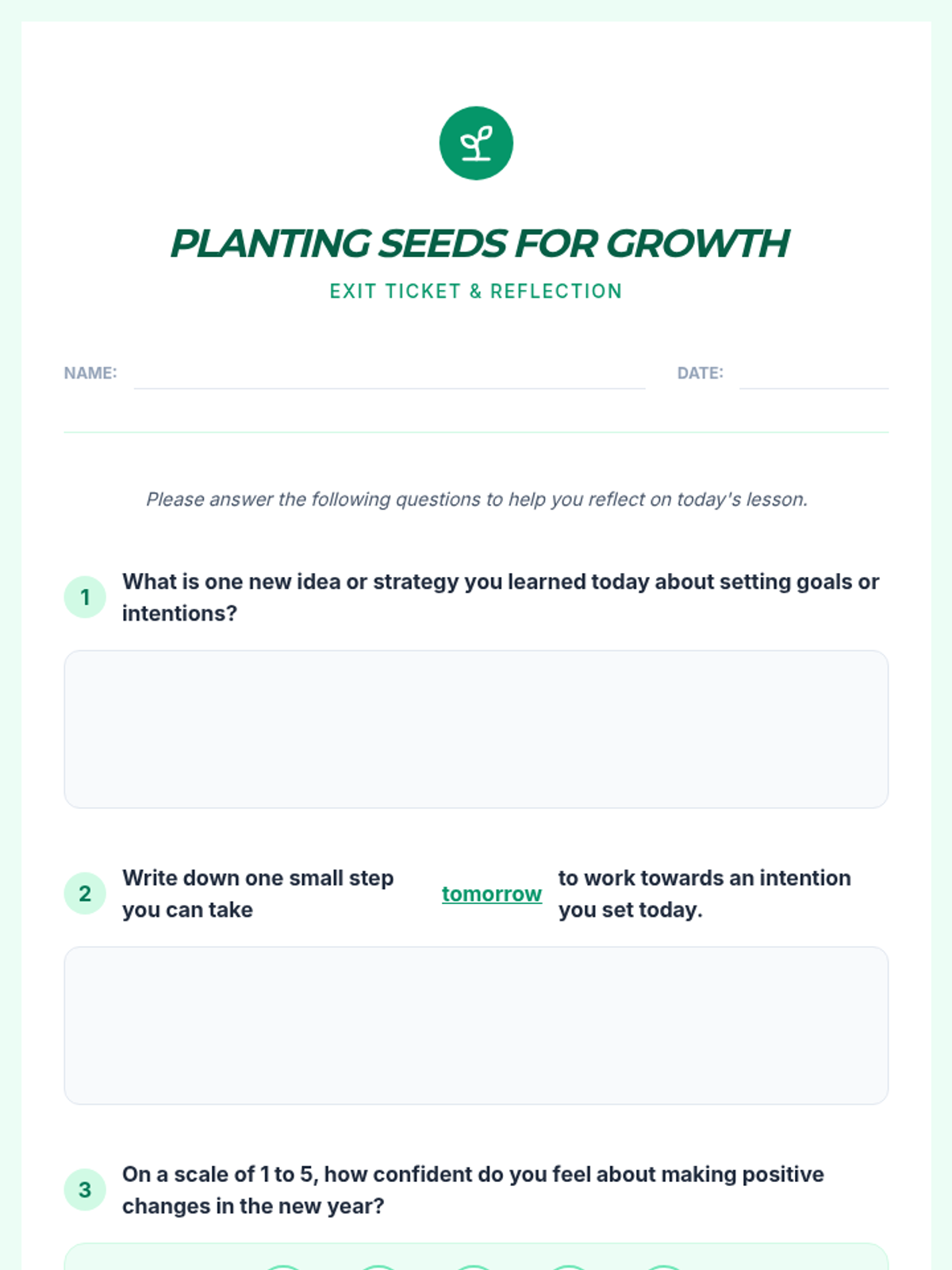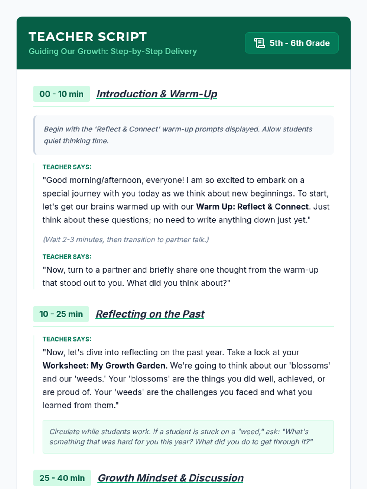 A 60-minute lesson for 5th and 6th graders focused on reflecting on the past year and setting SMART intentions for the new year using a growth mindset approach. Students use a botanical 'Growth Garden' theme to identify past successes (blossoms) and challenges (weeds) before planting new seeds for their future.