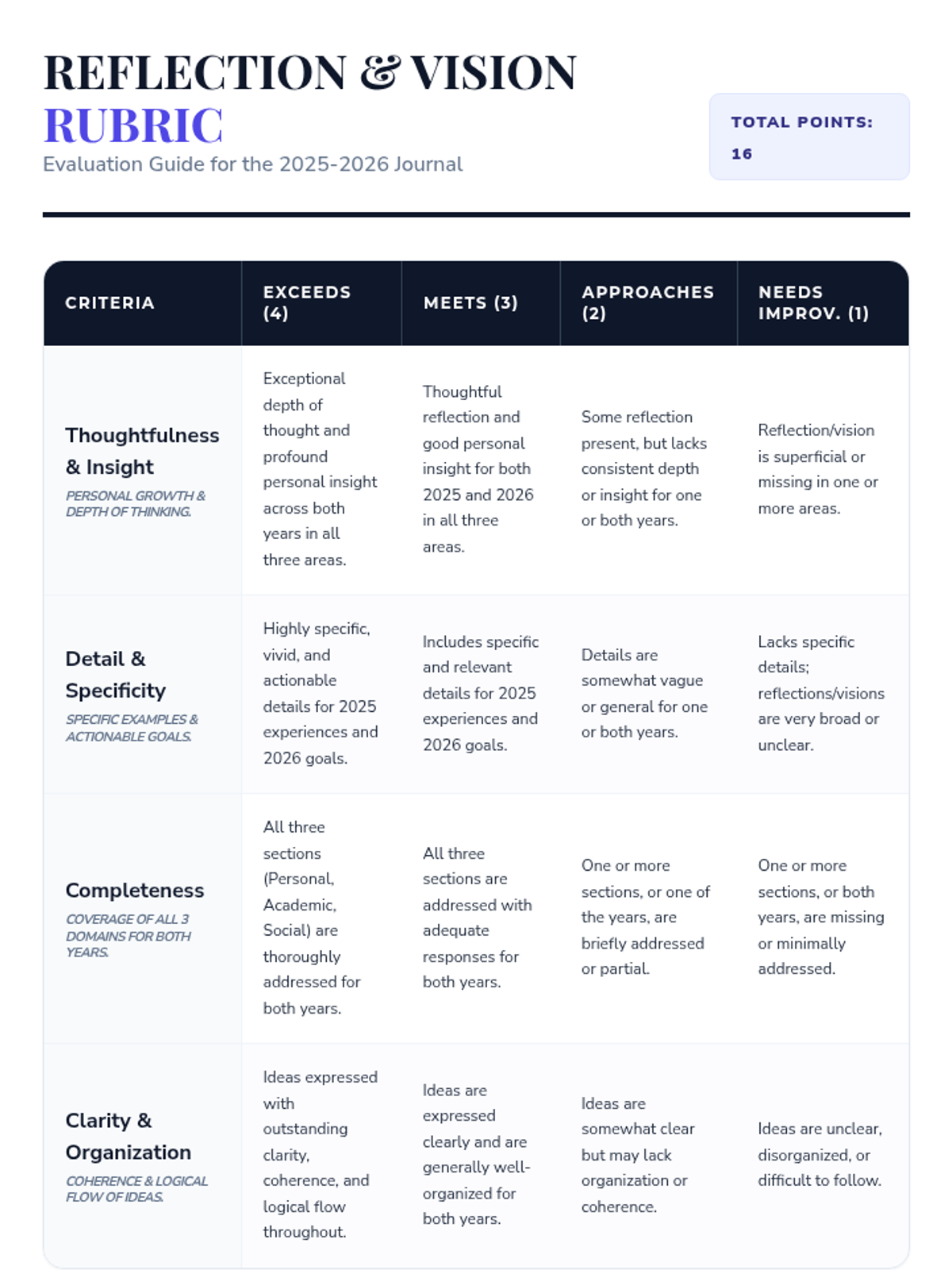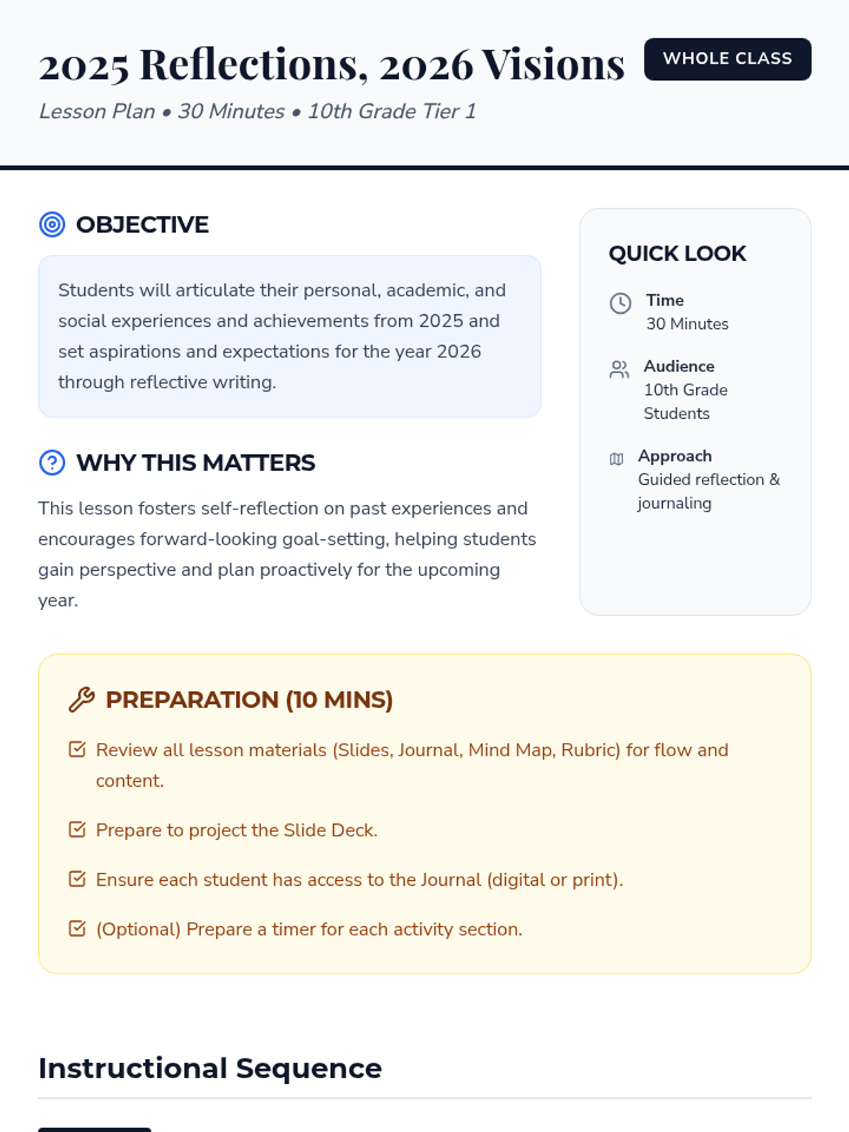 A single-session 30-minute lesson for 10th-grade students to reflect on their experiences in 2025 and set aspirations for 2026 across personal, academic, and social domains.