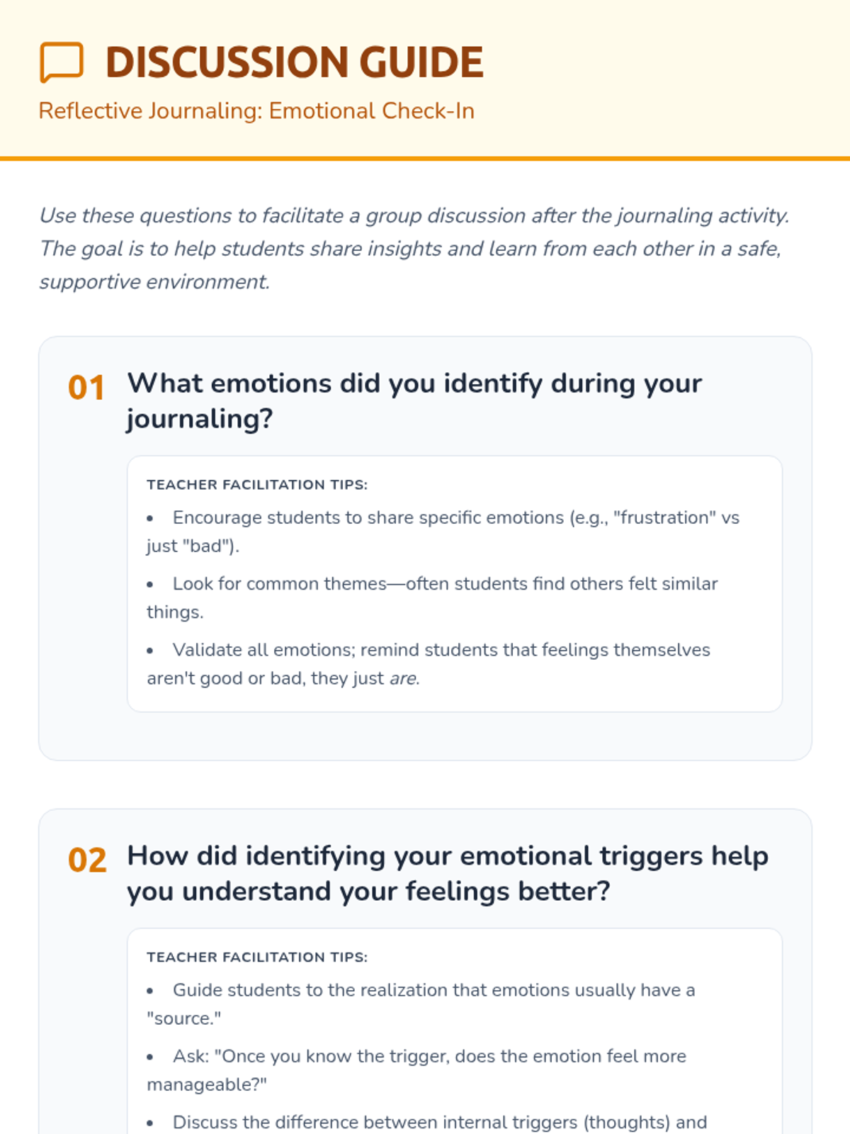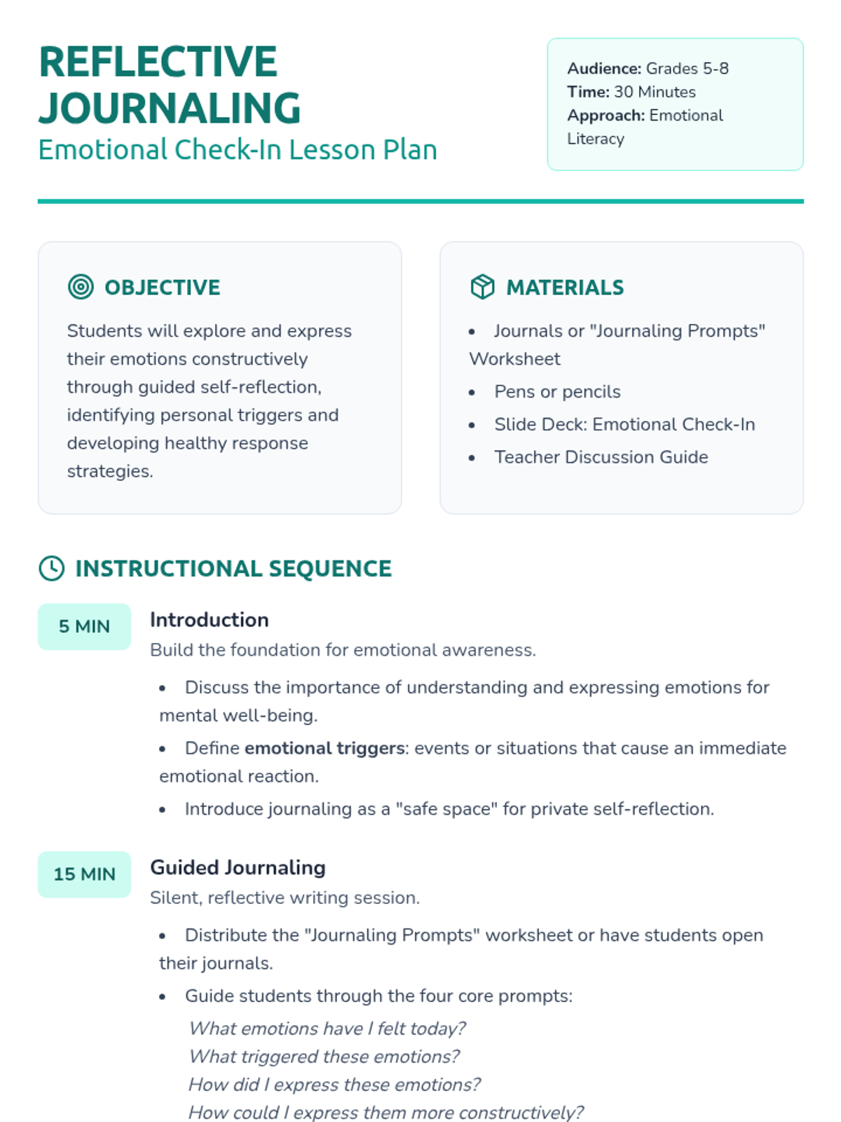 A 30-minute lesson guiding students through reflective journaling to identify emotional triggers and develop constructive ways to express feelings. Supports emotional literacy and self-awareness for middle school students.