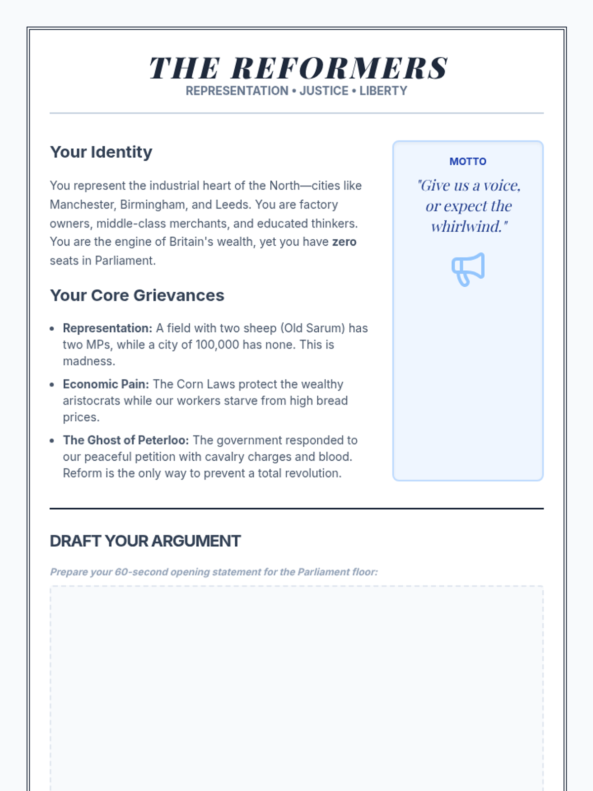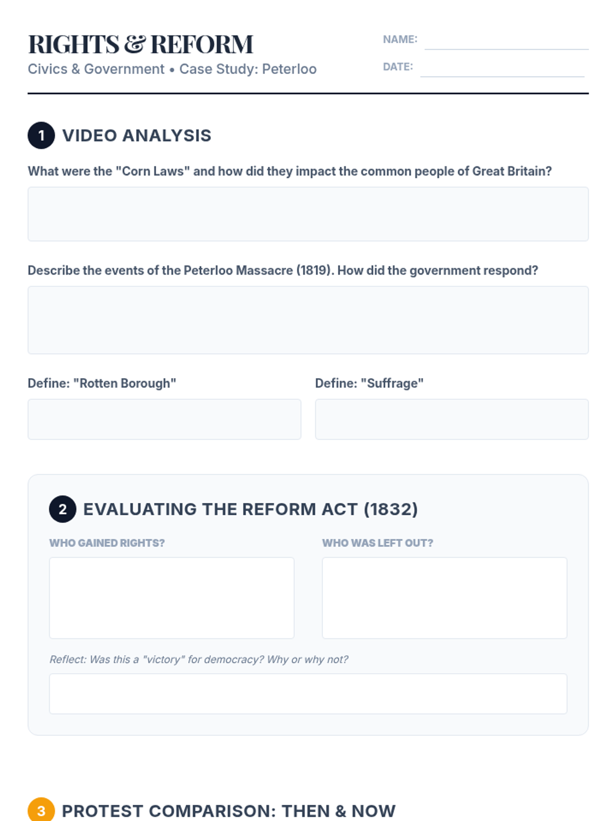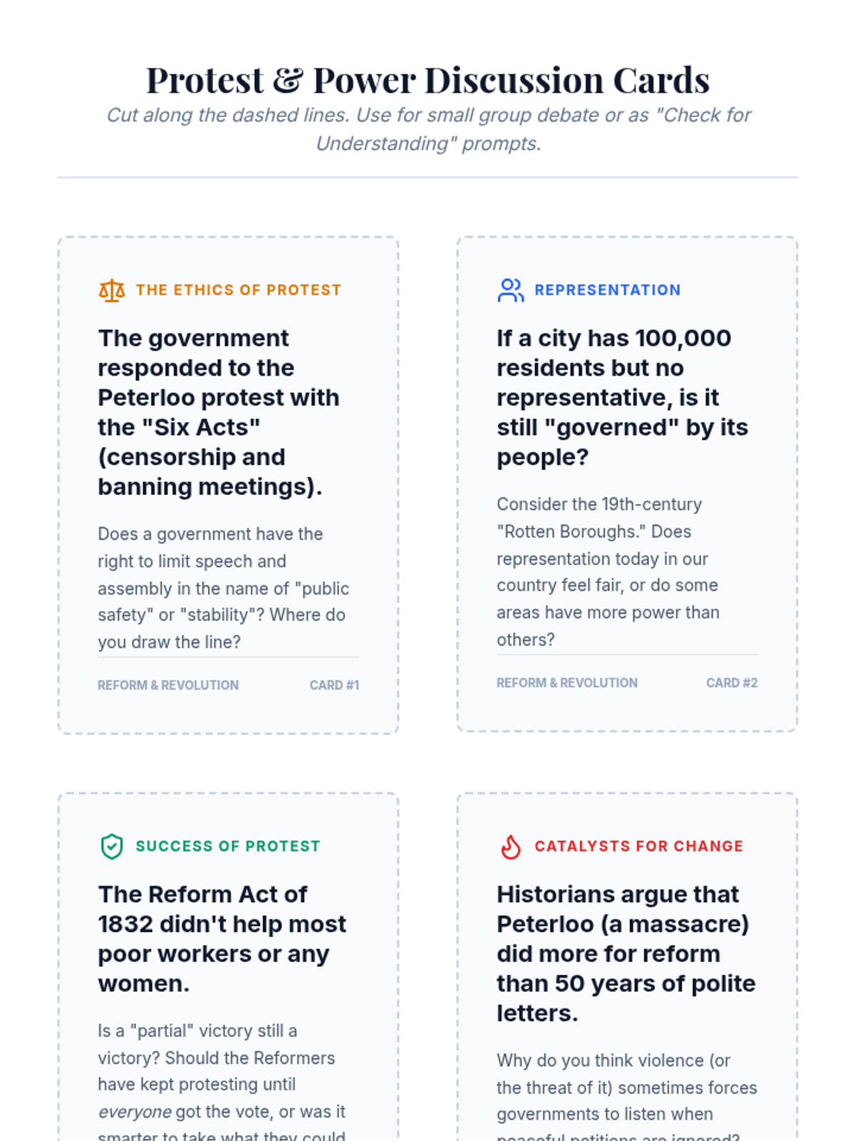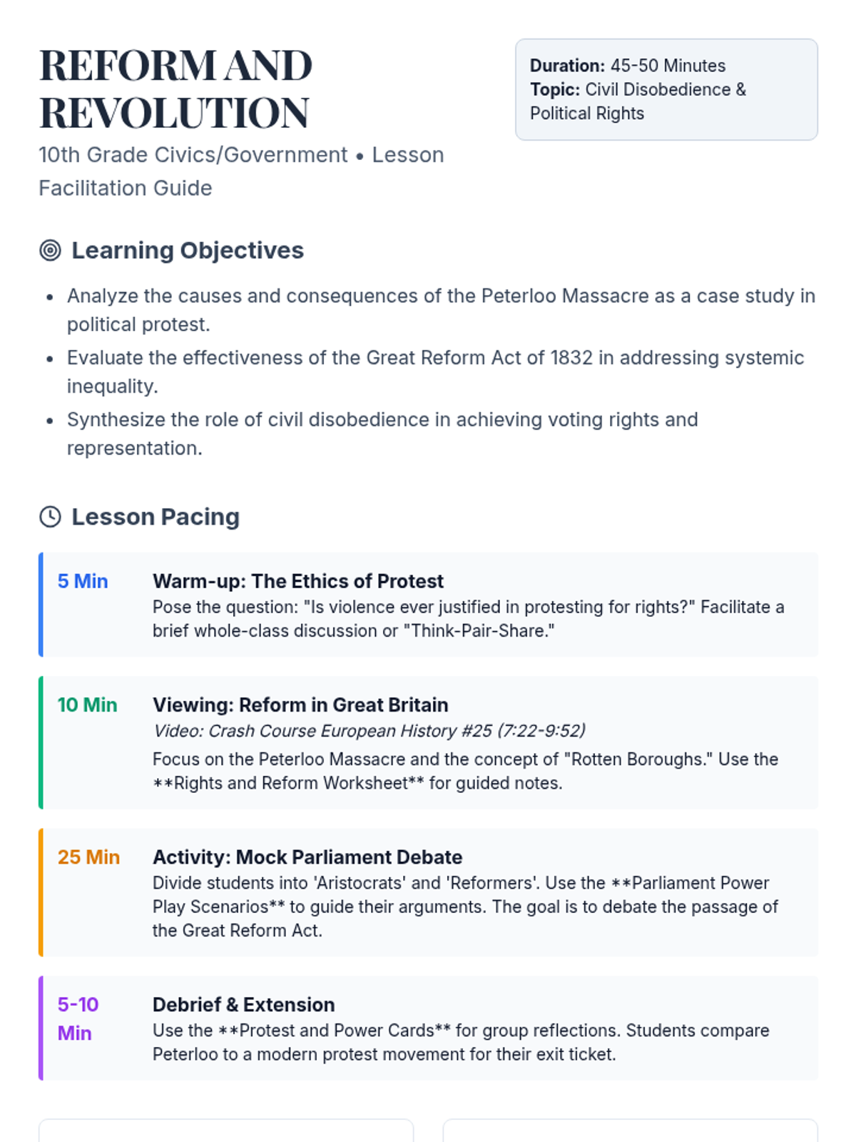 This lesson explores the Peterloo Massacre and the Great Reform Act of 1832 to analyze how civil disobedience and protest drive political change. Students participate in a Mock Parliament to debate representation and stability in 19th-century Britain.
