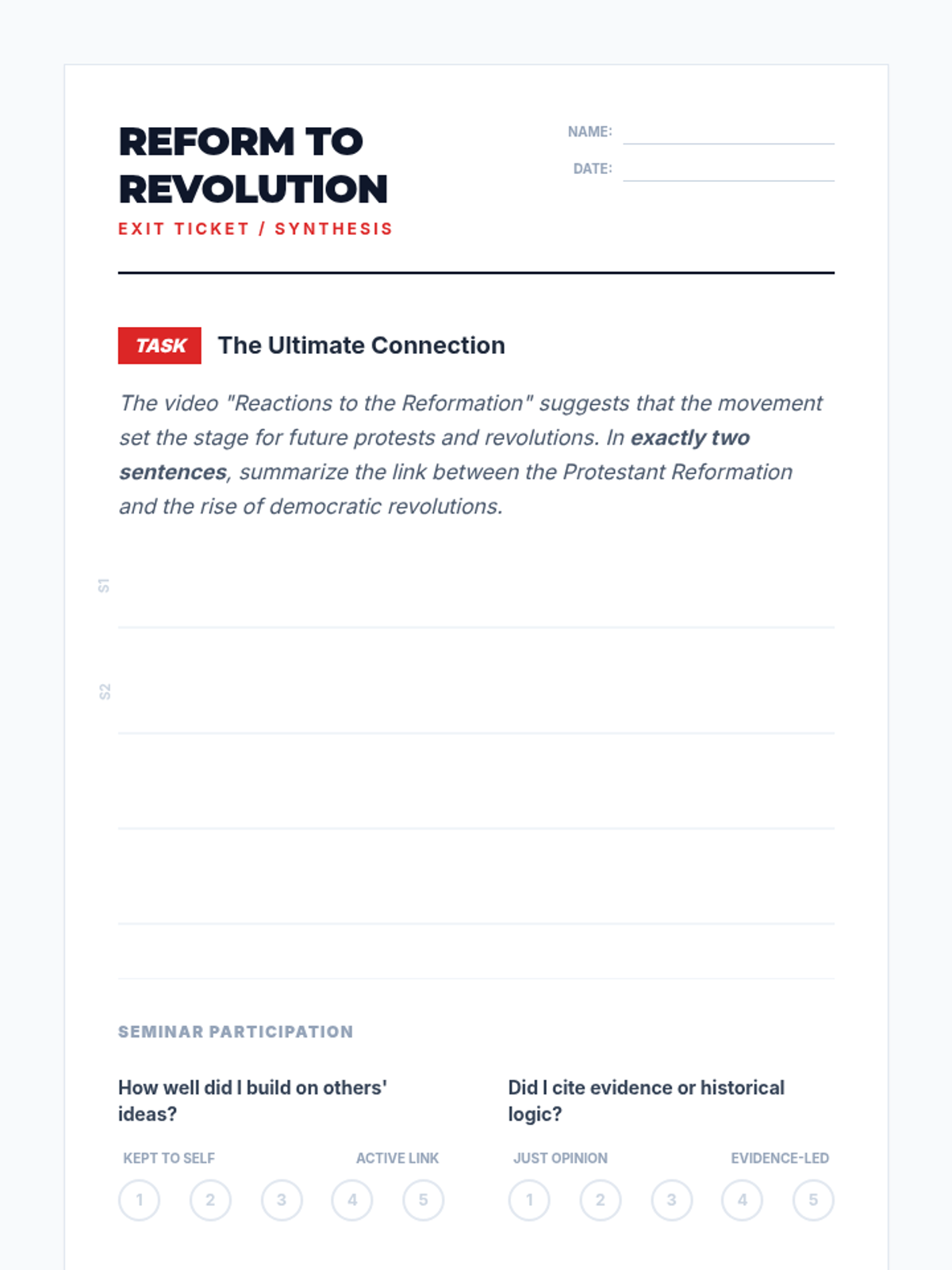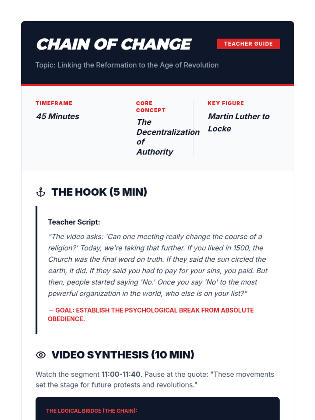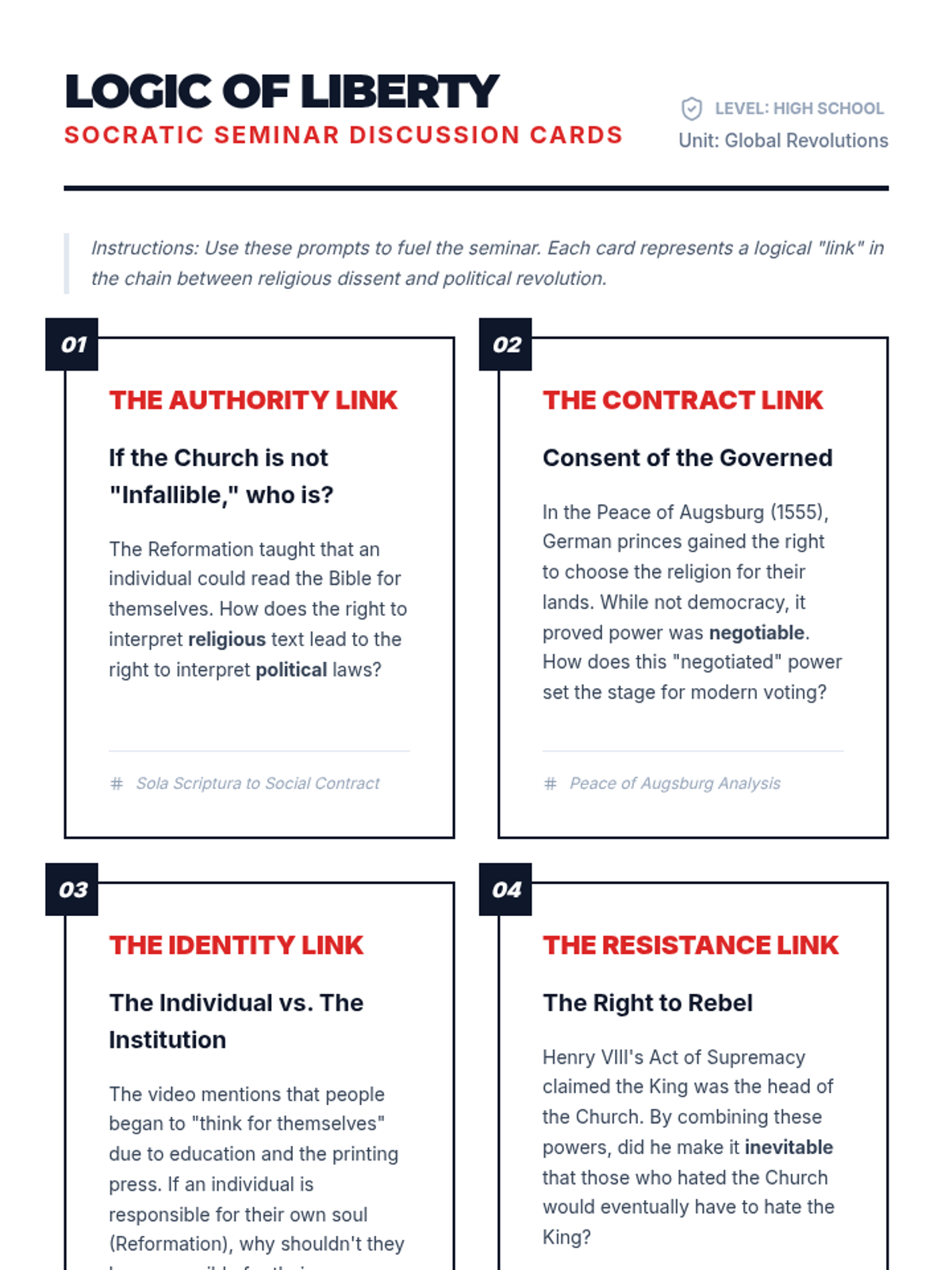 This lesson explores the intellectual bridge between the Protestant Reformation and the rise of democratic revolutions. Students analyze how challenging religious authority paved the way for questioning political power and the birth of modern democracy.