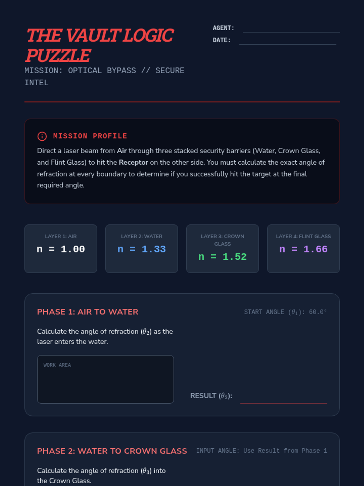 A gamified review where students direct a laser through multiple media to hit a target, requiring precise calculations of refraction at each boundary.