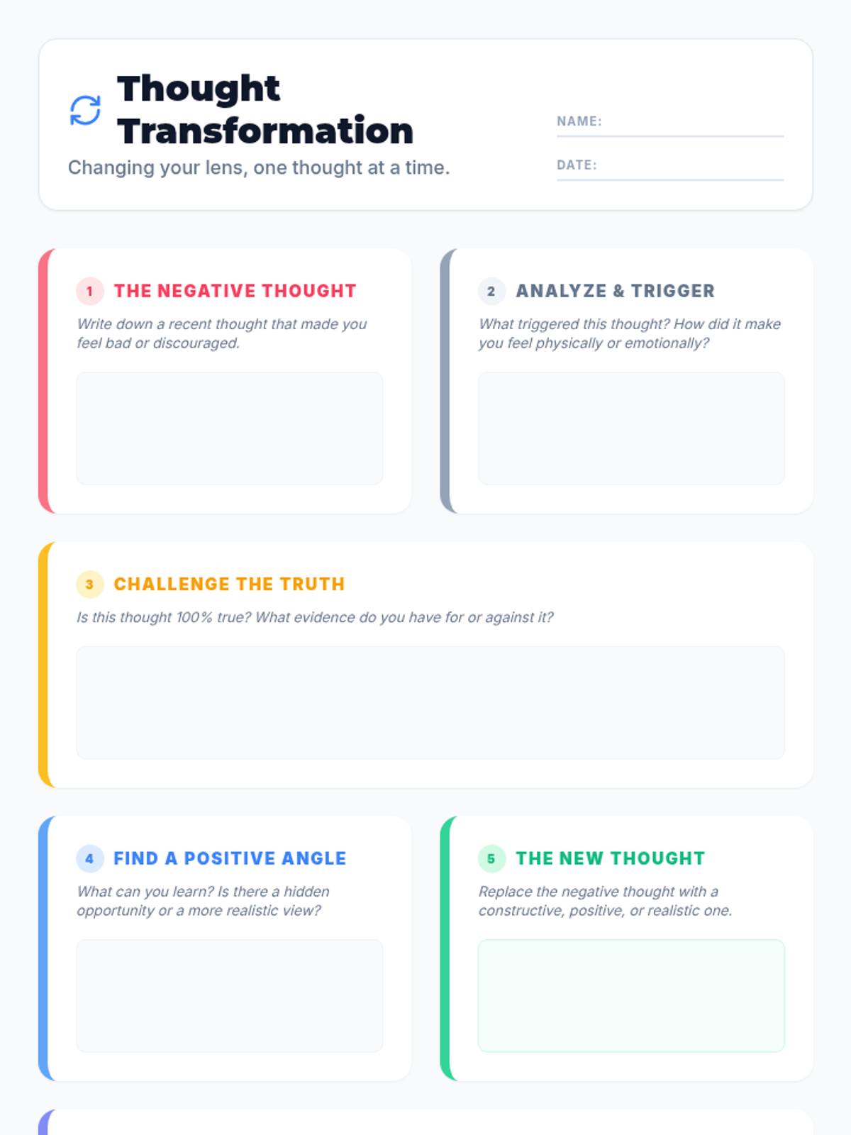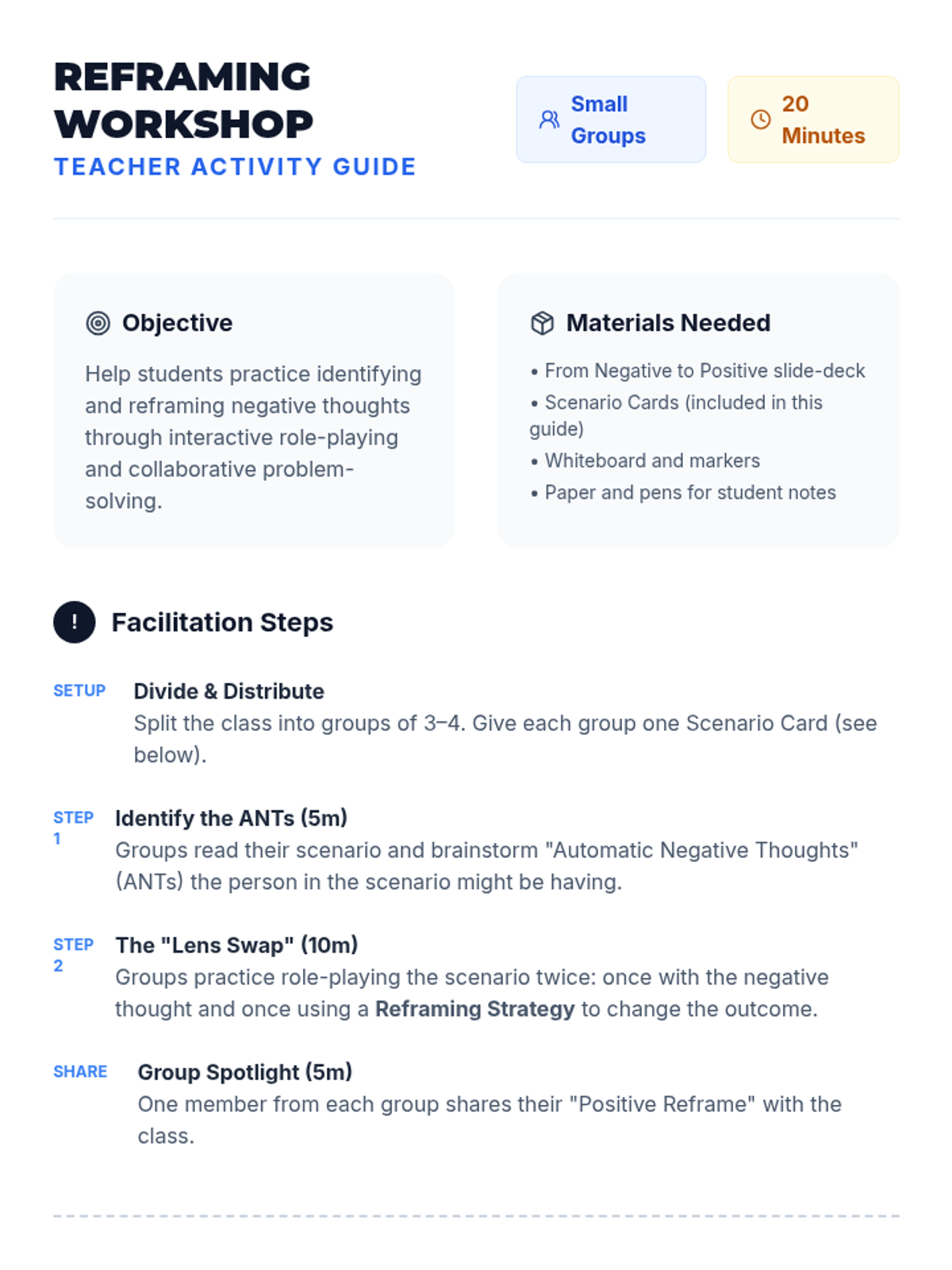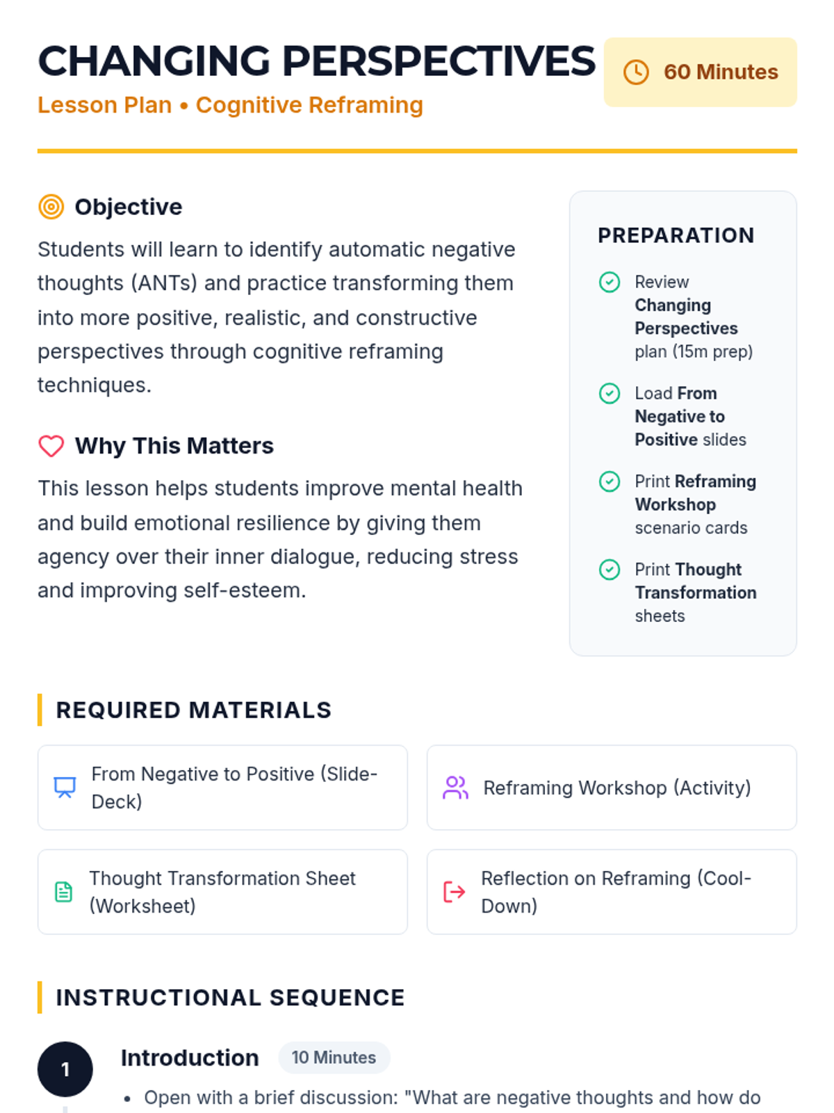 A comprehensive lesson designed for middle school students to identify negative thought patterns and learn practical cognitive reframing strategies to build emotional resilience.