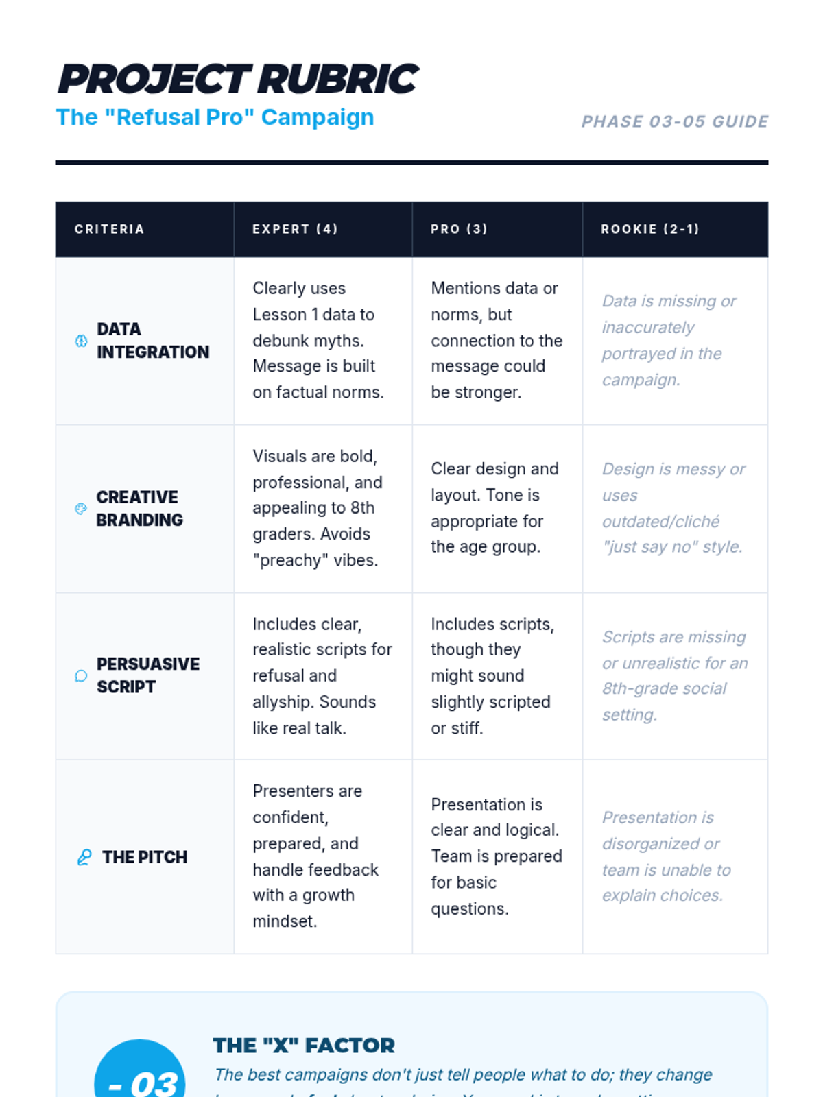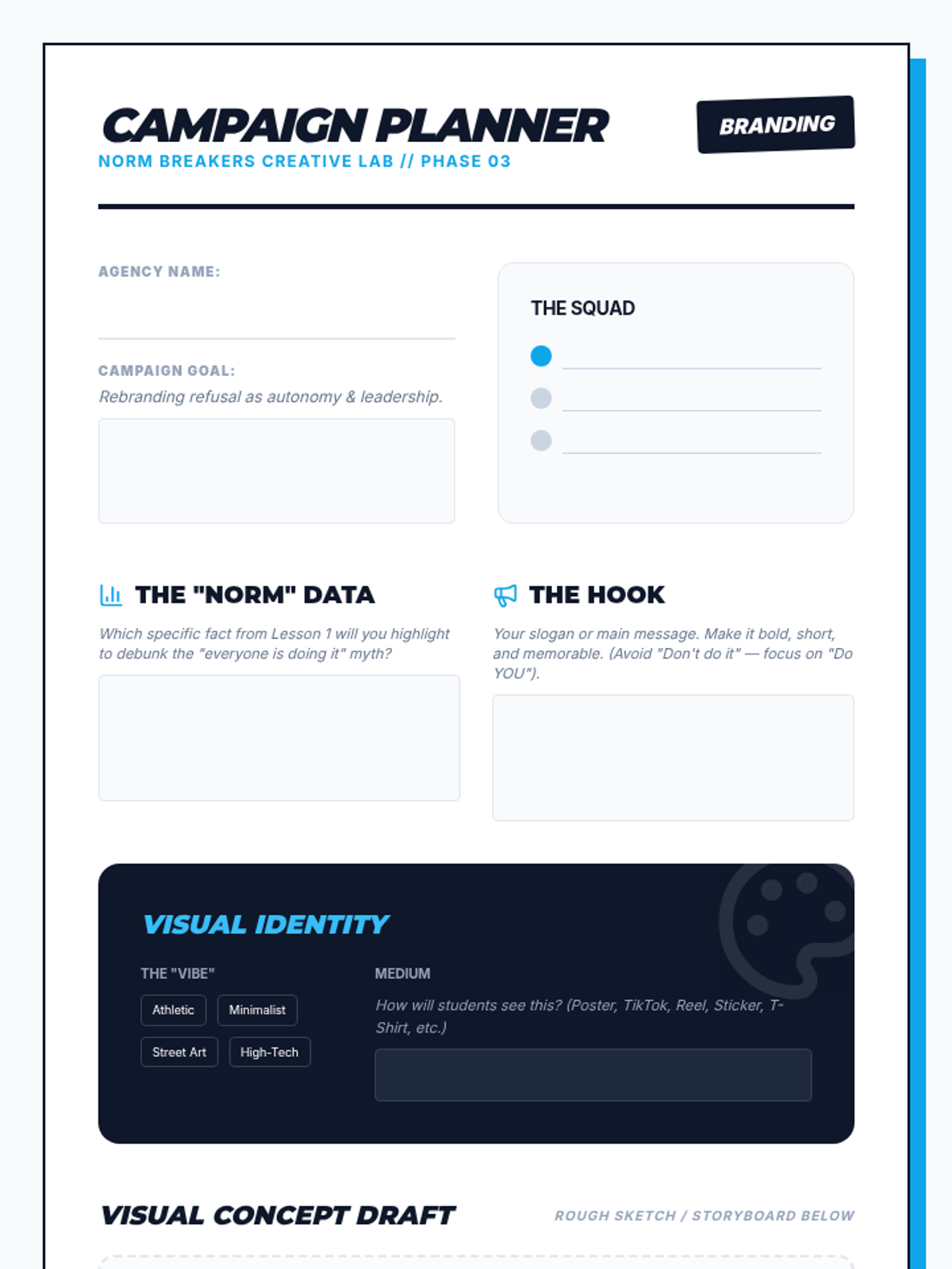 Students begin designing a 'Refusal Pro' campaign to rebrand refusal as a leadership trait. They explore persuasive messaging and creative design for posters or social media.