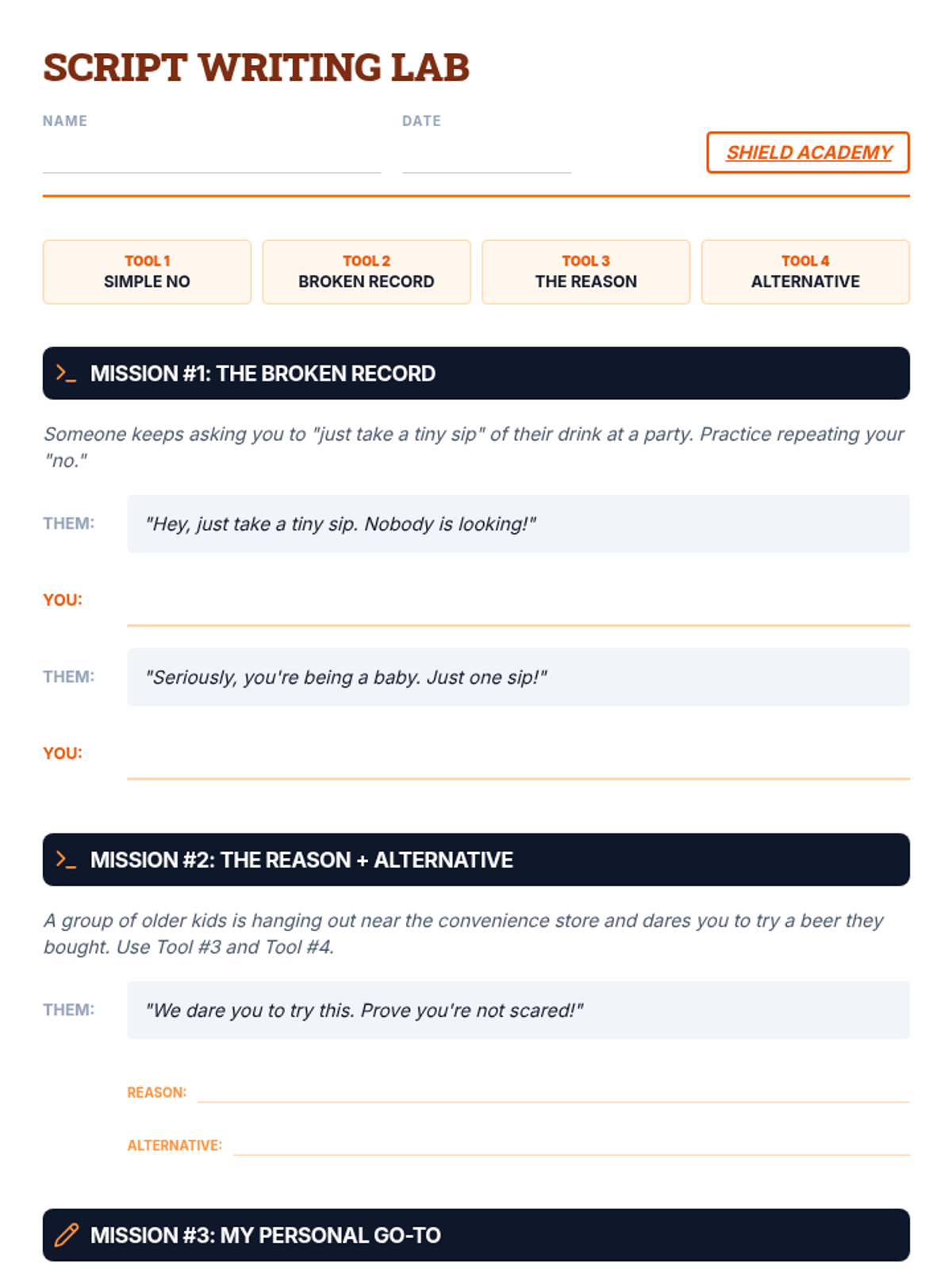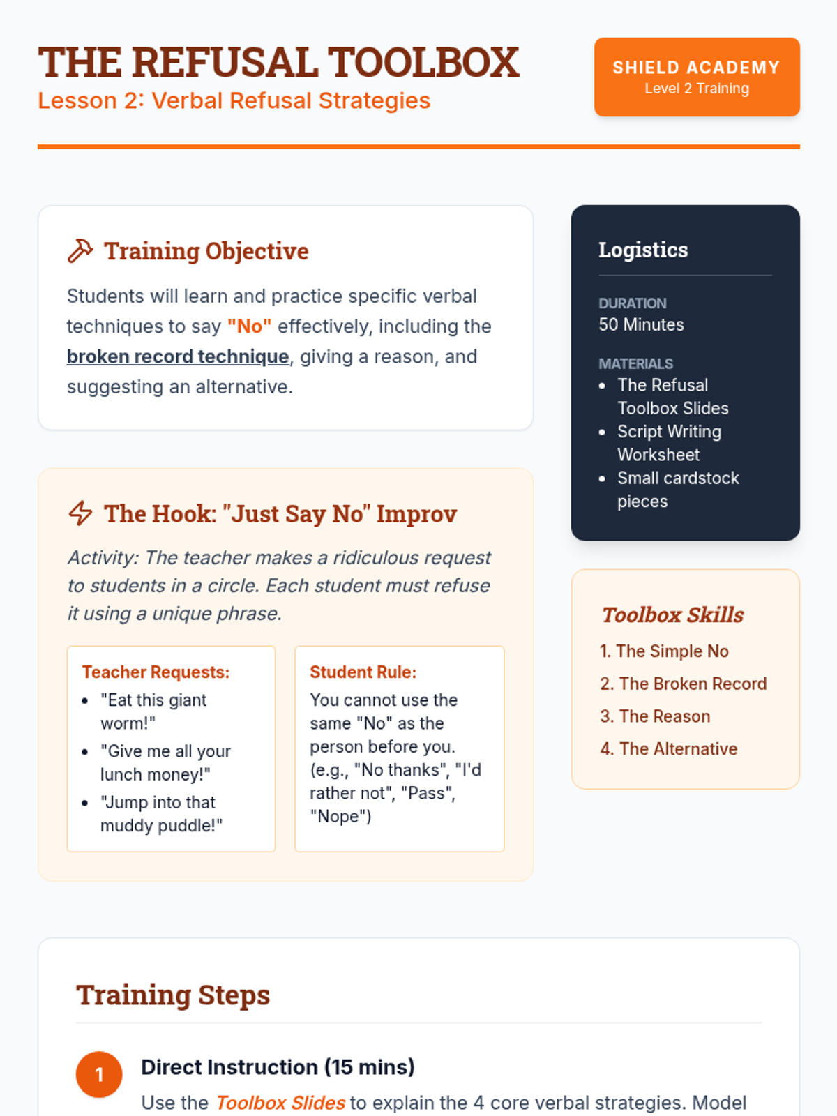 Students learn and practice specific verbal techniques to say 'no' effectively, including the broken record technique and suggesting alternatives.