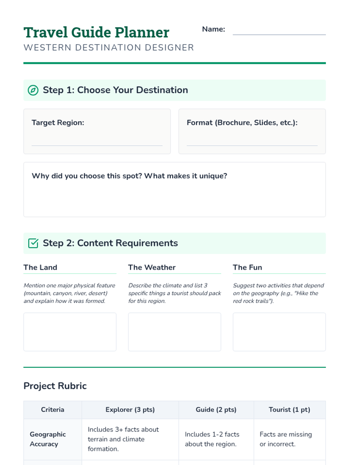 Students synthesize their learning by creating a persuasive travel guide for a specific area in the West or Southwest.