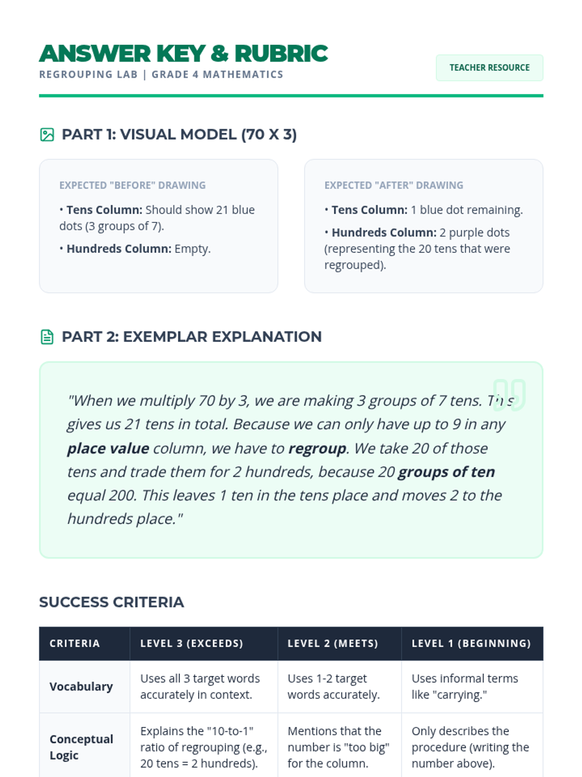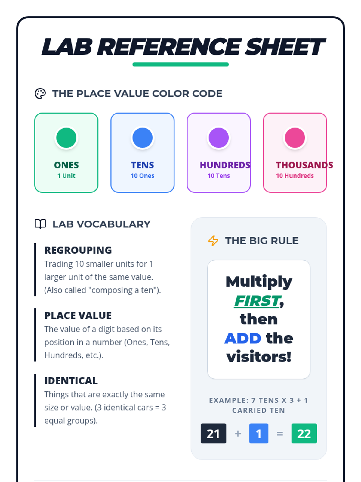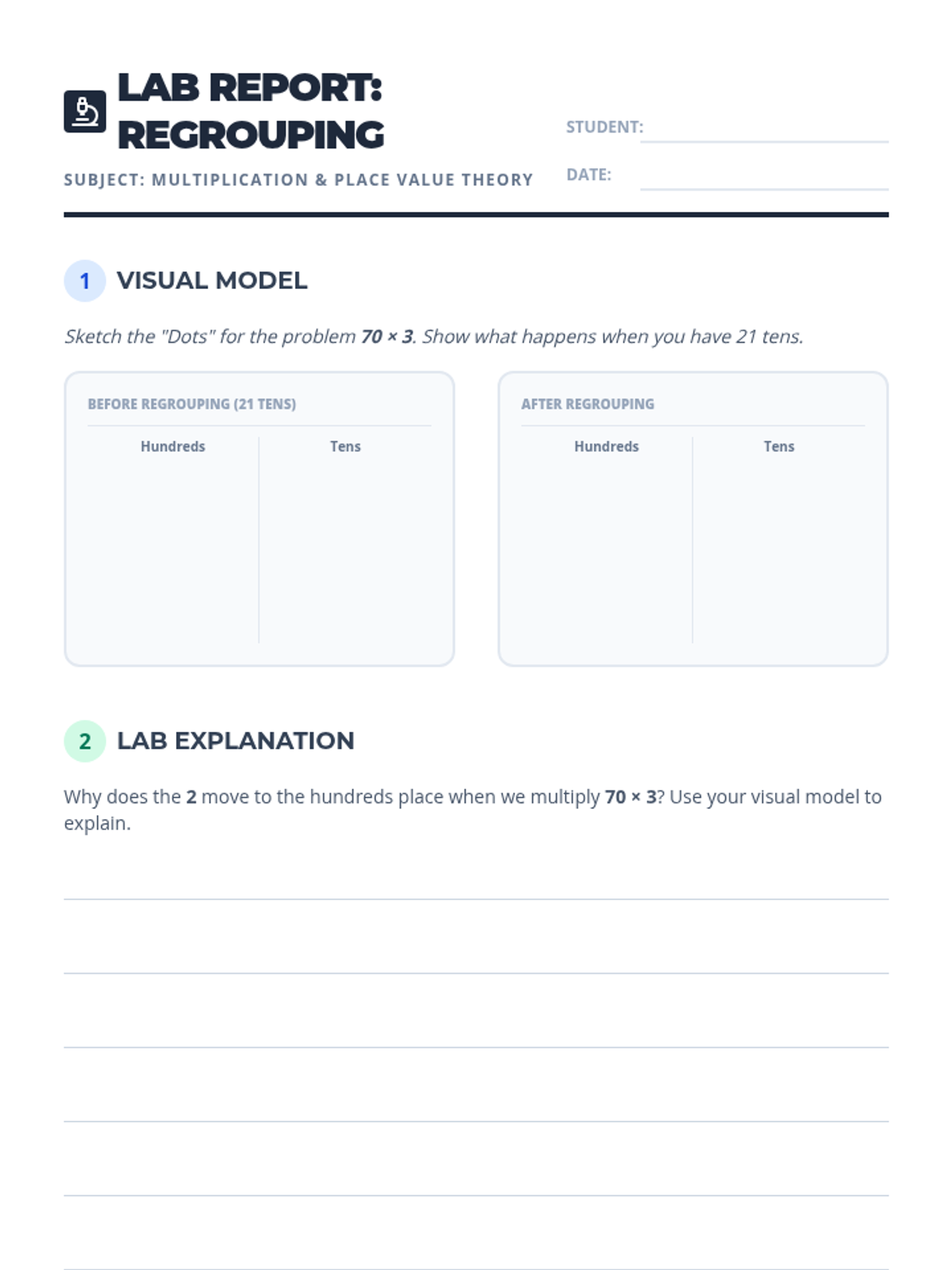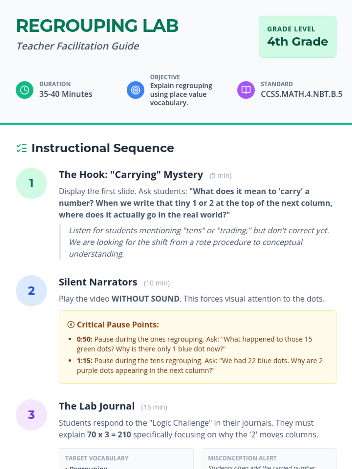 A conceptual deep dive into multi-digit multiplication where students use place value understanding to explain why we regroup numbers. Students will watch a silent animation of place value dots shifting columns to build a mental model of the traditional algorithm.