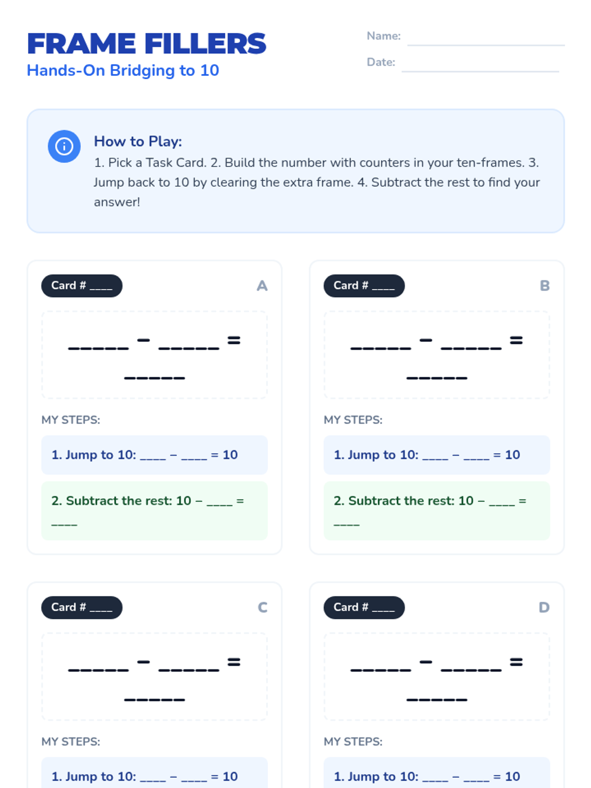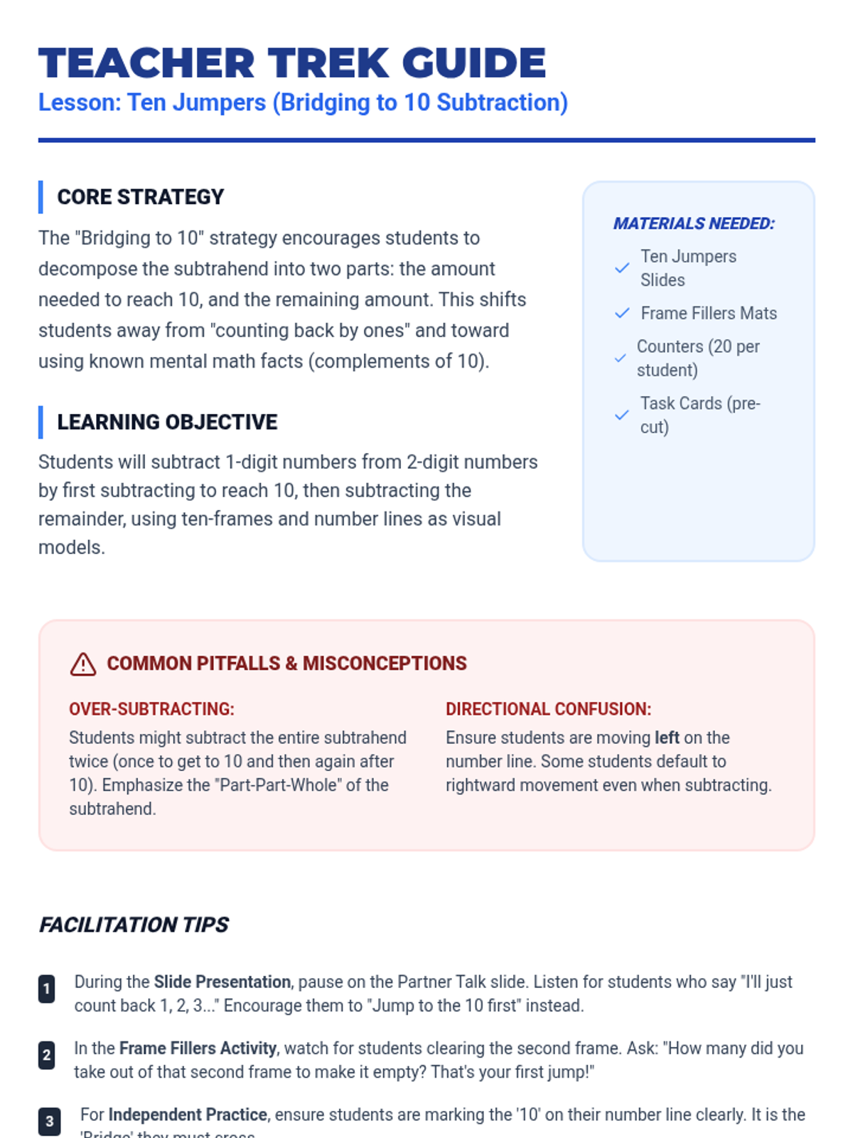 A 2nd-grade lesson focused on the 'bridging to 10' strategy for subtraction, using ten-frames and number lines to decompose subtrahends and simplify calculations.
