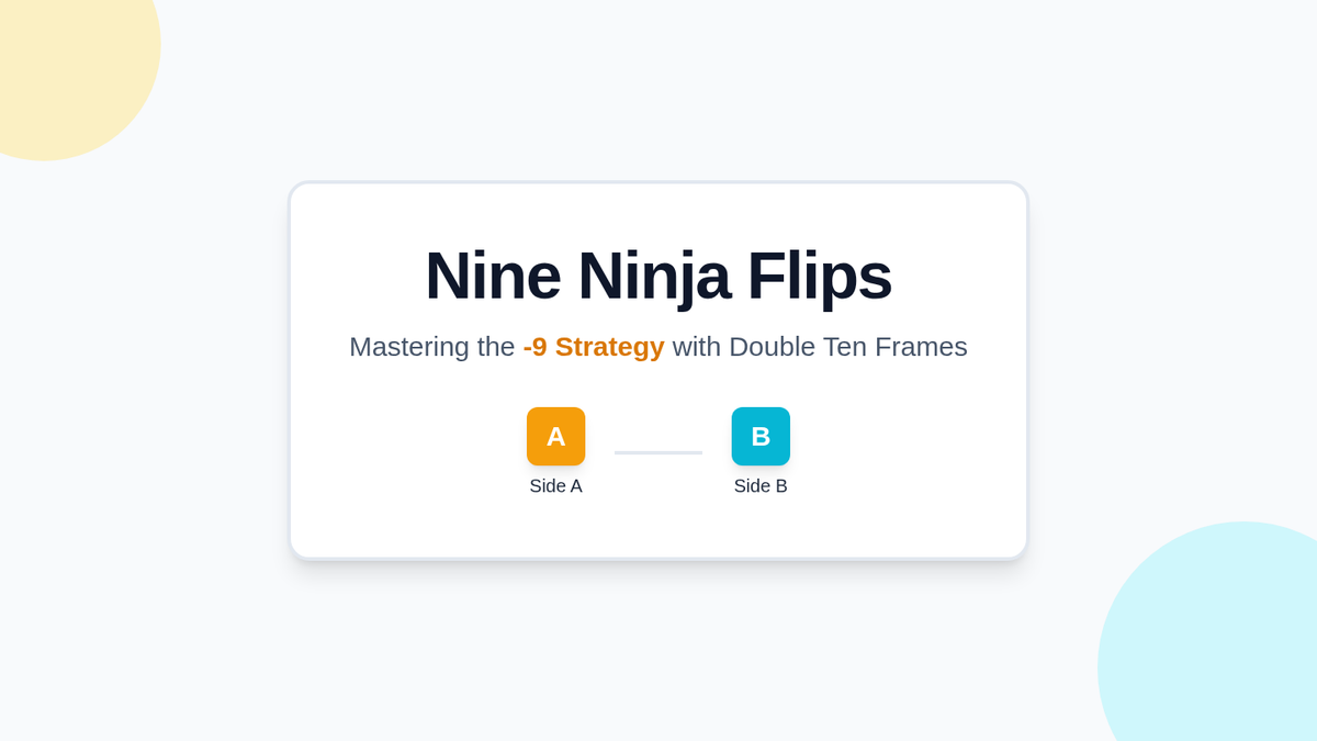 A mental math sequence using double ten frames to master the -9 strategy (subtract 10, add 1). Students use visual relationships to build fluency in the 9-20 range.