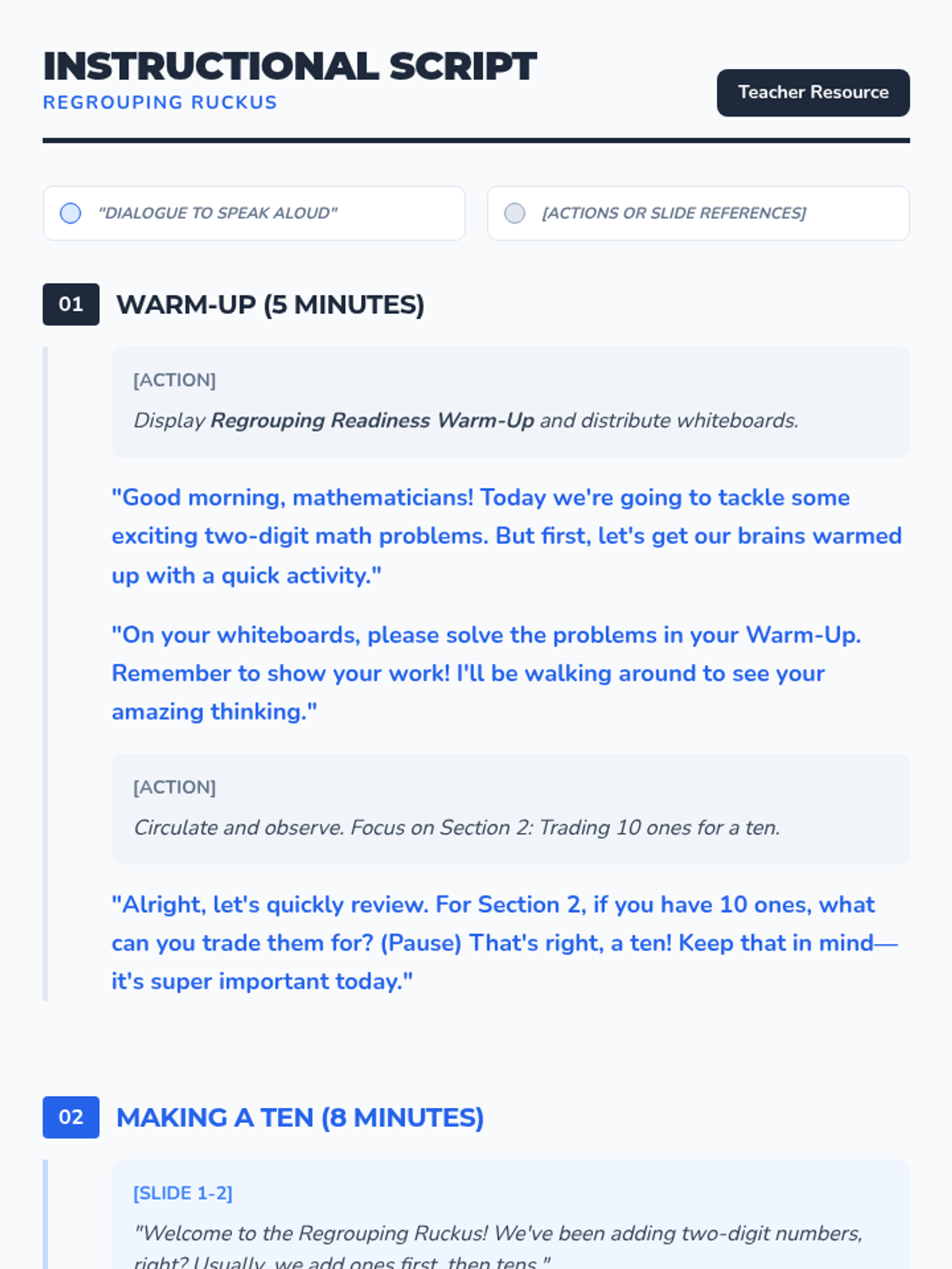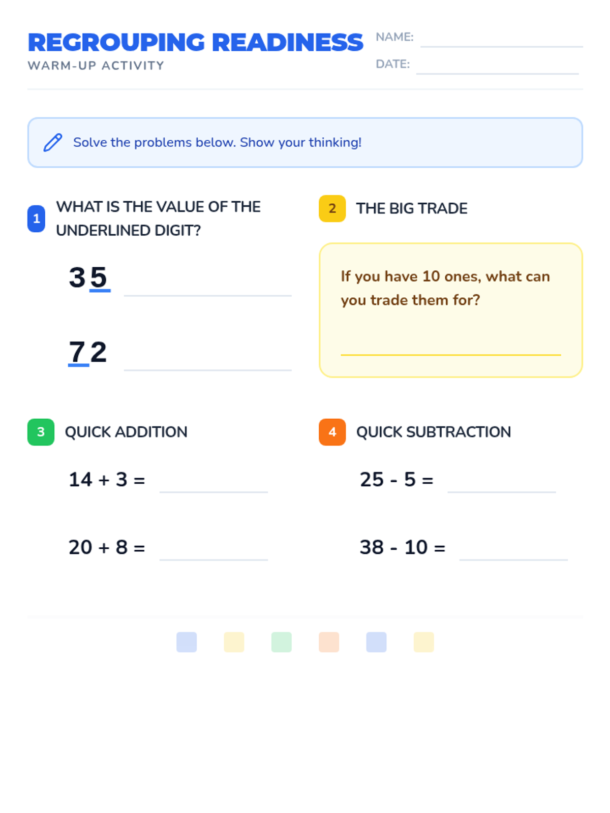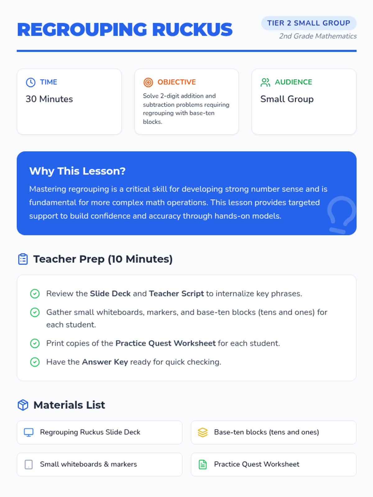 A 30-minute small-group lesson for 2nd graders focusing on two-digit addition and subtraction with regrouping using base-ten visual models.