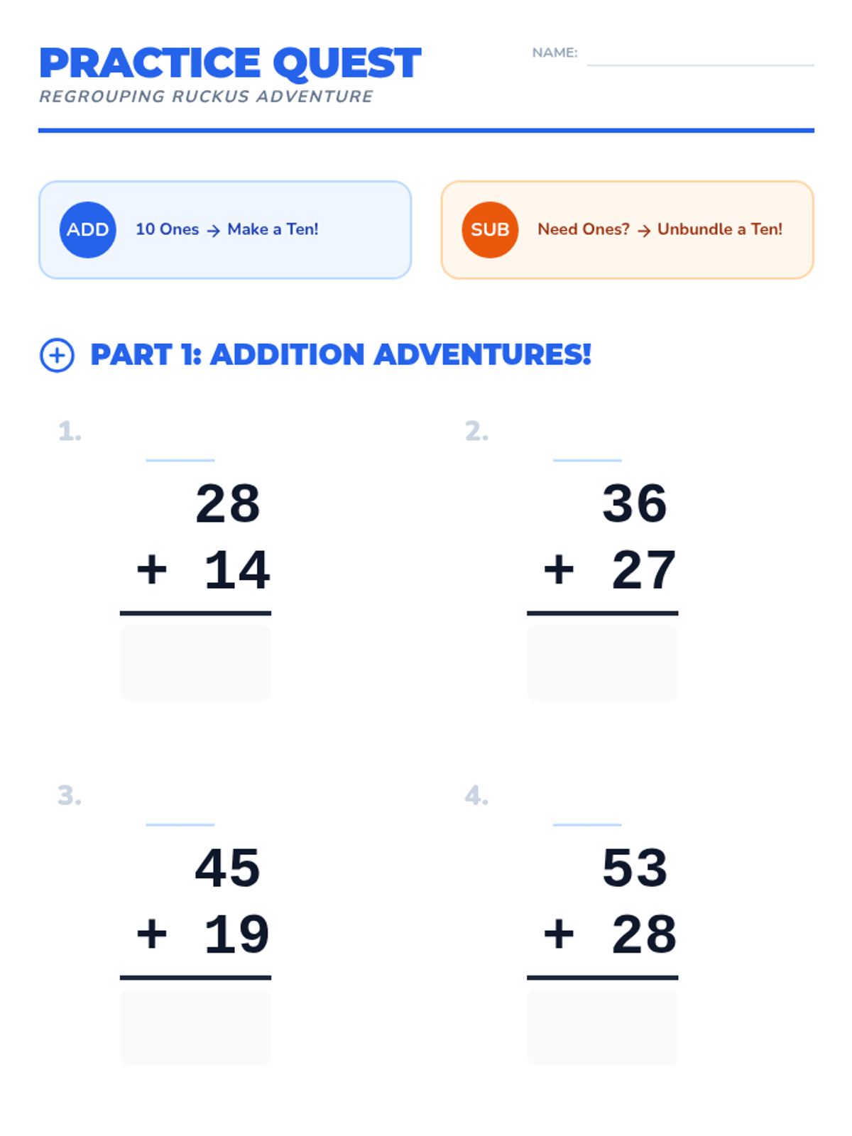 A collection of flashcards and activities designed to master two-digit and one-digit addition without regrouping, featuring a retro video game theme.