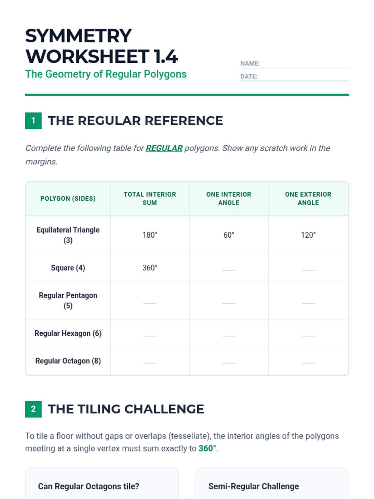 Calculating individual interior and exterior angles of regular polygons and understanding their symmetry.