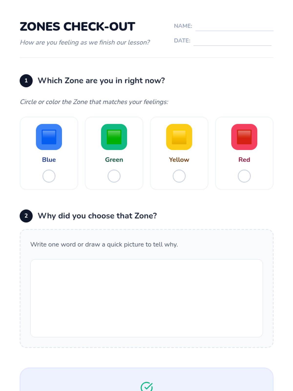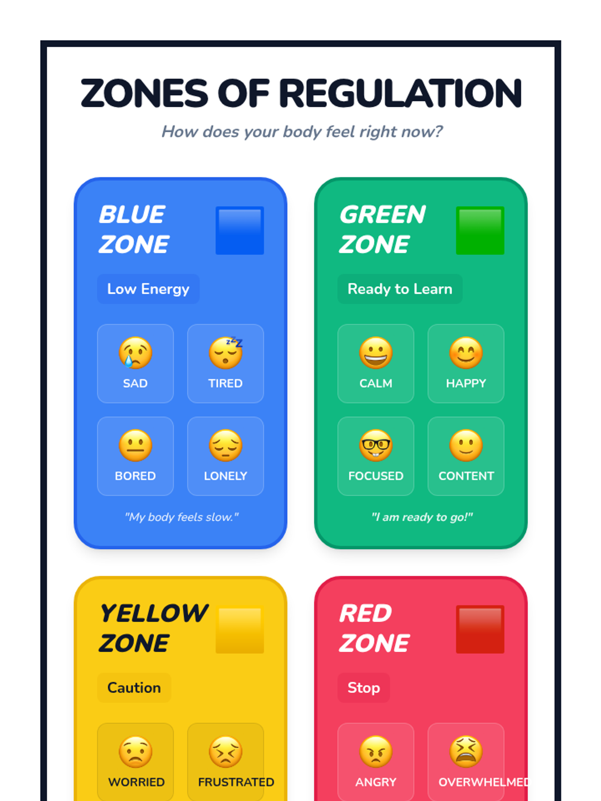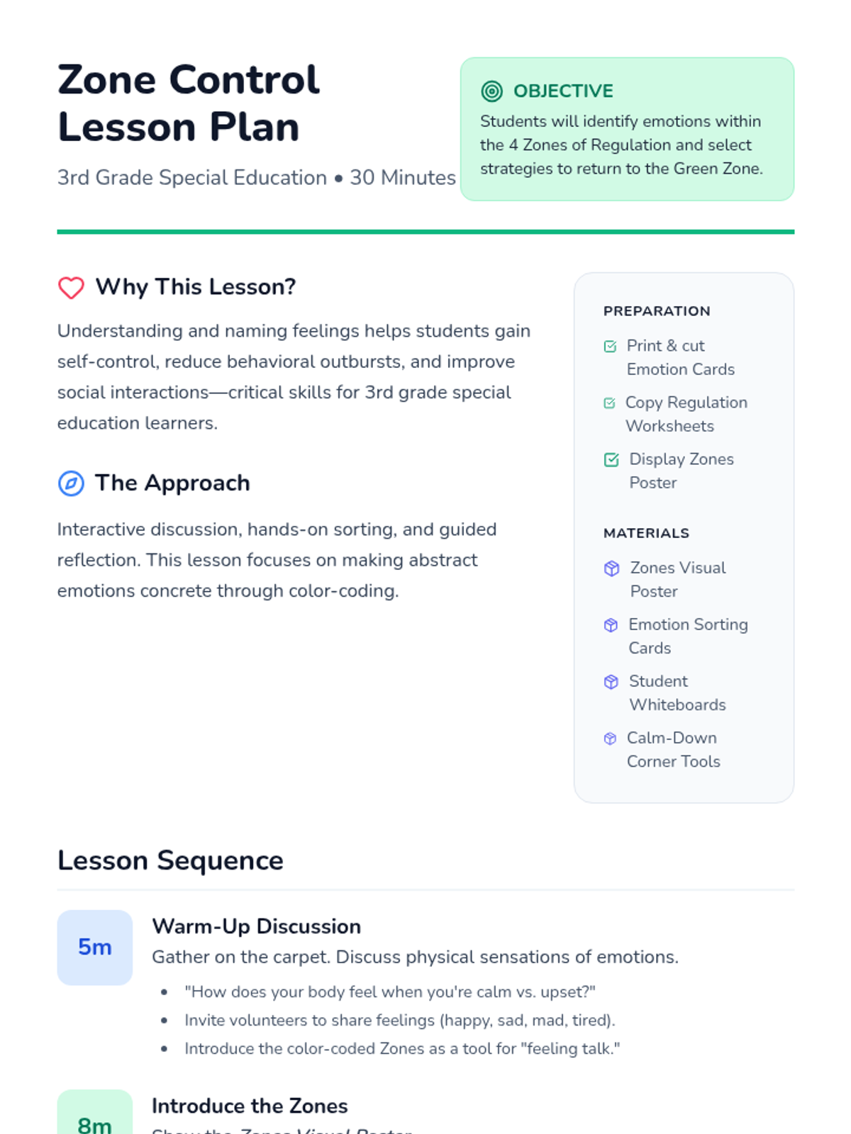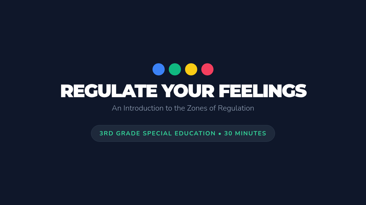 A 30-minute introductory lesson for 3rd grade special education students to learn the Zones of Regulation framework, identify their emotions, and develop self-regulation strategies.
