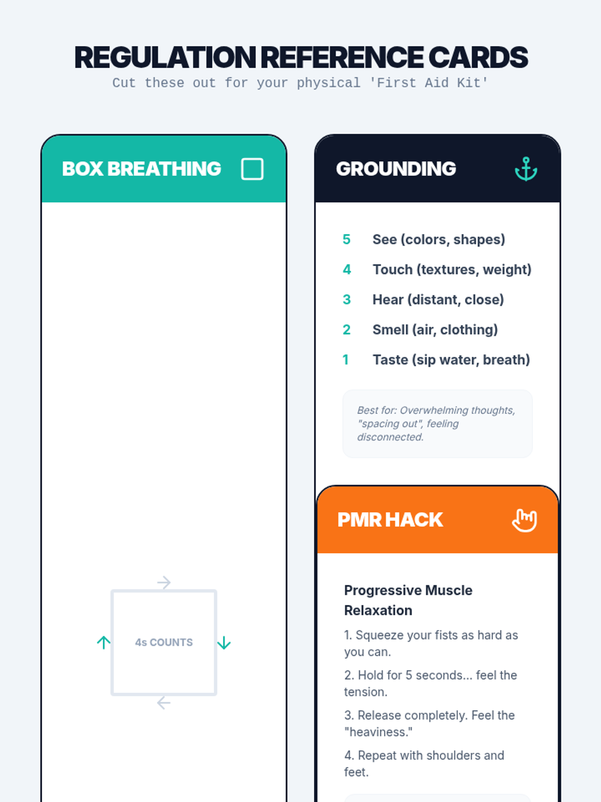 Practice and evaluate physical stress reduction methods including box breathing, progressive muscle relaxation, and sensory grounding.