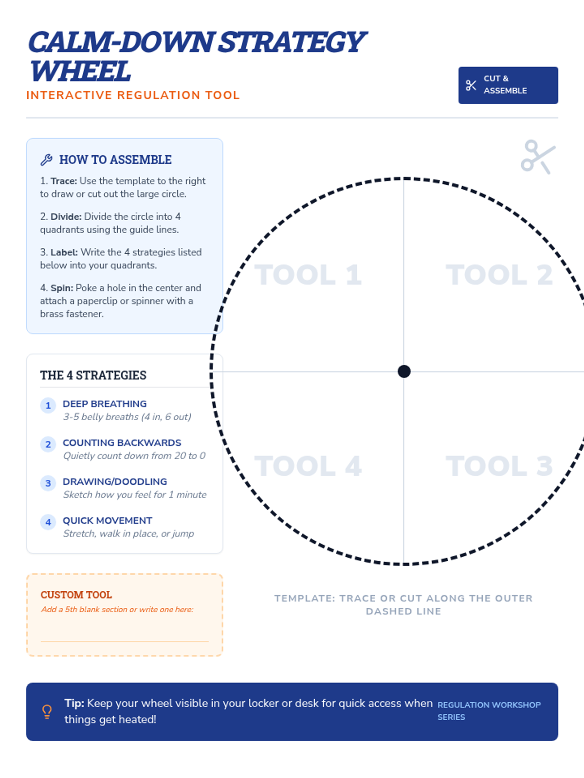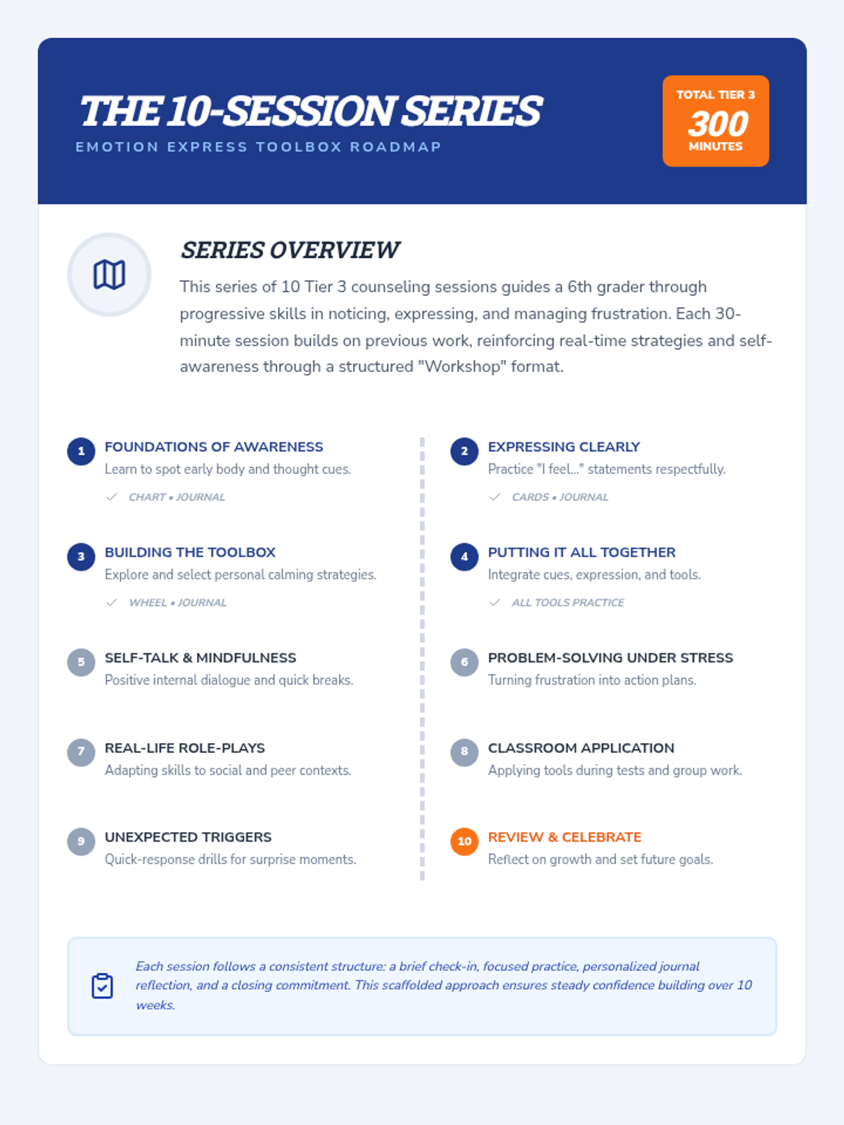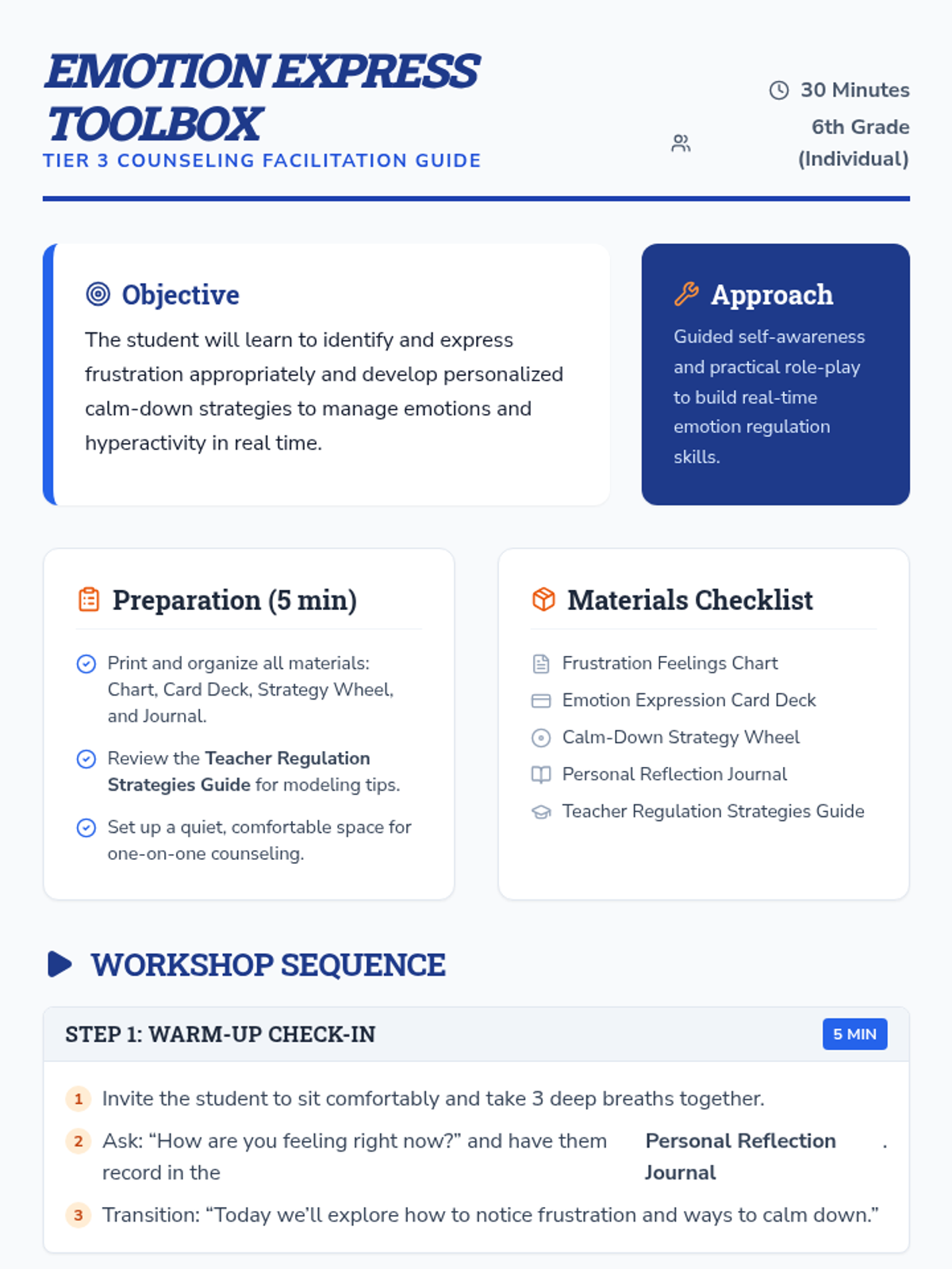 A 30-minute foundational counseling session where students identify physical frustration cues, practice 'I feel' statements, and select personalized coping strategies.