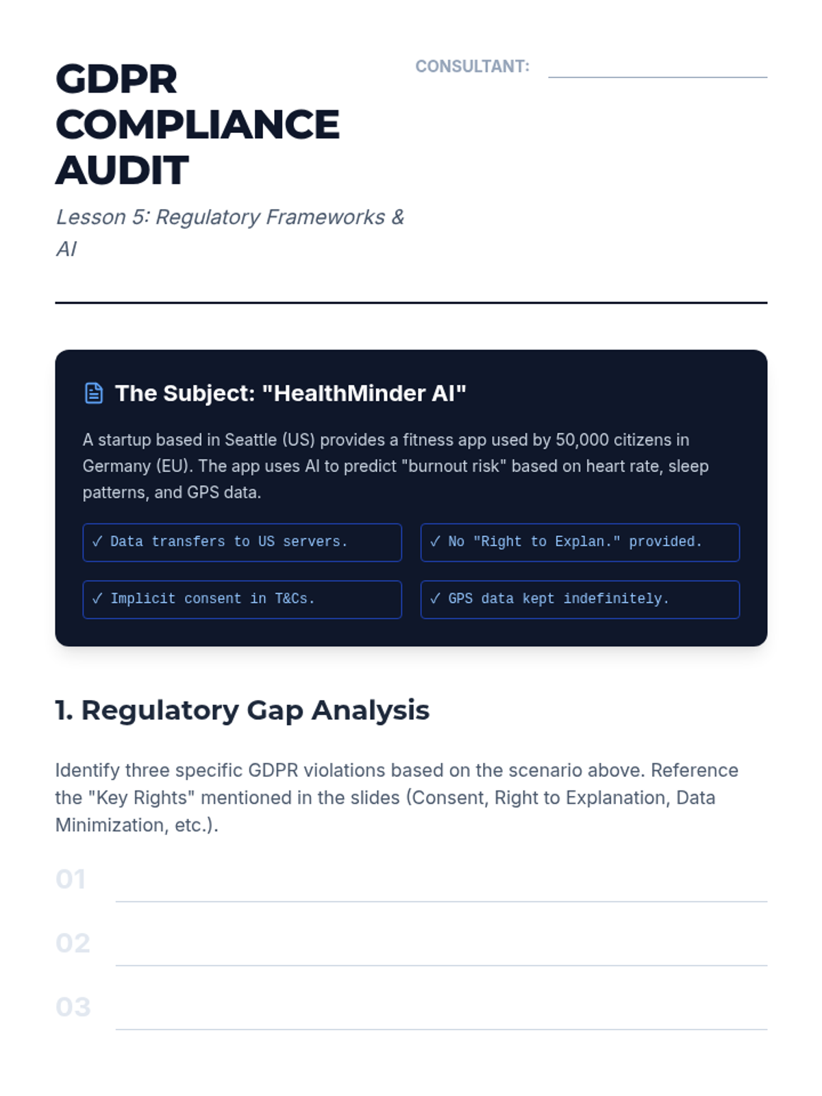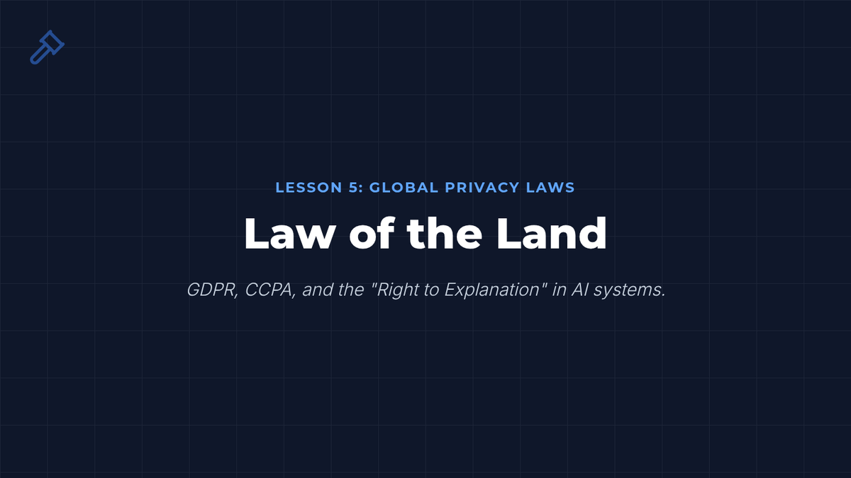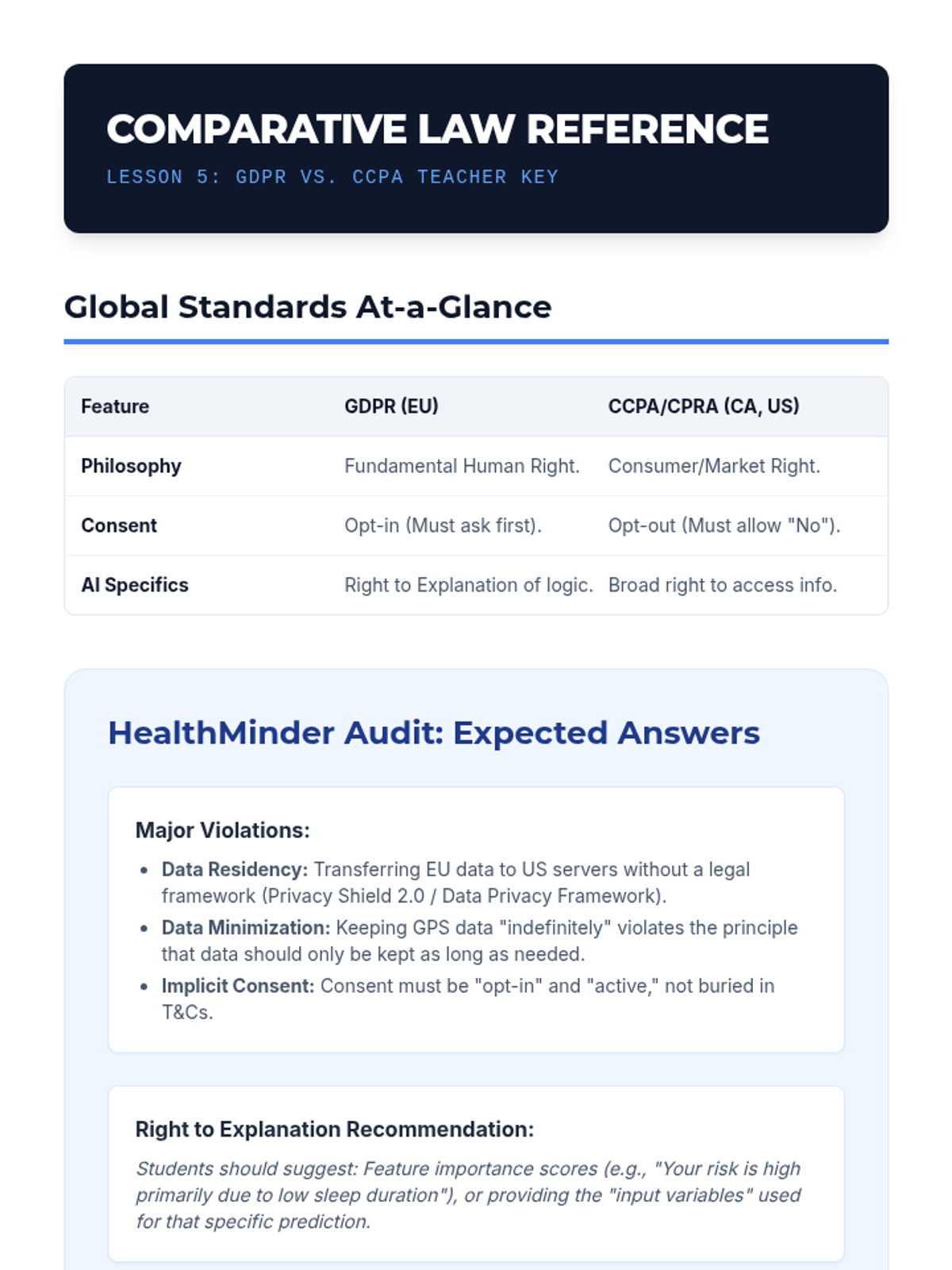 Students compare major legal frameworks like the GDPR and CCPA, analyzing the 'Right to Explanation' and the 'Right to be Forgotten' in the context of AI.