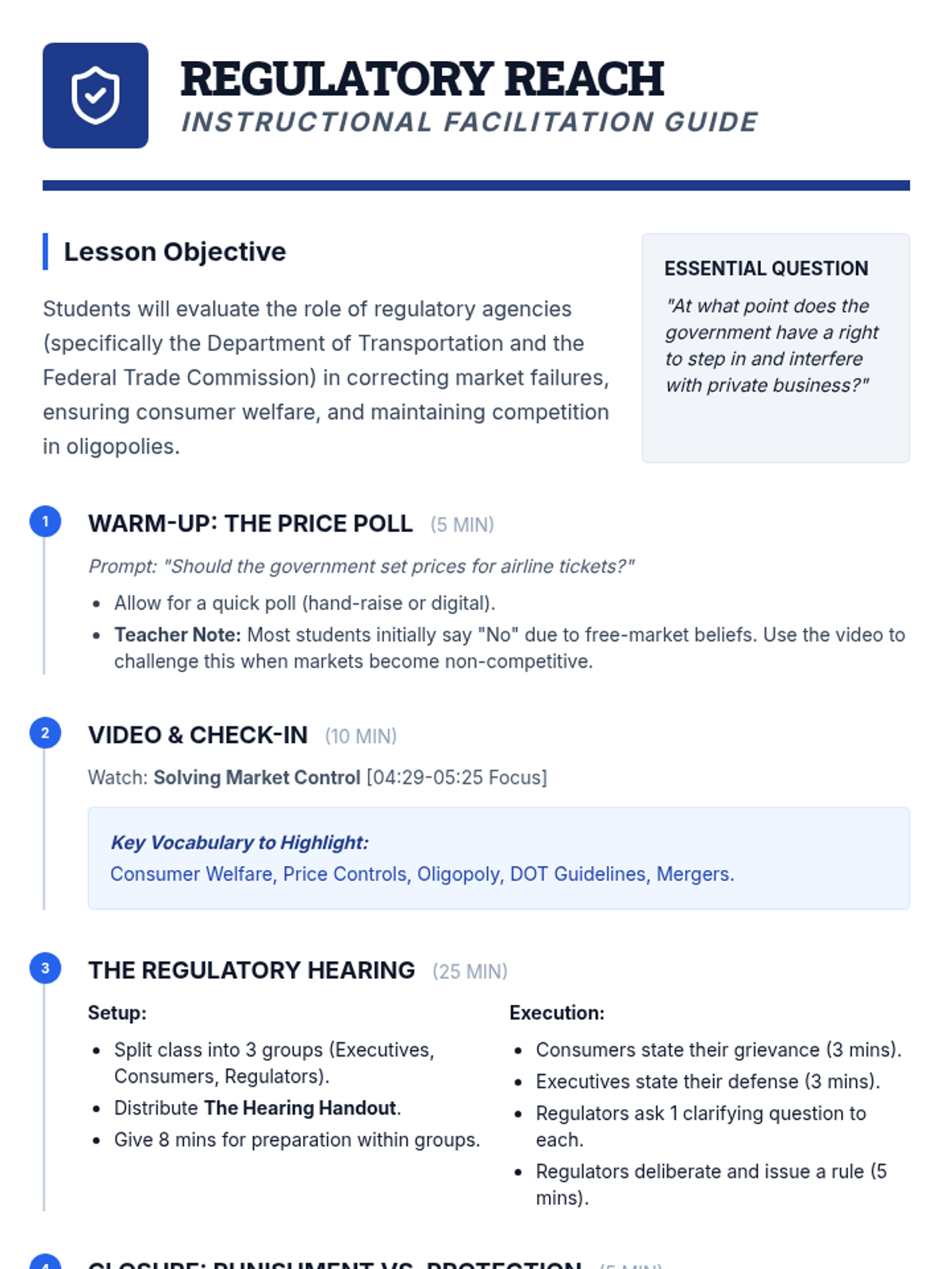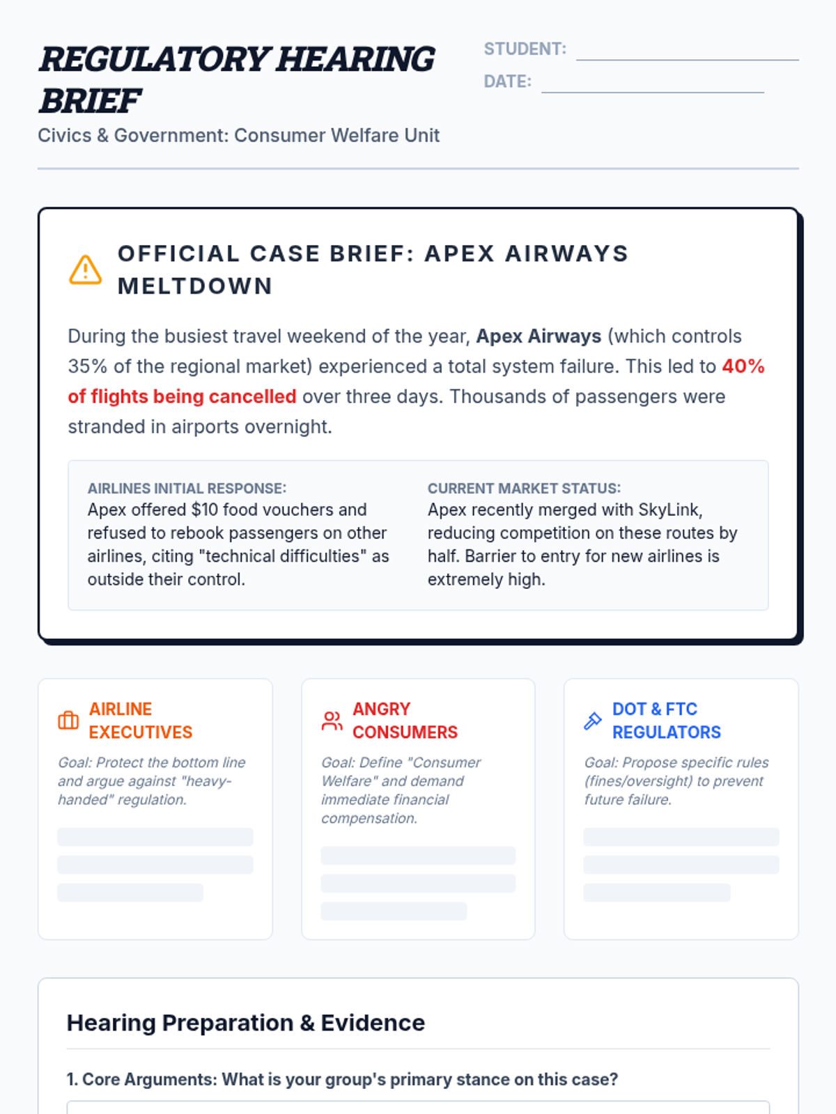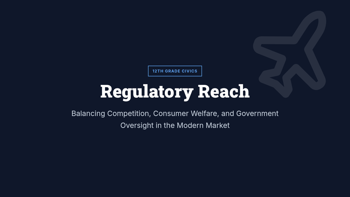 A 12th-grade Civics lesson exploring government regulation through the lens of the airline industry. Students analyze the roles of the DOT and FTC, watch a targeted video on market controls, and engage in a mock regulatory hearing to balance corporate interests with consumer protection.