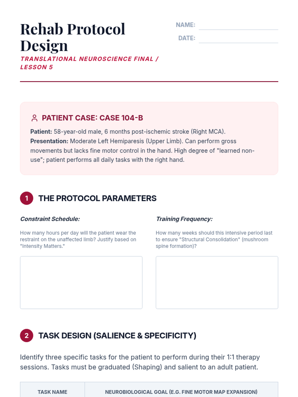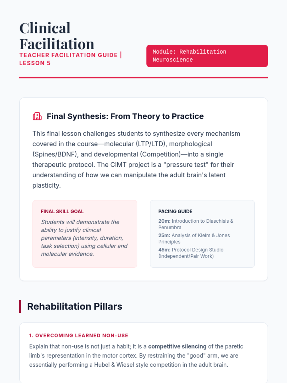 The final lesson applies plasticity principles to stroke and TBI recovery. Students design a Constraint-Induced Movement Therapy (CIMT) protocol, justifying the schedule based on synaptic competition rules.
