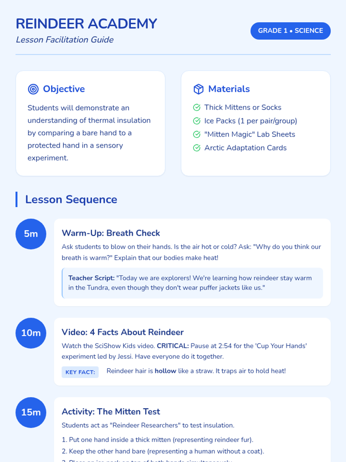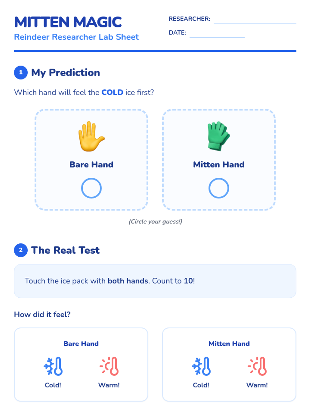 Students explore thermal insulation through a sensory experiment and the SciShow Kids video '4 Facts to Know About Reindeer'. They conduct the 'Mitten Test' to understand how reindeer adaptations like hollow fur keep them warm in the freezing Tundra.