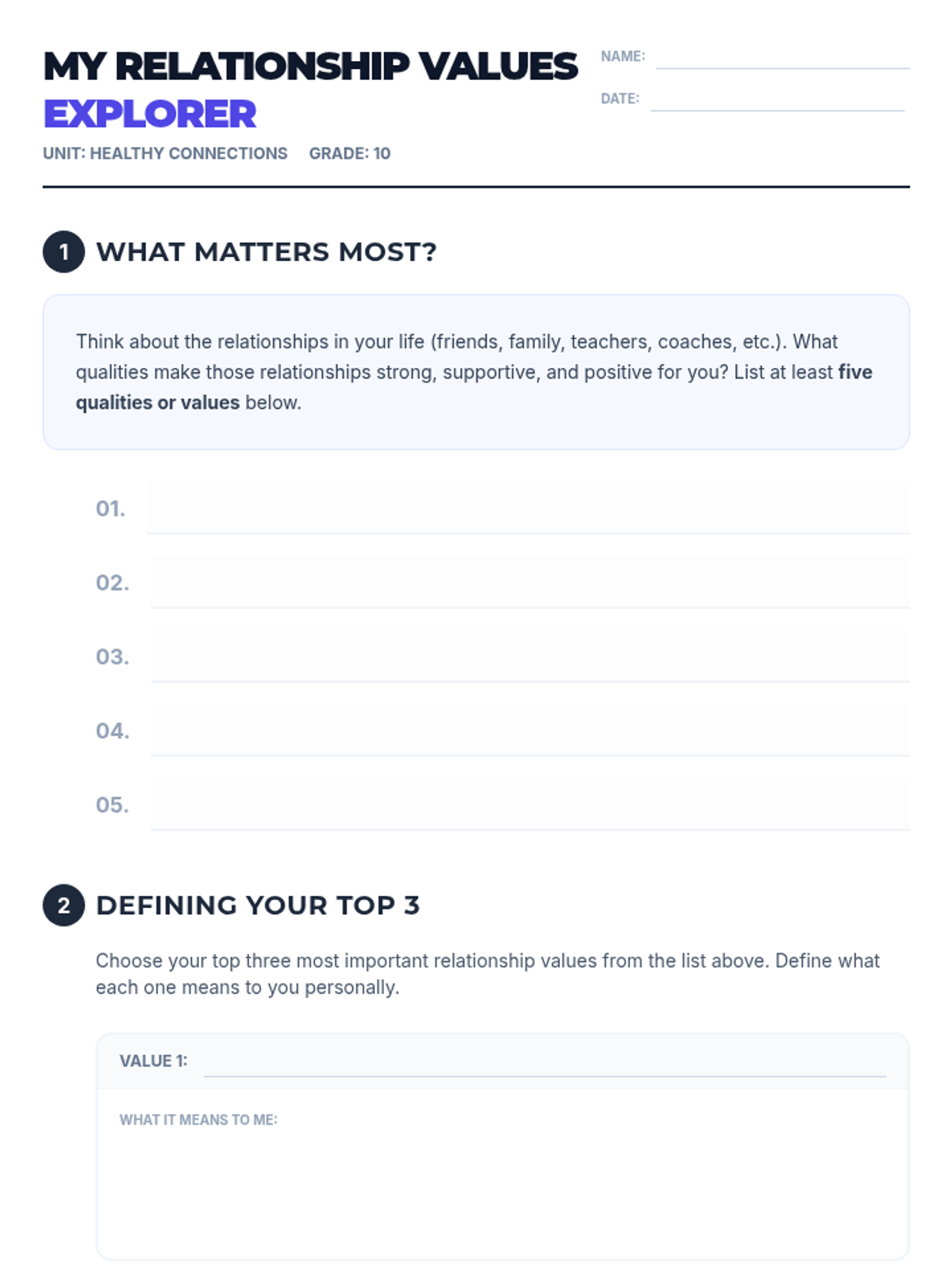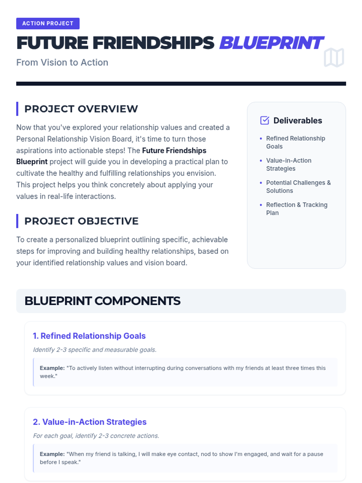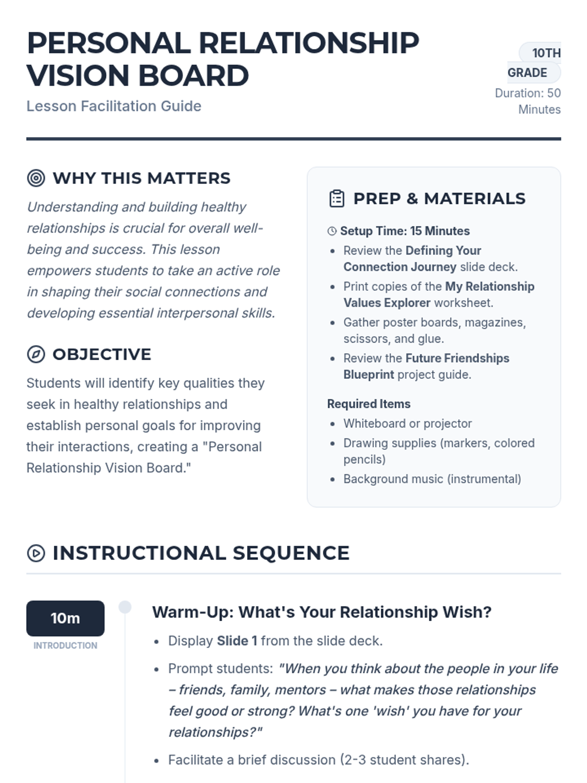 This lesson empowers 10th-grade students to identify their relationship values and create a visual representation of their ideal social connections through a Personal Relationship Vision Board and a strategic project blueprint.
