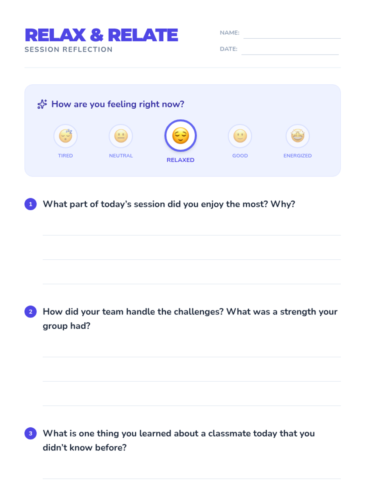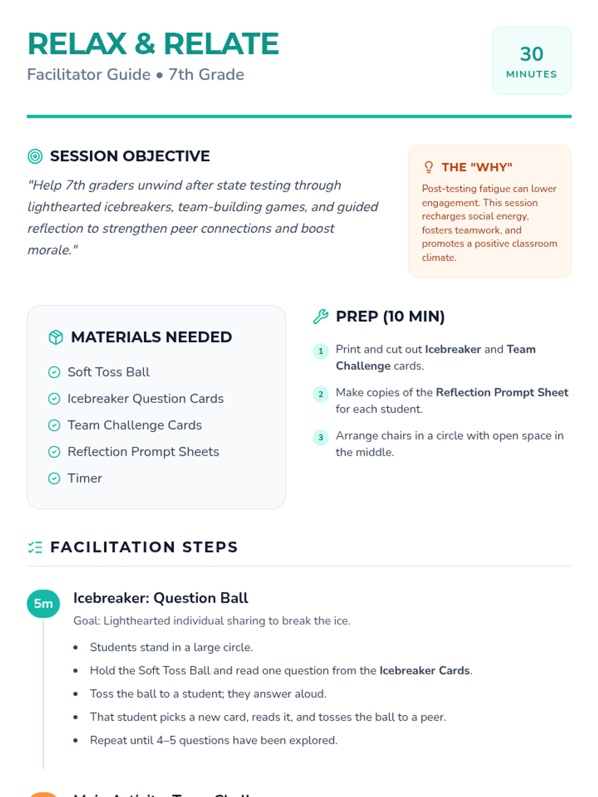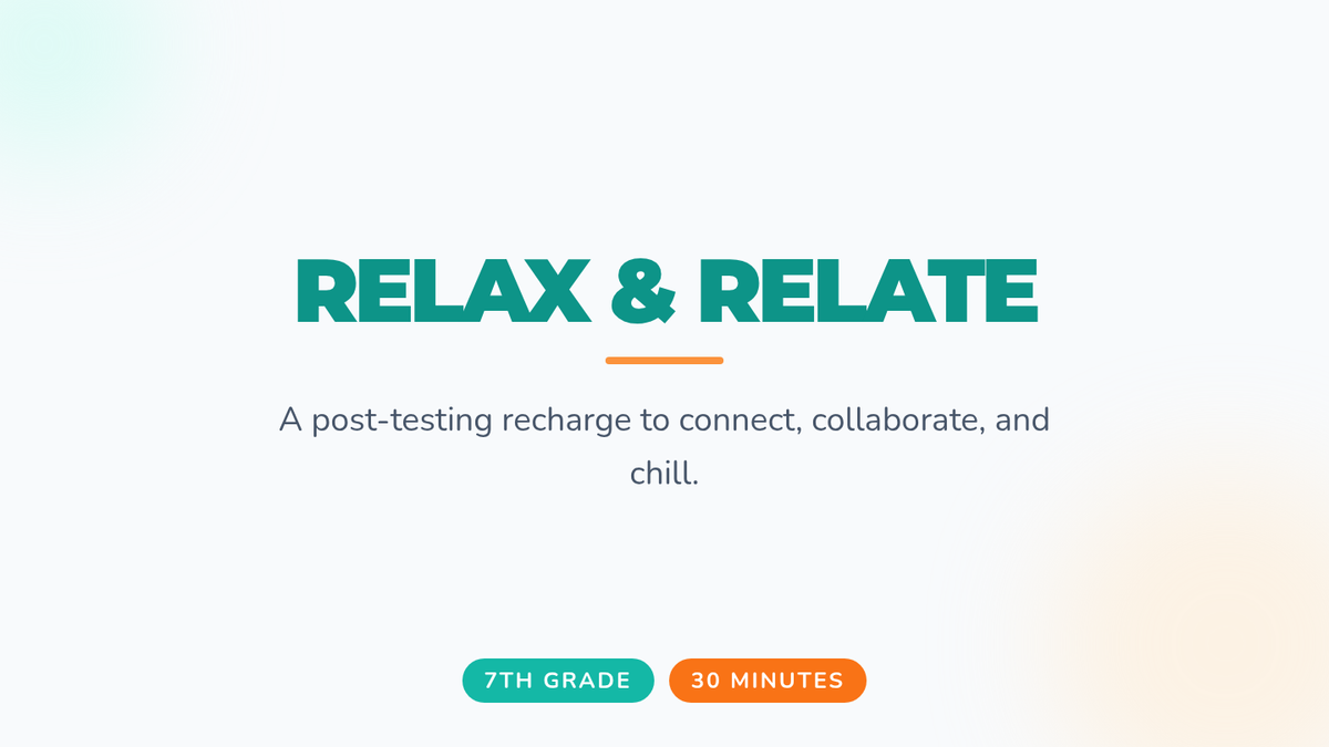 A one-session social skills workshop for 7th graders to recharge after state testing through games, team challenges, and reflection.