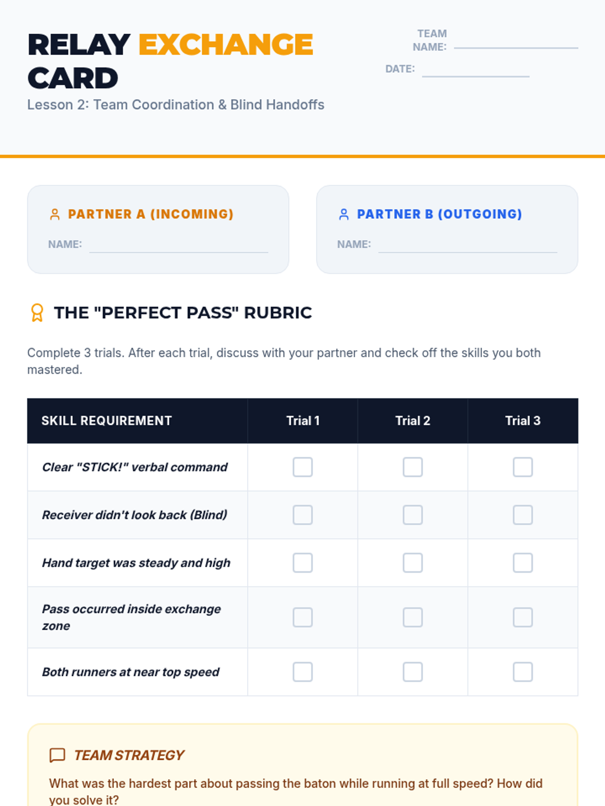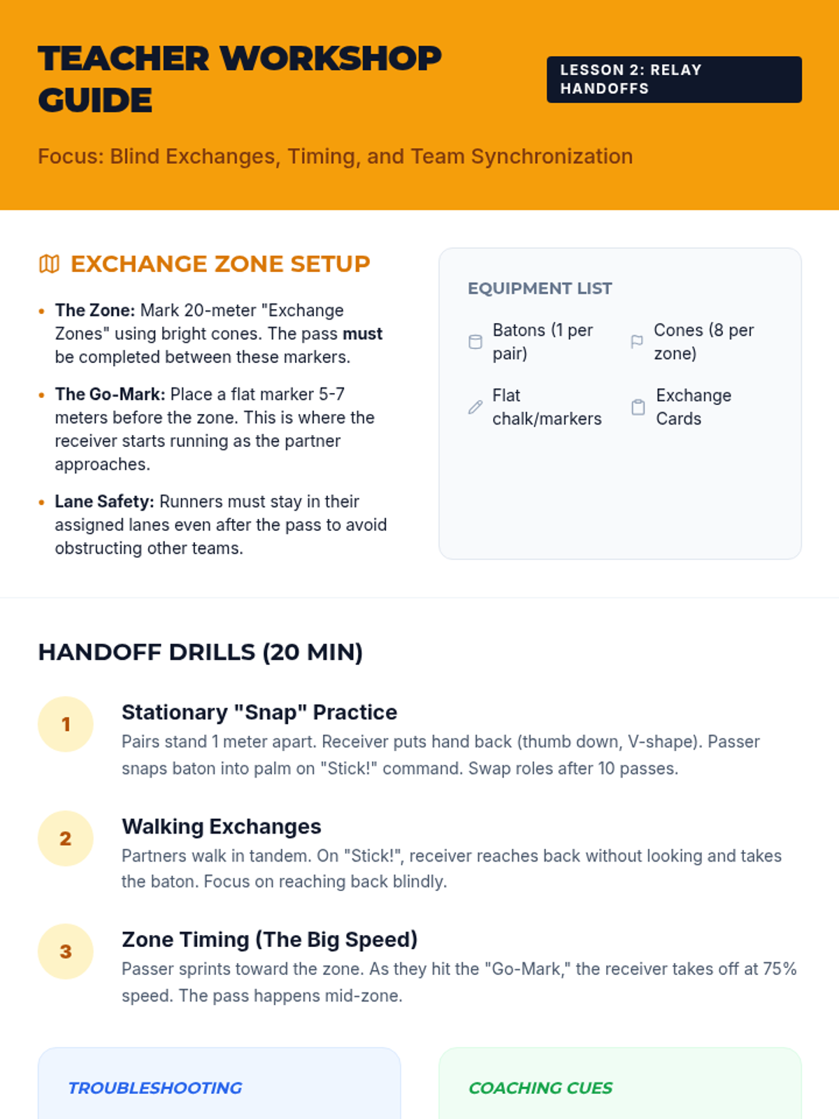 Learners focus on the technical and social aspects of relay racing, specifically the 'blind' baton pass and exchange zone timing.